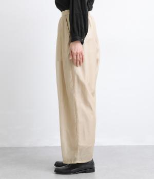 丸みのあるラインが印象的な、コクーンシルエットのカーブパンツです。腰まわりはすっきりと整え、タックが生み出すゆるやかな立体感が、こなれた印象を演出します。シンプルなトップスと合わせるだけで、洗練されたコーディネートが完成する一着です。