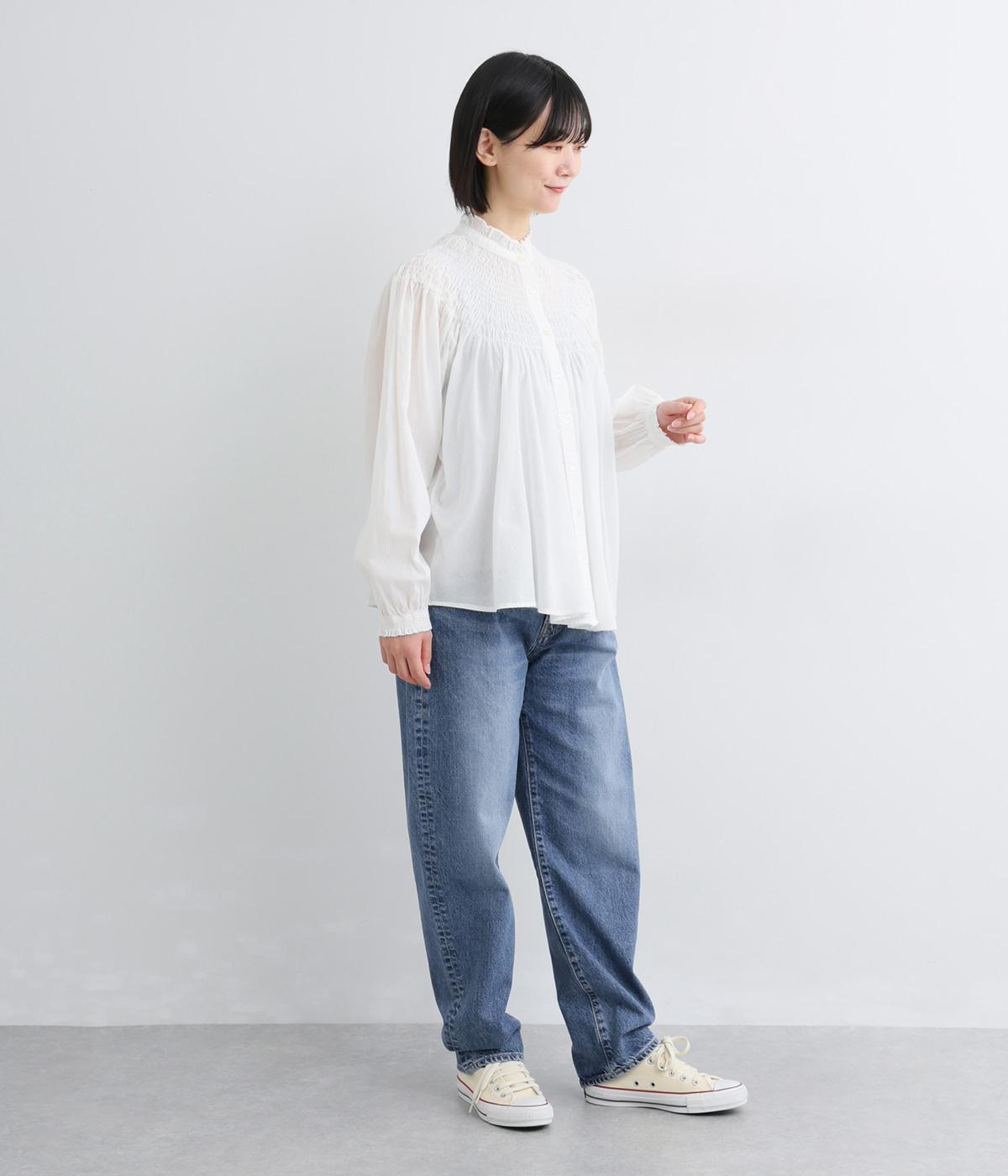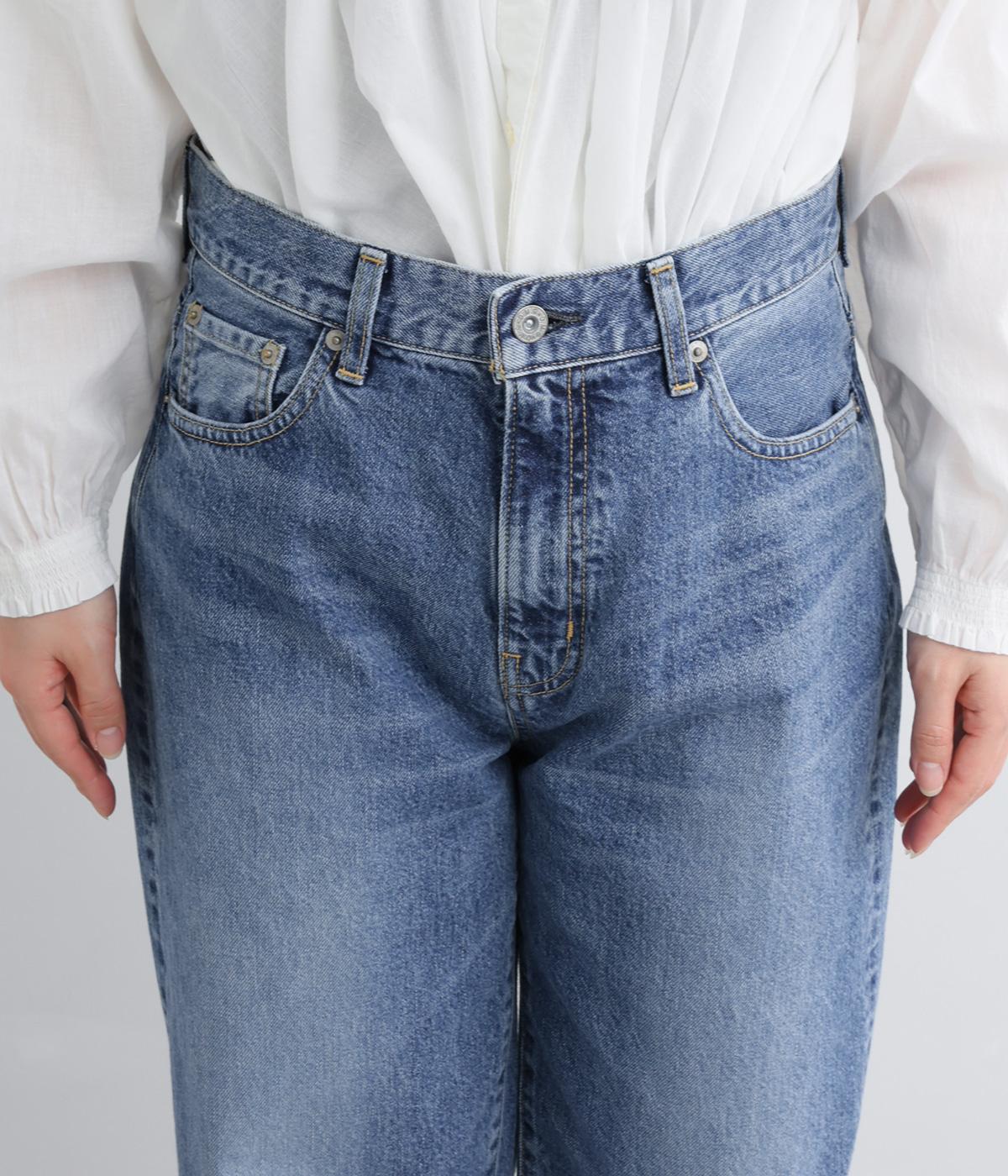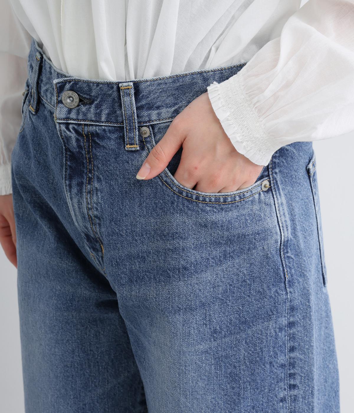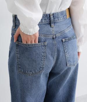 ほどよい厚みを持つコットンデニム素材を使用しています。ナチュラルな風合いとしっかりした質感があり、履くほどに体になじむ心地よさが魅力です。