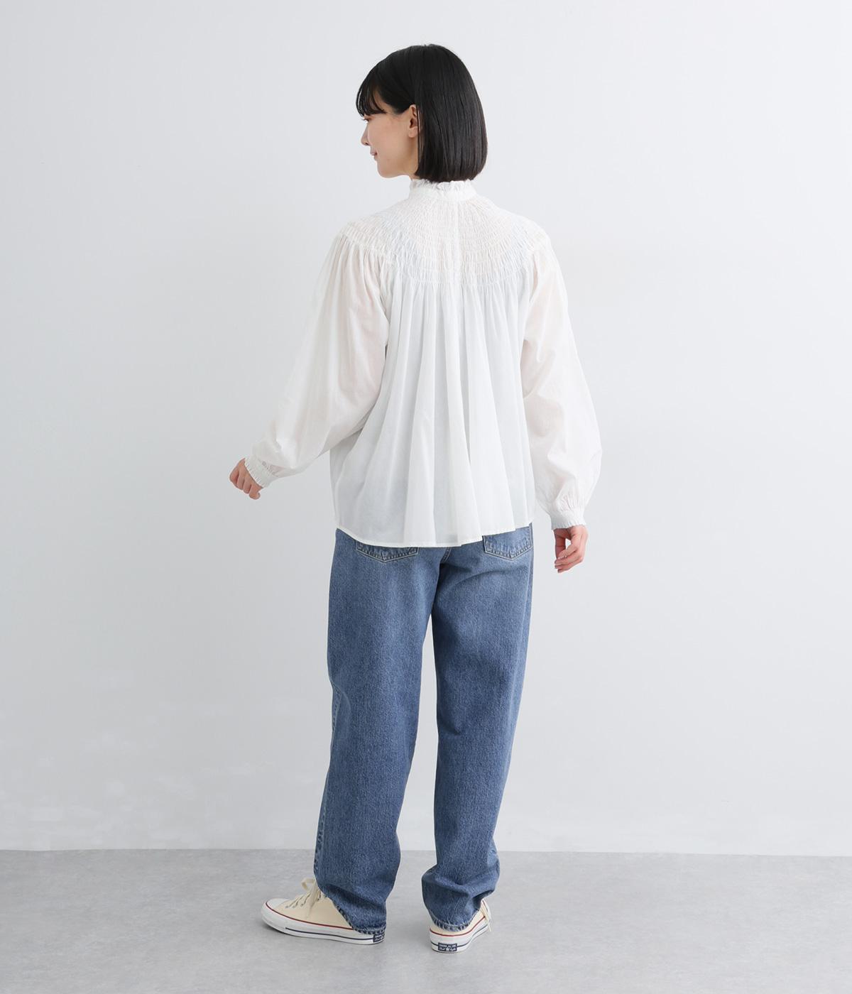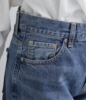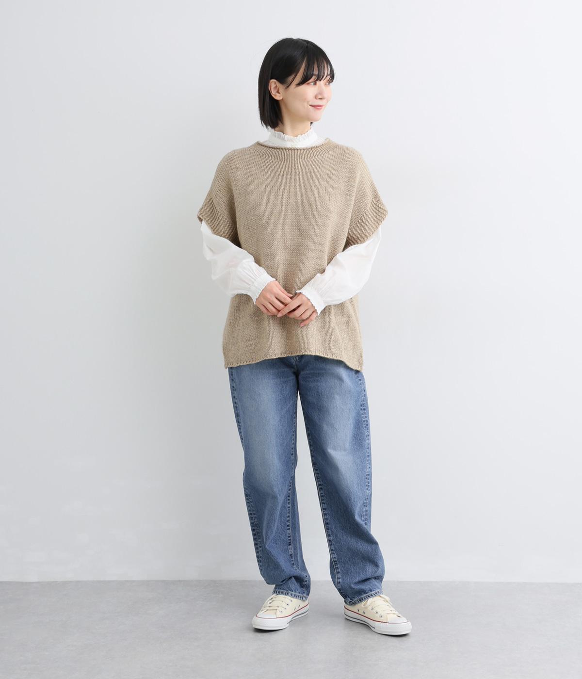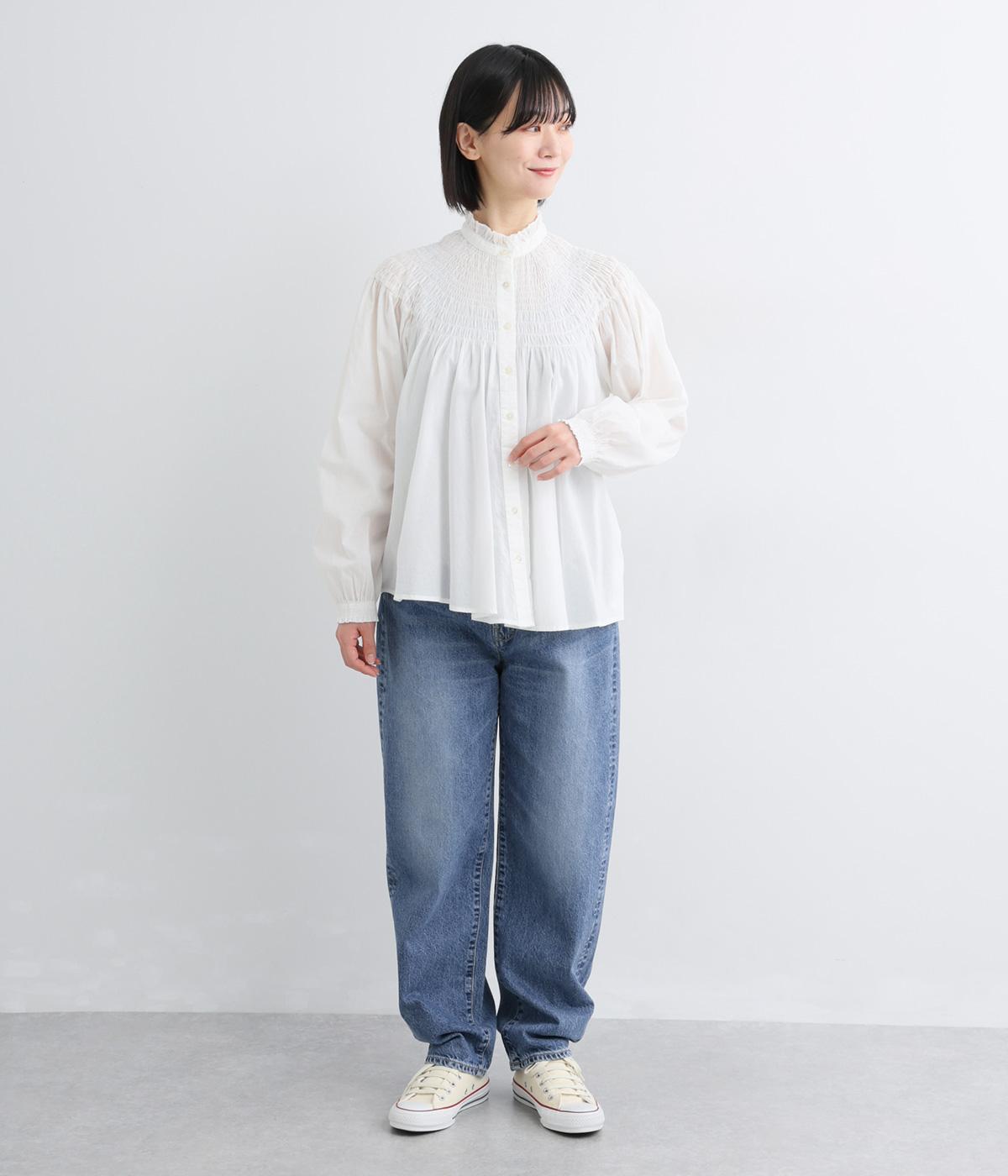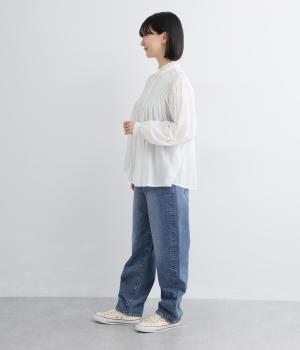 ほどよい厚みを持つコットンデニム素材を使用しています。ナチュラルな風合いとしっかりした質感があり、履くほどに体になじむ心地よさが魅力です。