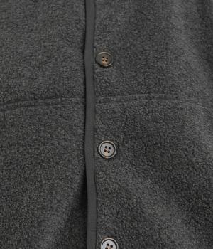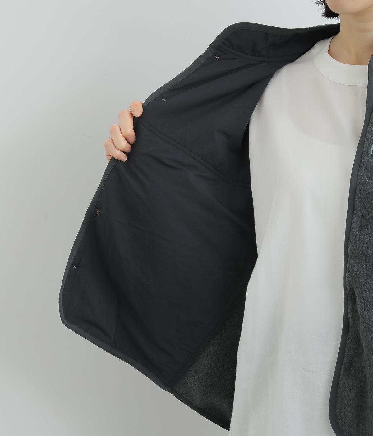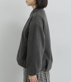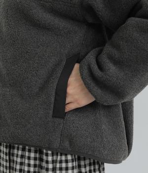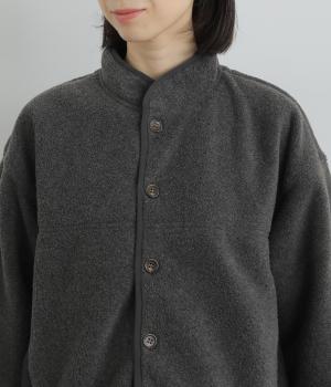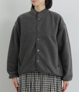 たっぷりと空気を含んだあたたかくて軽いフリース生地です。つい撫でたくなるようなやわらかな心地よい表面感が魅力。前身頃や襟にさらりとしたナイロンの裏地をつけています。