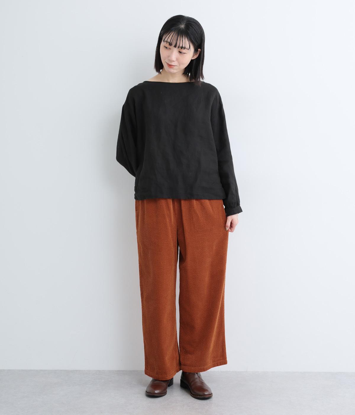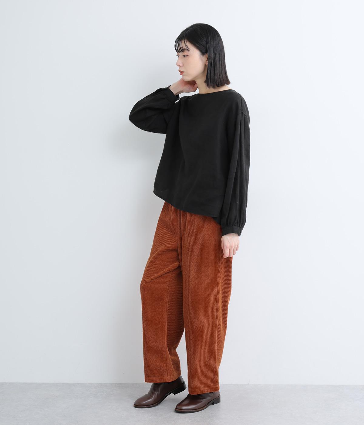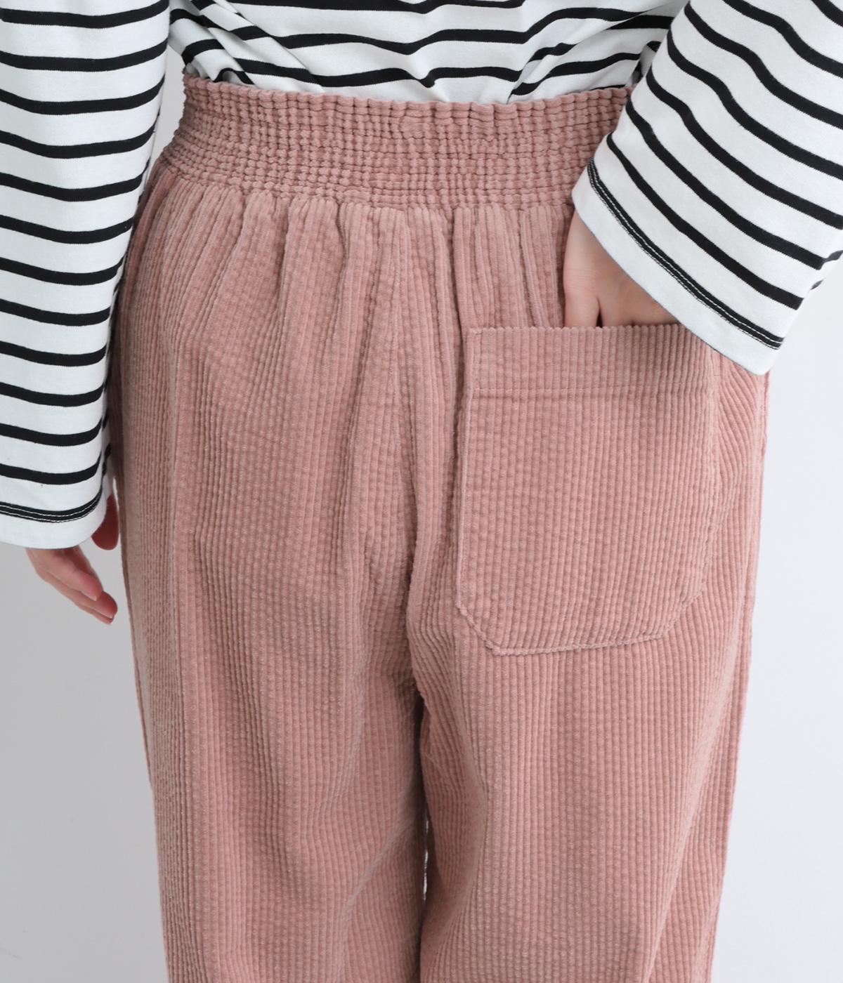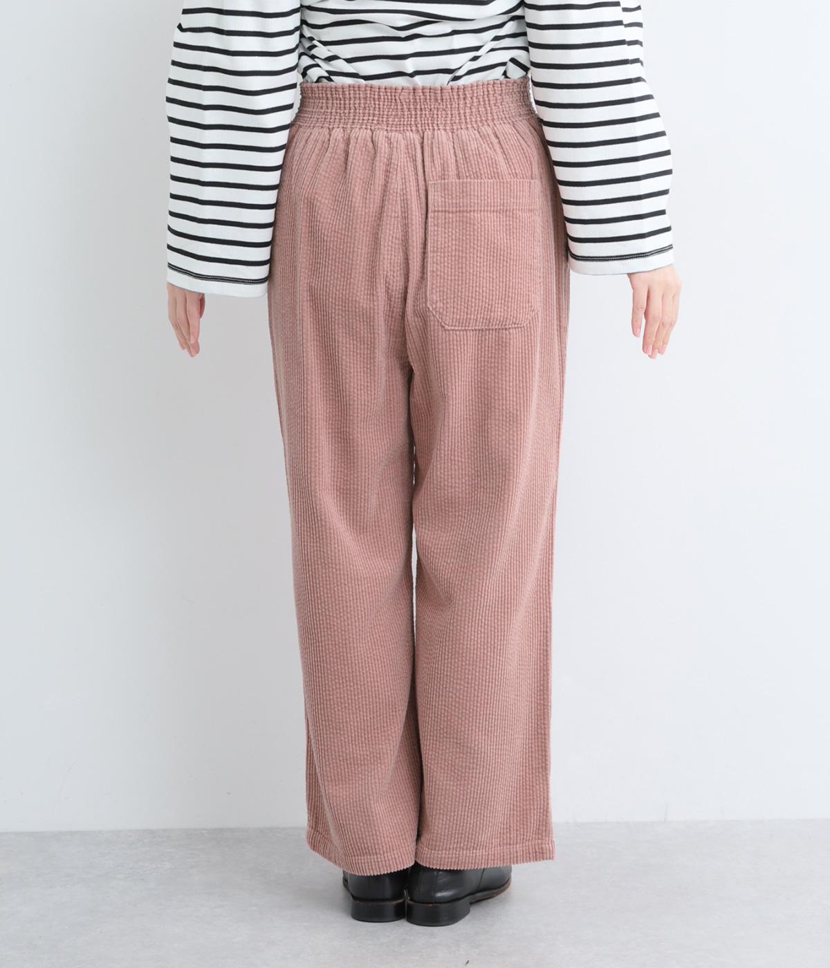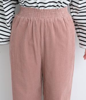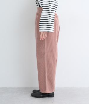 トラウザーパンツ特有のすっきりとしたきれいなシルエットを保ちつつ、ウエストゴムで脱ぎはきイージーなプルオンタイプに仕立てました。見た目にも考慮した太めのシャーリングデザインで、トップスをインした着こなしもおすすめです。