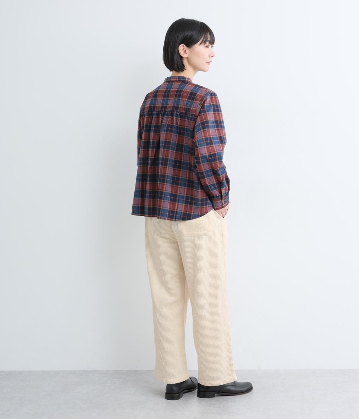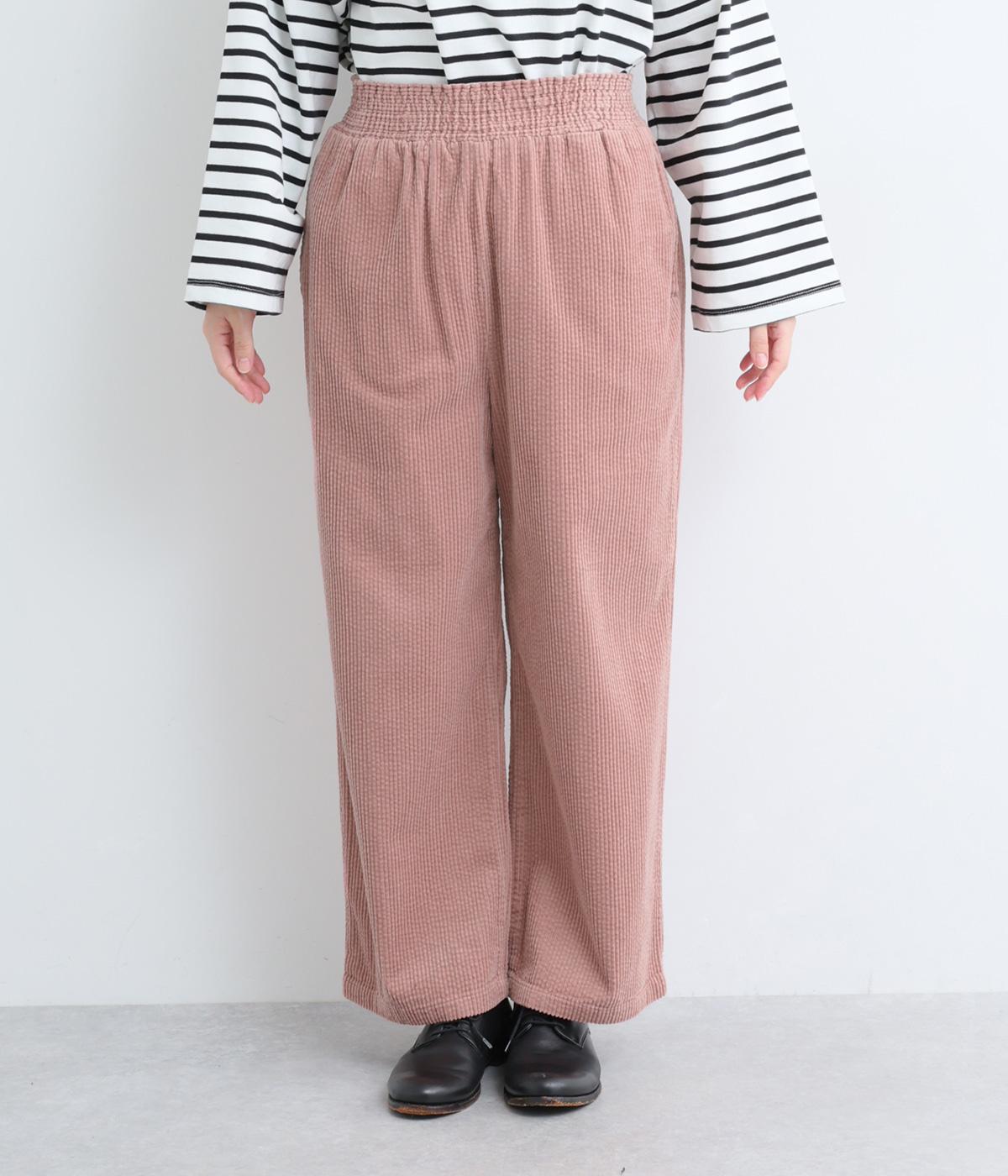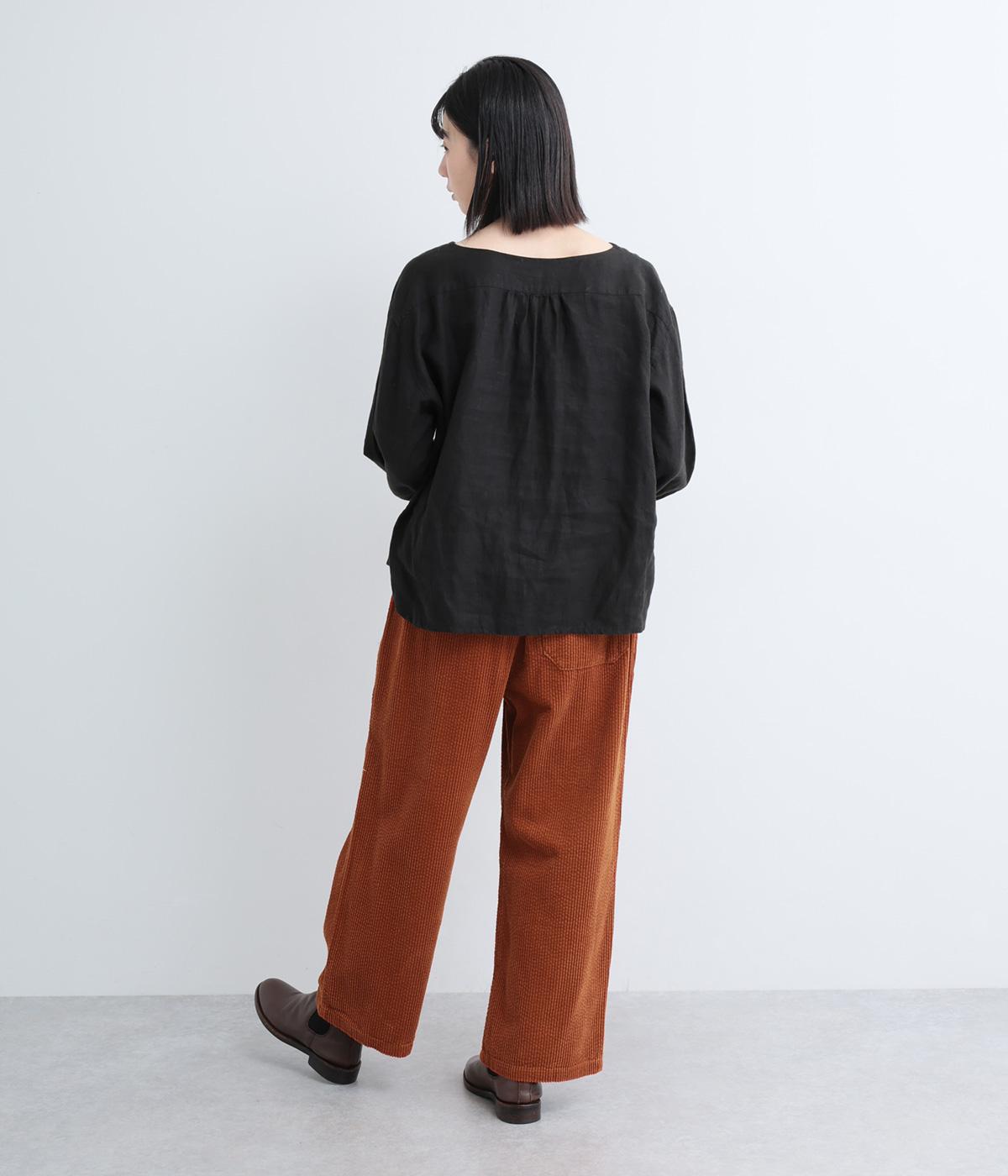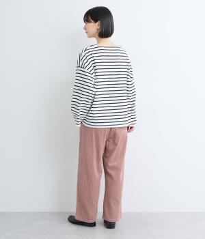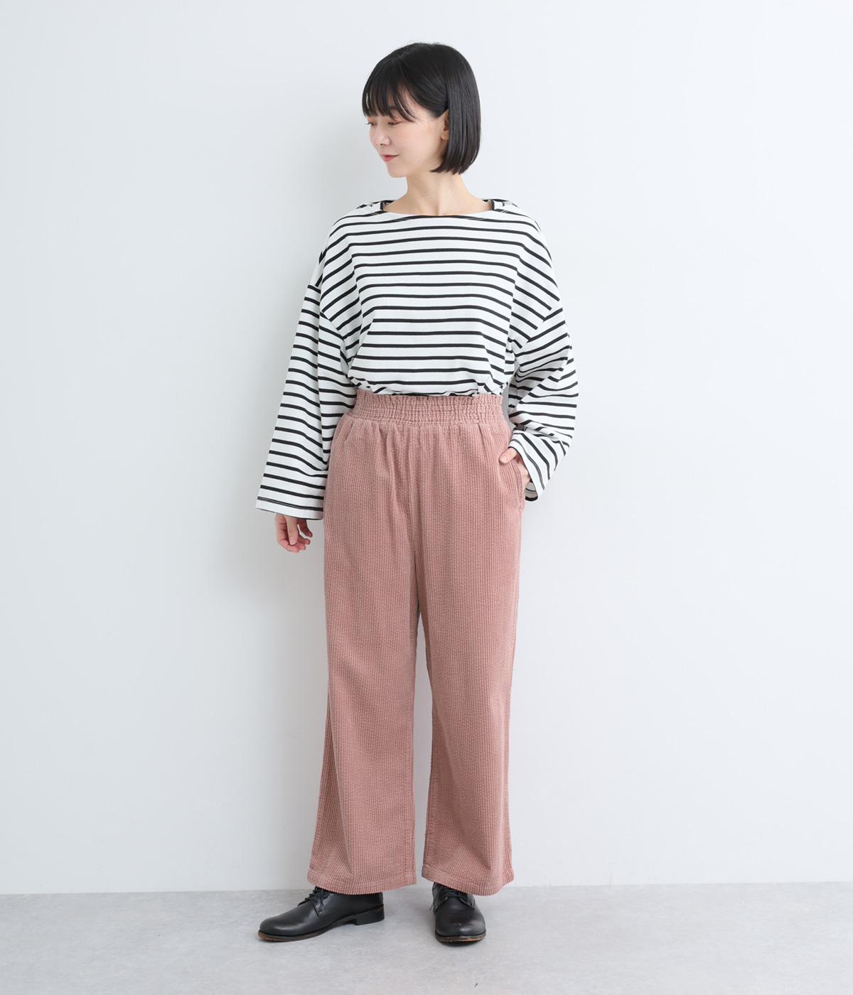 トラウザーパンツ特有のすっきりとしたきれいなシルエットを保ちつつ、ウエストゴムで脱ぎはきイージーなプルオンタイプに仕立てました。見た目にも考慮した太めのシャーリングデザインで、トップスをインした着こなしもおすすめです。