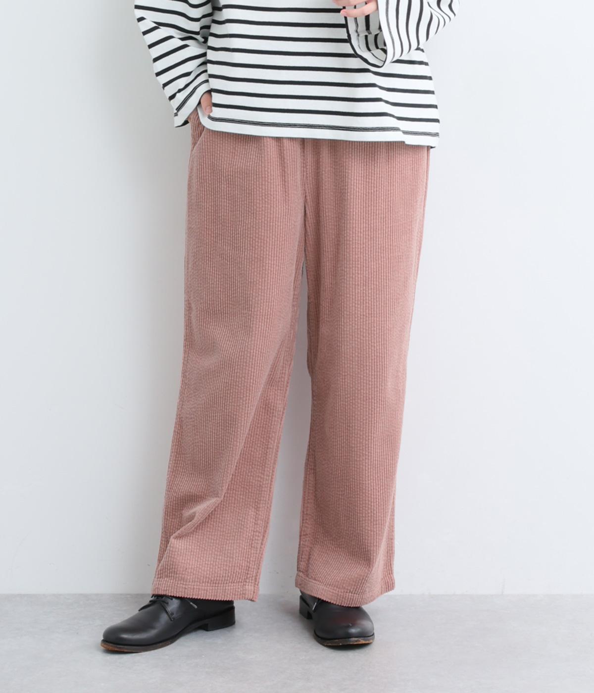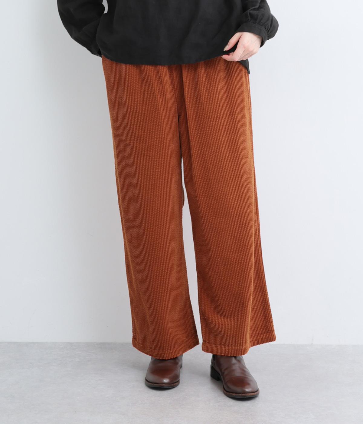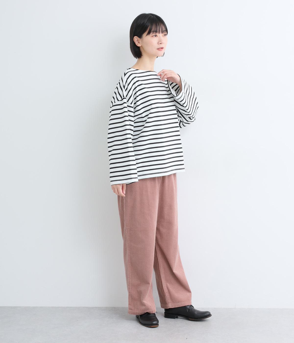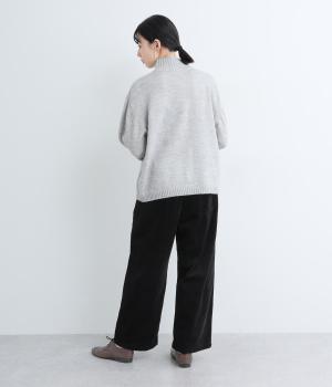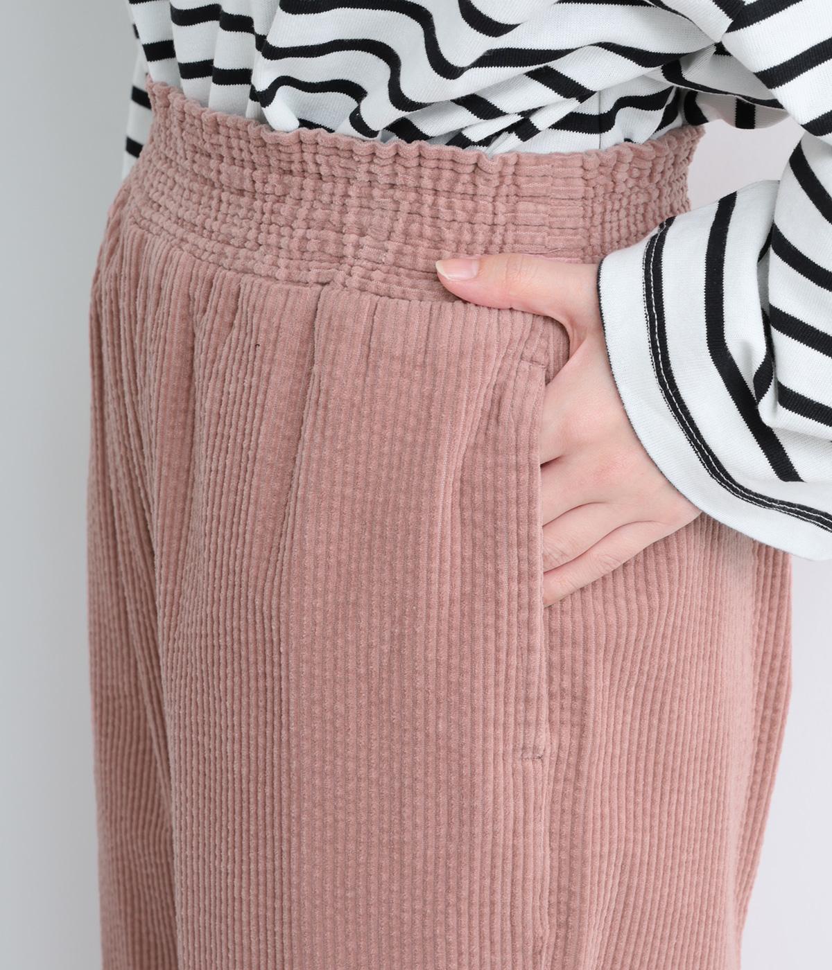 トラウザーパンツ特有のすっきりとしたきれいなシルエットを保ちつつ、ウエストゴムで脱ぎはきイージーなプルオンタイプに仕立てました。見た目にも考慮した太めのシャーリングデザインで、トップスをインした着こなしもおすすめです。