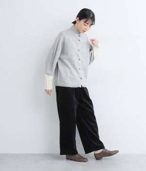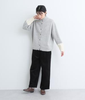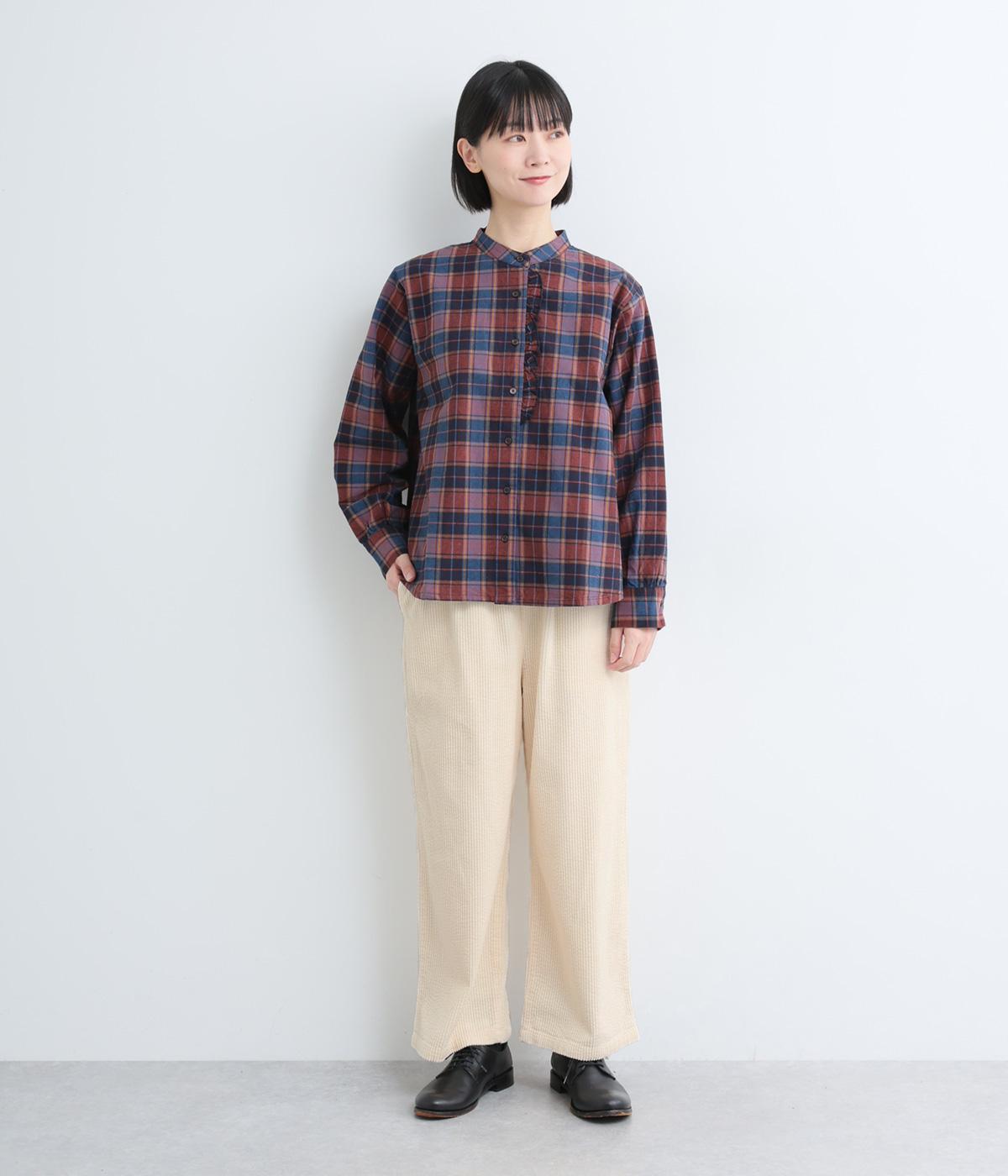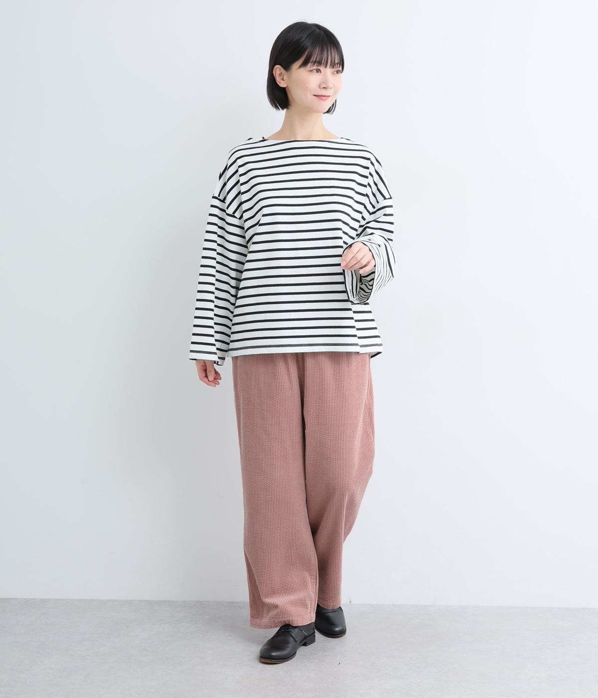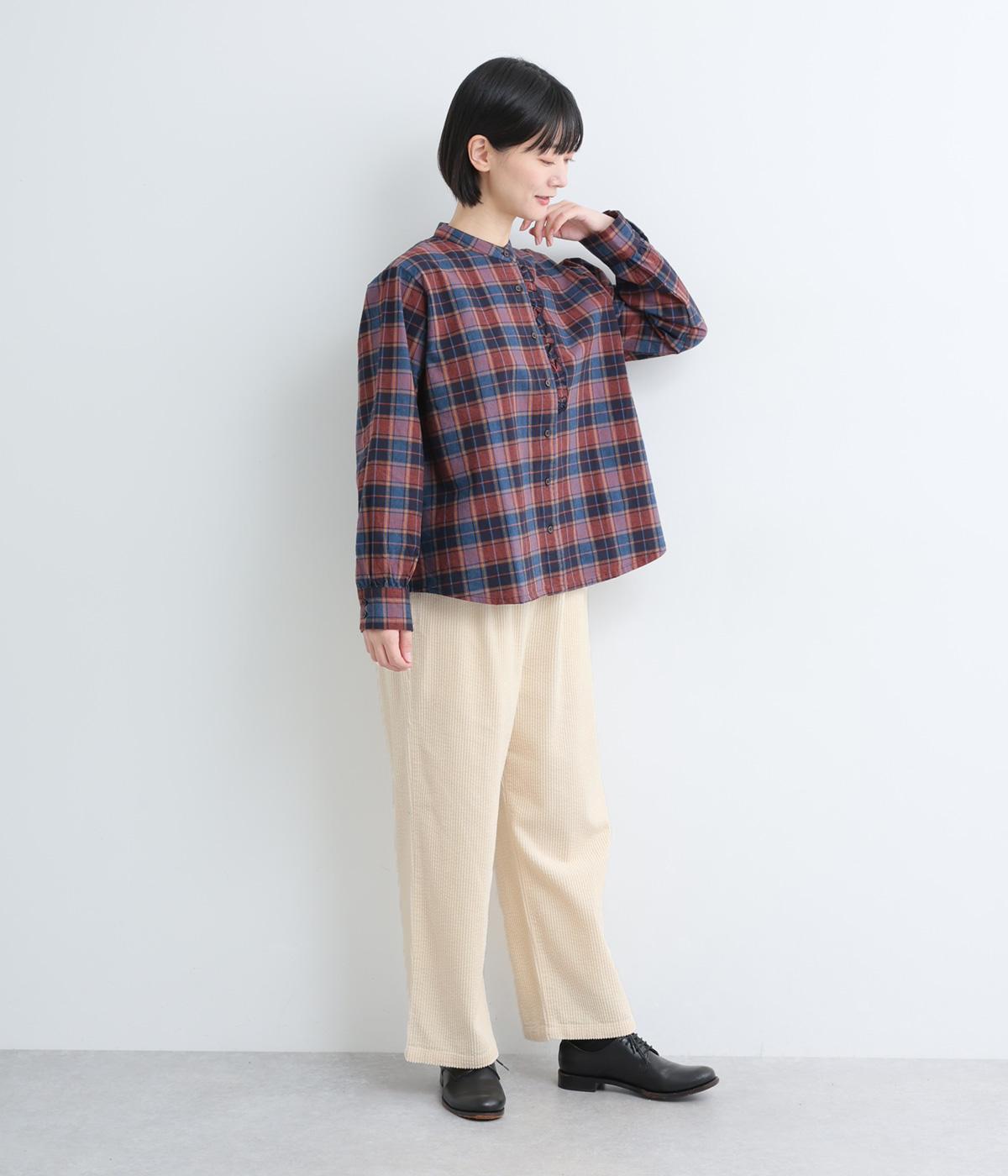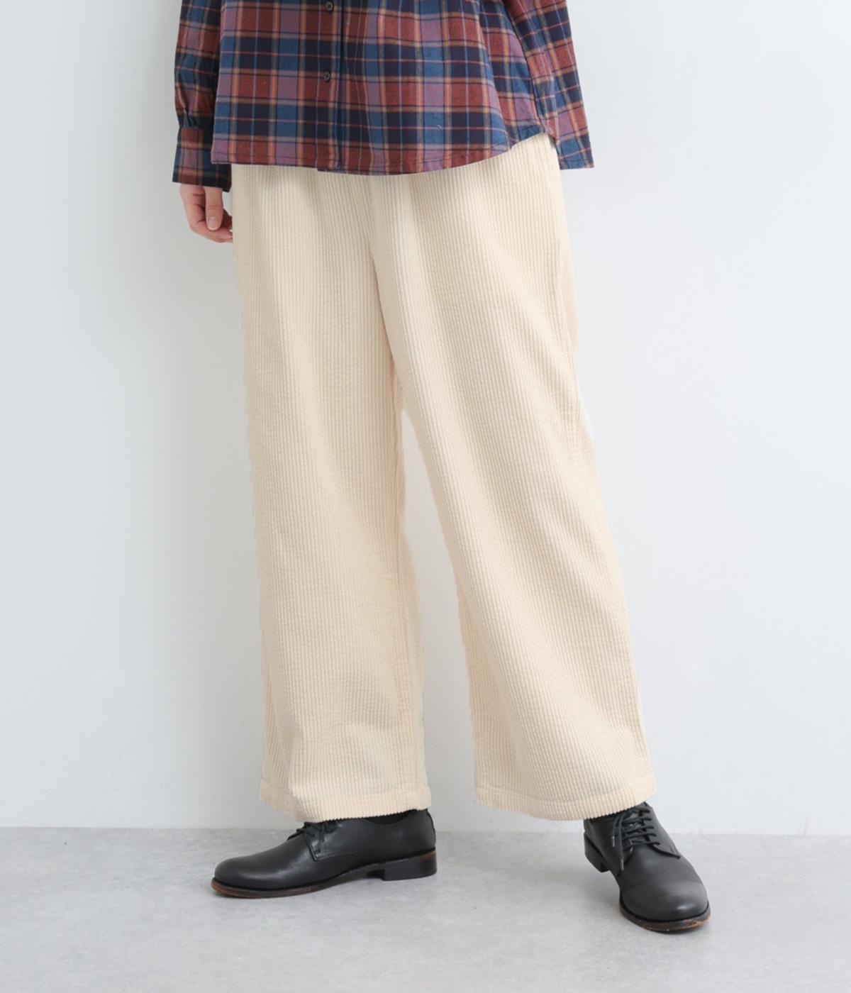 トラウザーパンツ特有のすっきりとしたきれいなシルエットを保ちつつ、ウエストゴムで脱ぎはきイージーなプルオンタイプに仕立てました。見た目にも考慮した太めのシャーリングデザインで、トップスをインした着こなしもおすすめです。