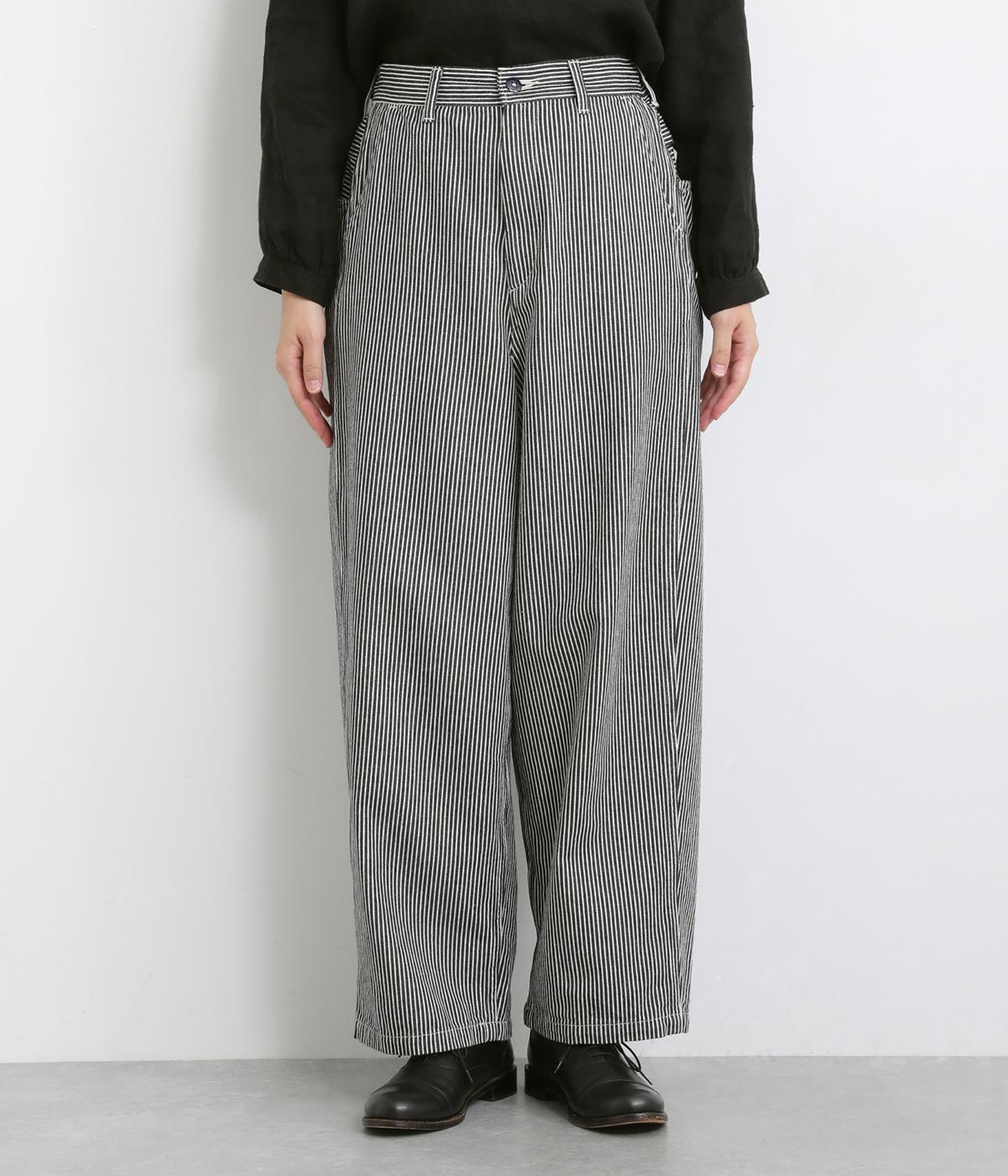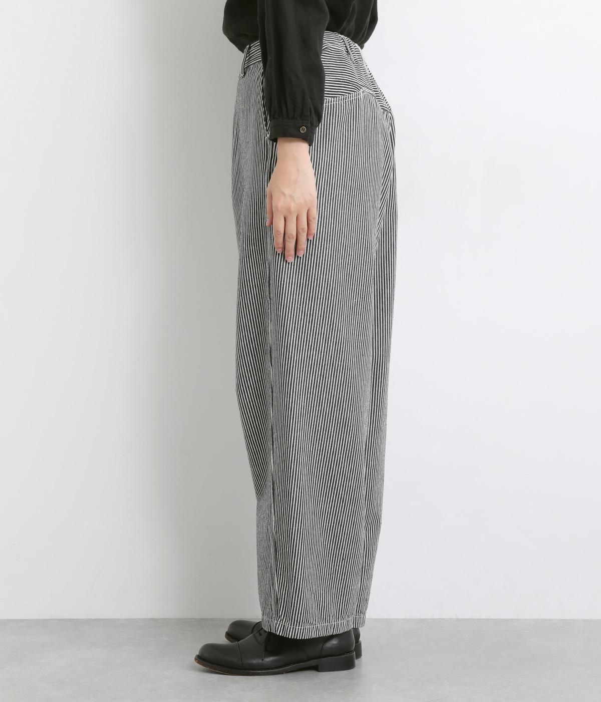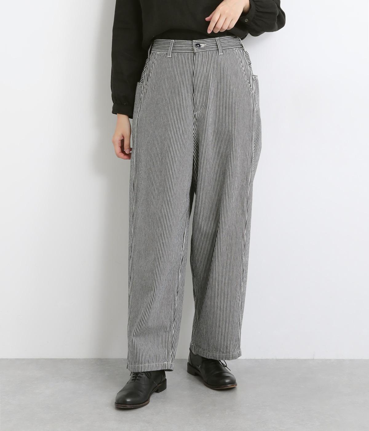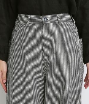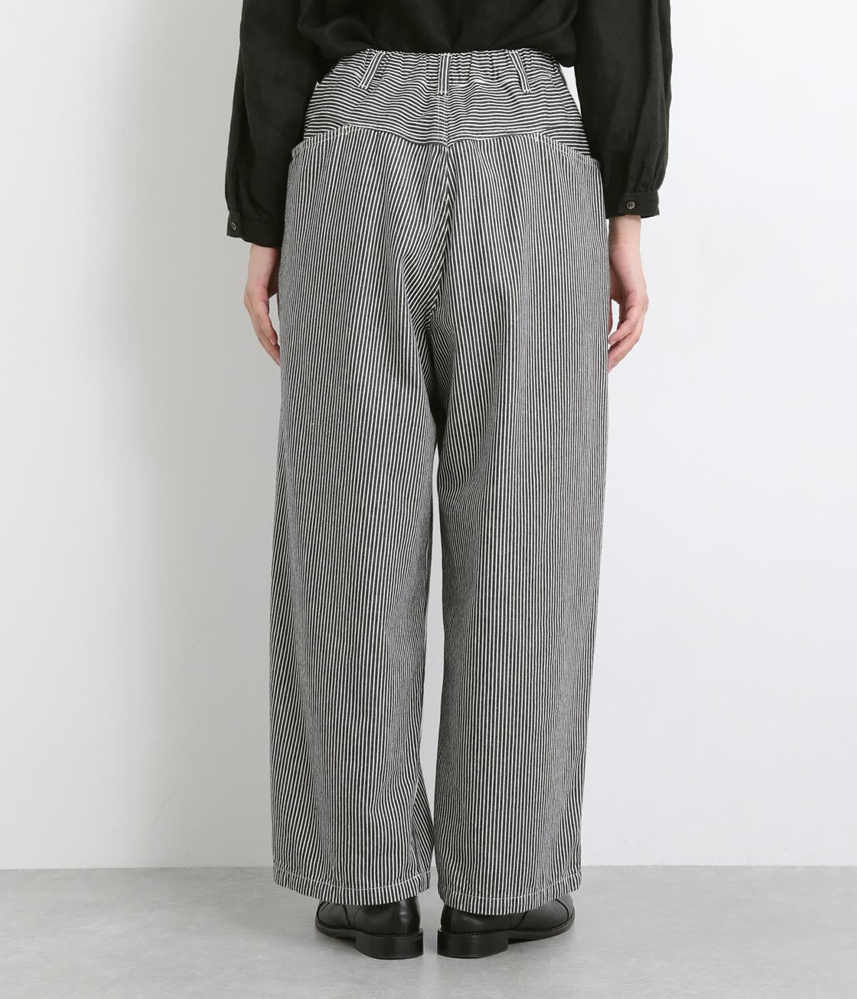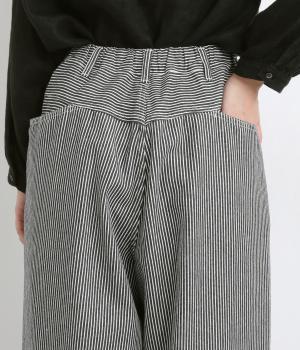 大人のカジュアルスタイルにワンポイント添えてくれるヒッコリーパンツ。適度なゆるさとすっきりはきやすいラインで、合わせるトップスを選びません。前ファスナー&後ろゴム入りのイージー仕立てが◎。ヒップポケットのデザインもきいています。