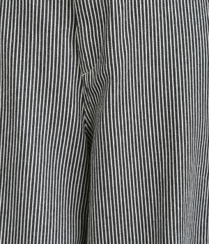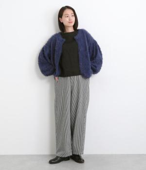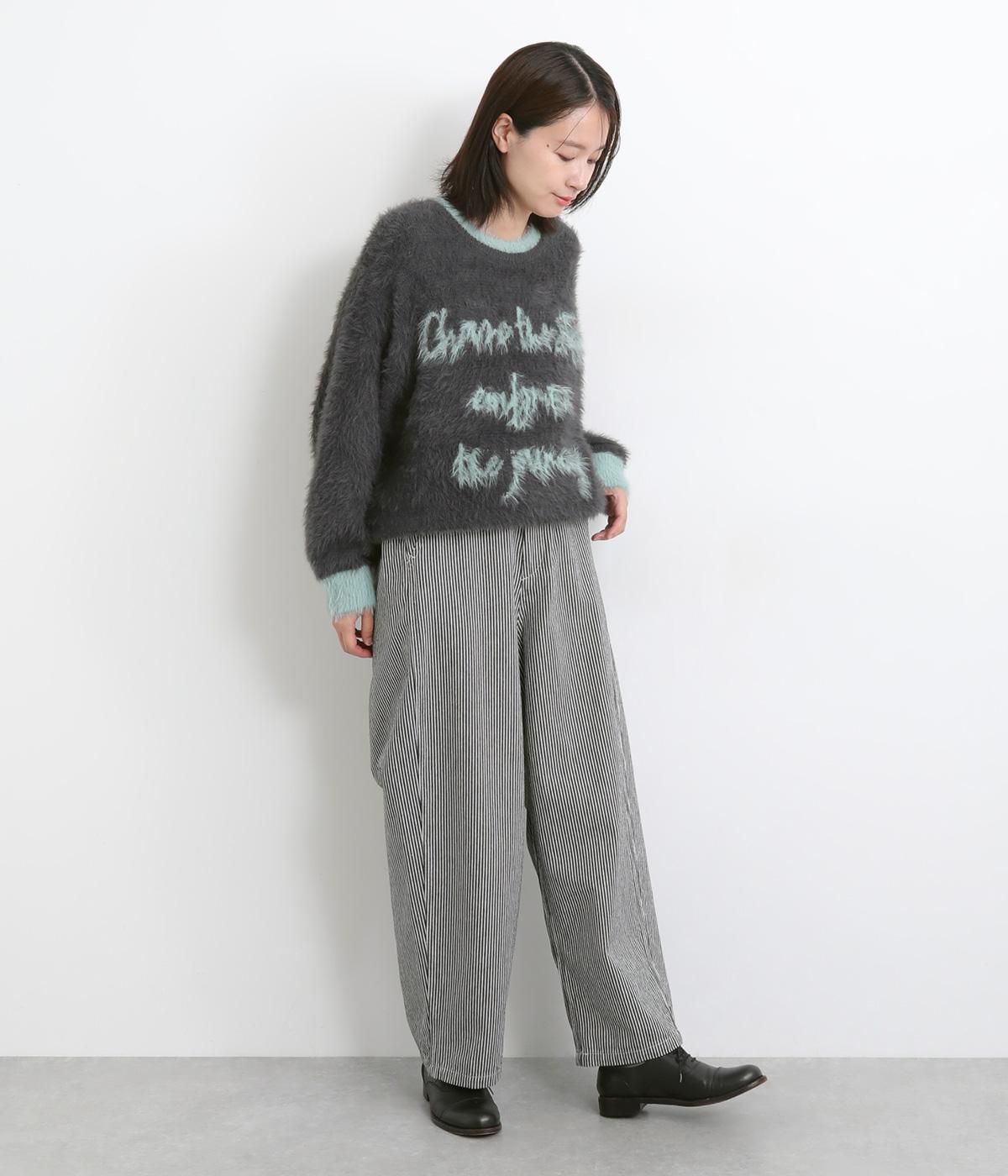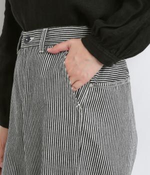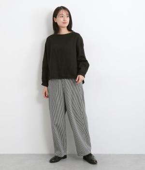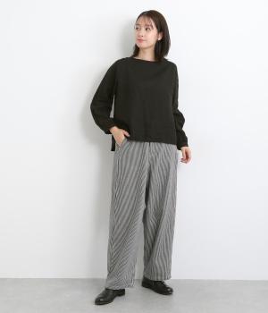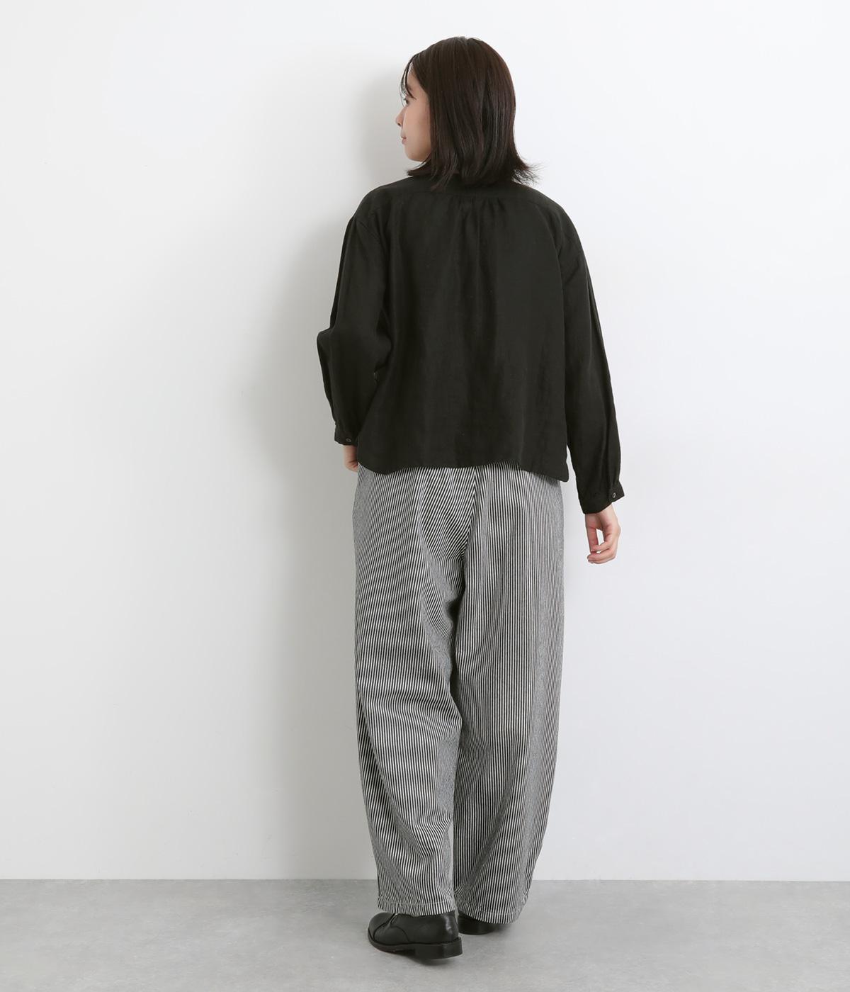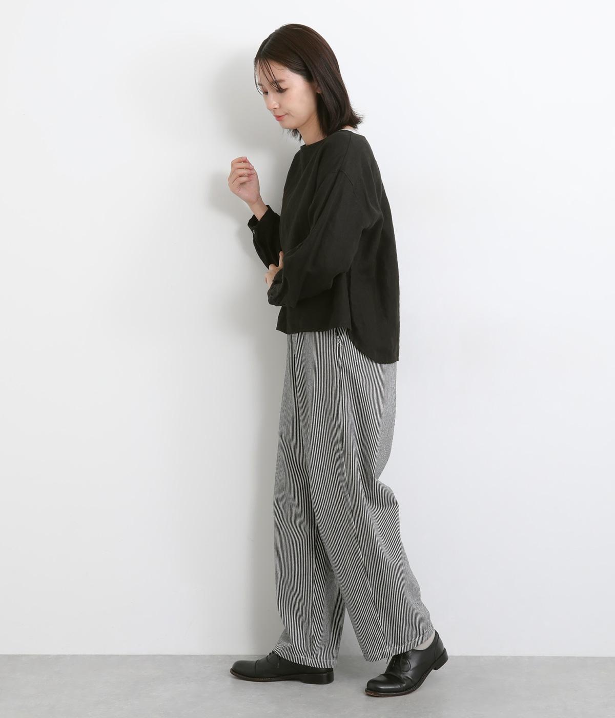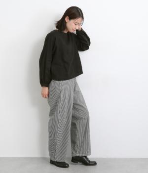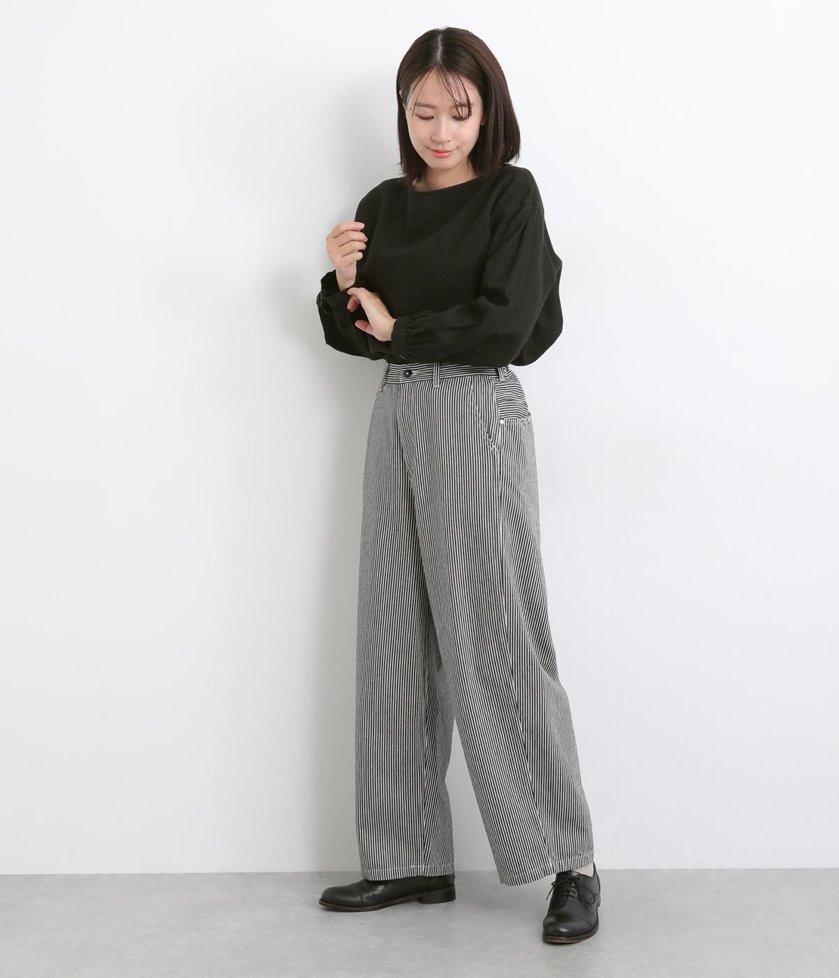 大人のカジュアルスタイルにワンポイント添えてくれるヒッコリーパンツ。適度なゆるさとすっきりはきやすいラインで、合わせるトップスを選びません。前ファスナー&後ろゴム入りのイージー仕立てが◎。ヒップポケットのデザインもきいています。