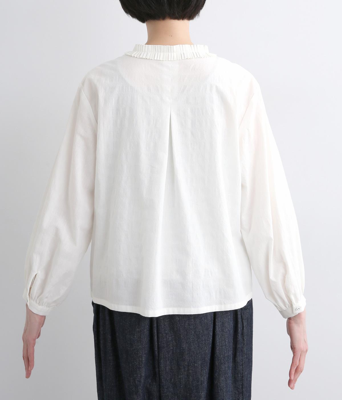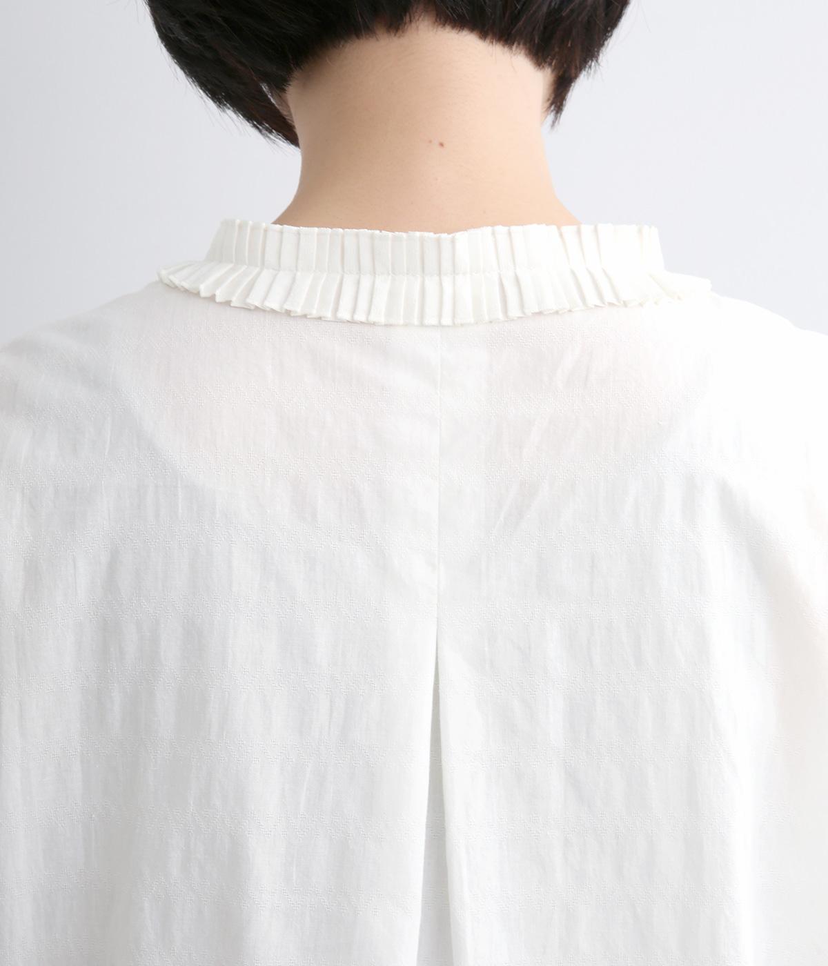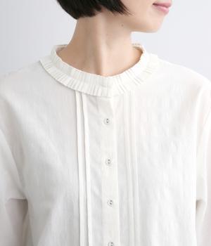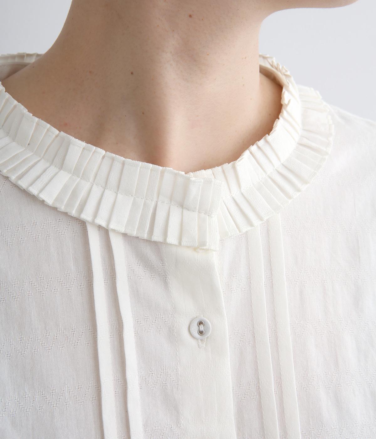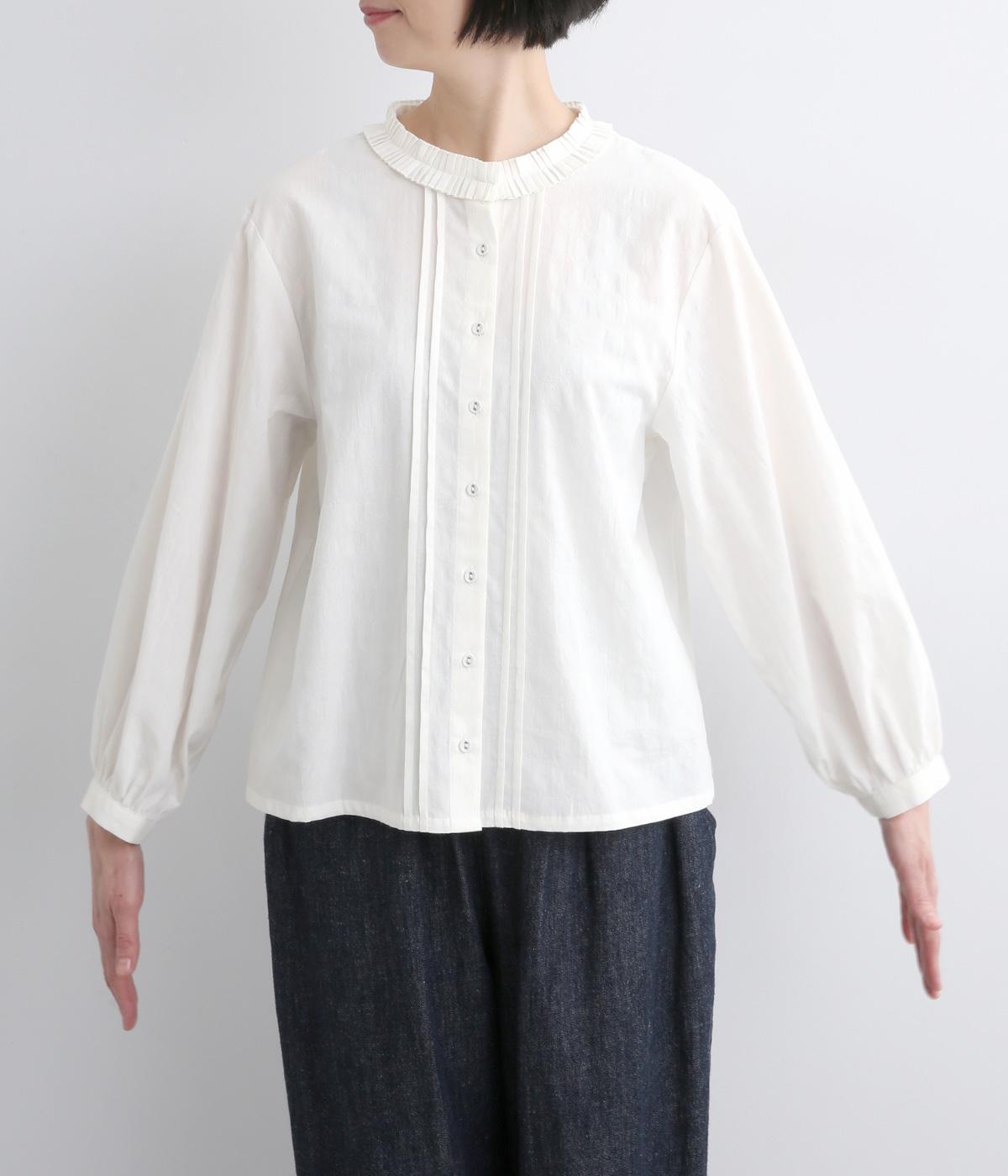 胸元のプリーツ襟が顔まわりを華やかに演出するブラウスです。フロントのピンタックはシルエットに立体感を出すと同時に、すっきり見せする効果も。メイン使いはもちろん、フォーマルシーンのジャケットインにもおすすめです。