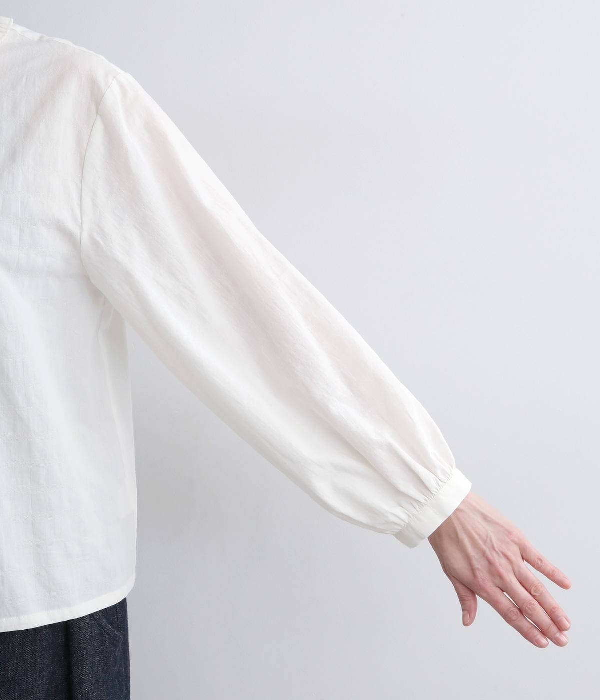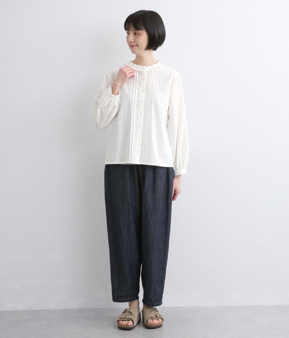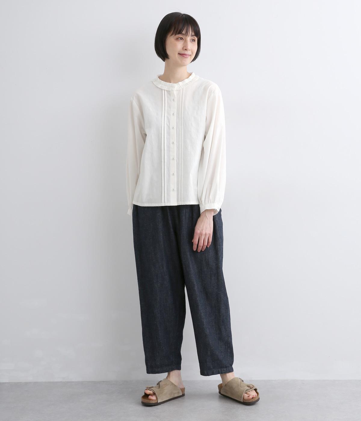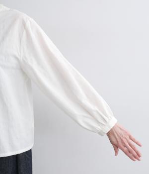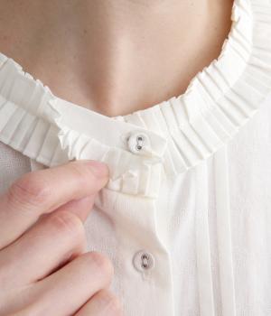 胸元のプリーツ襟が顔まわりを華やかに演出するブラウスです。フロントのピンタックはシルエットに立体感を出すと同時に、すっきり見せする効果も。メイン使いはもちろん、フォーマルシーンのジャケットインにもおすすめです。