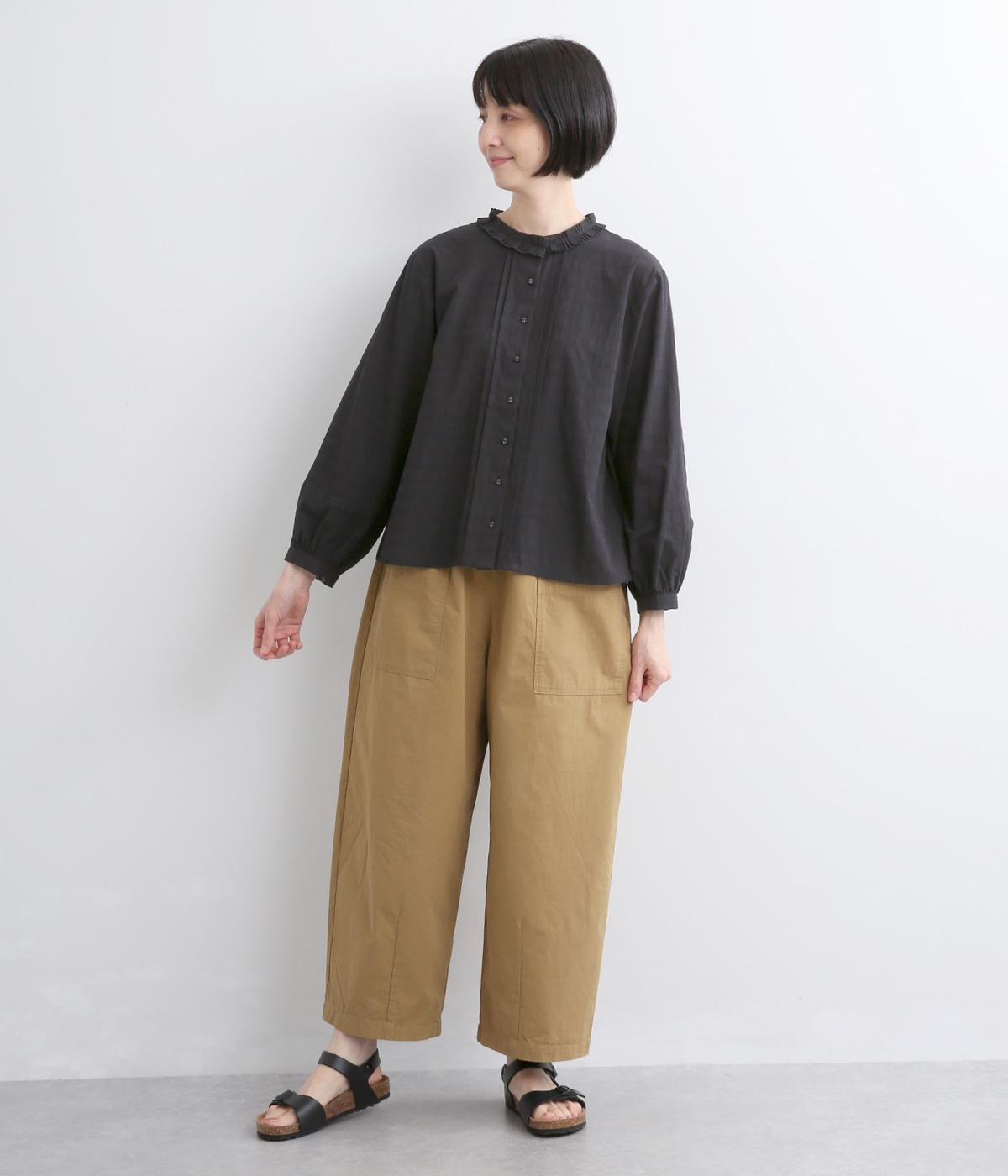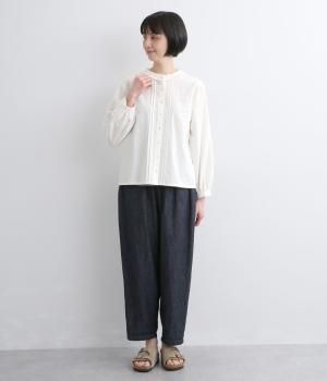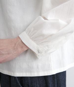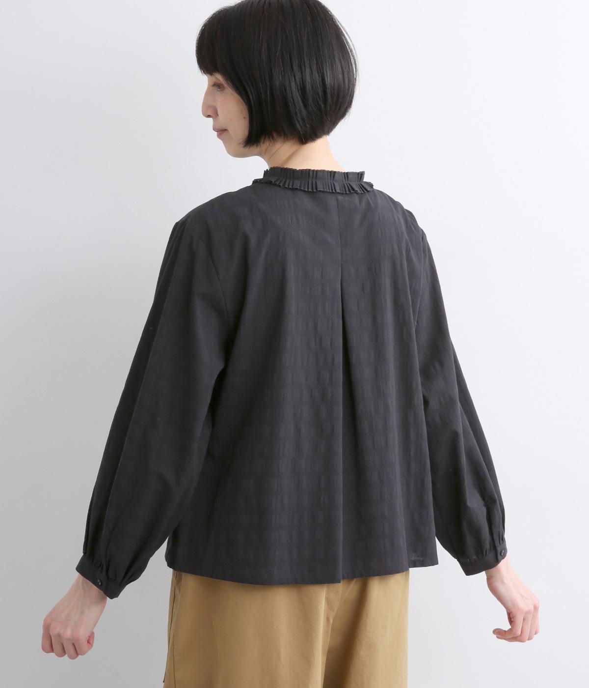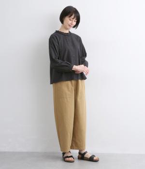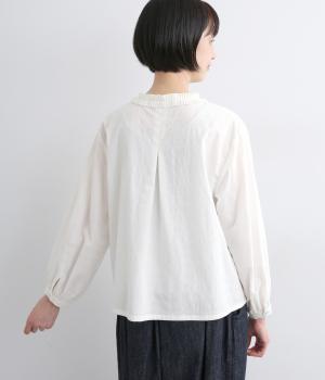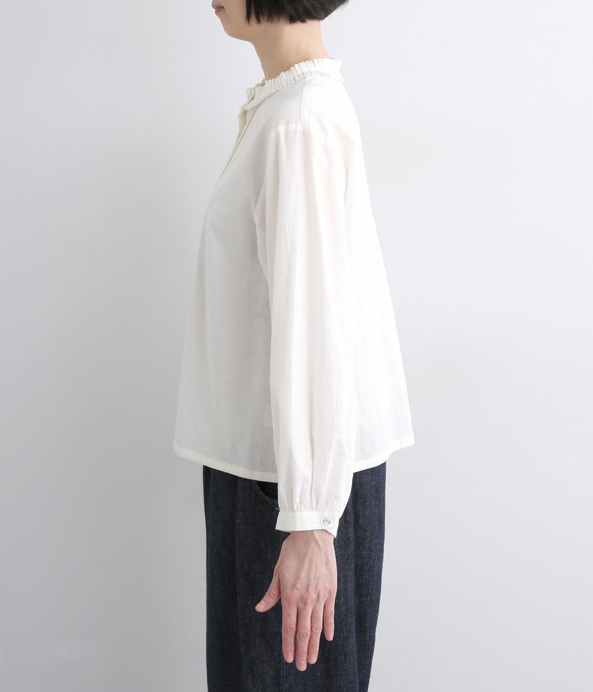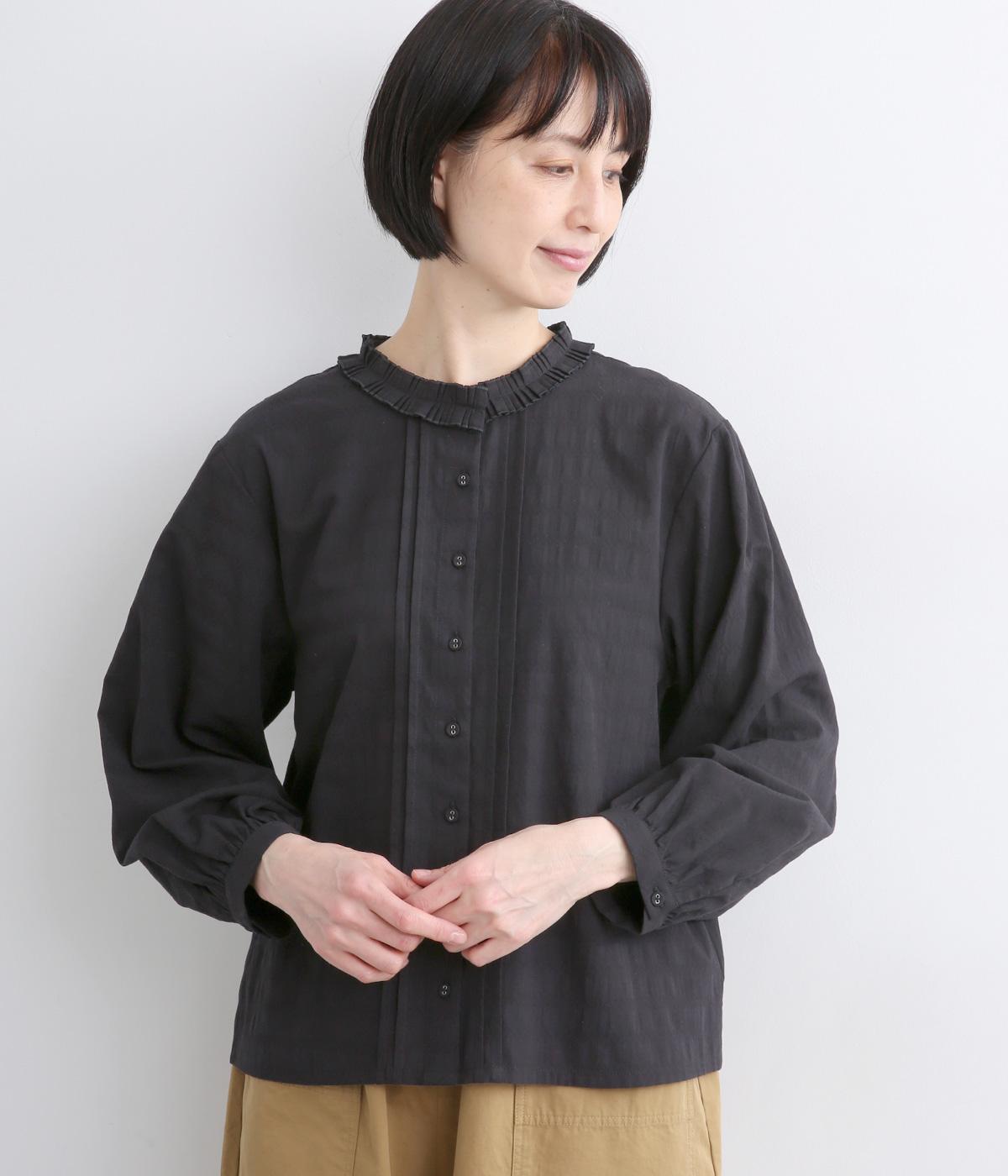 胸元のプリーツ襟が顔まわりを華やかに演出するブラウスです。フロントのピンタックはシルエットに立体感を出すと同時に、すっきり見せする効果も。メイン使いはもちろん、フォーマルシーンのジャケットインにもおすすめです。