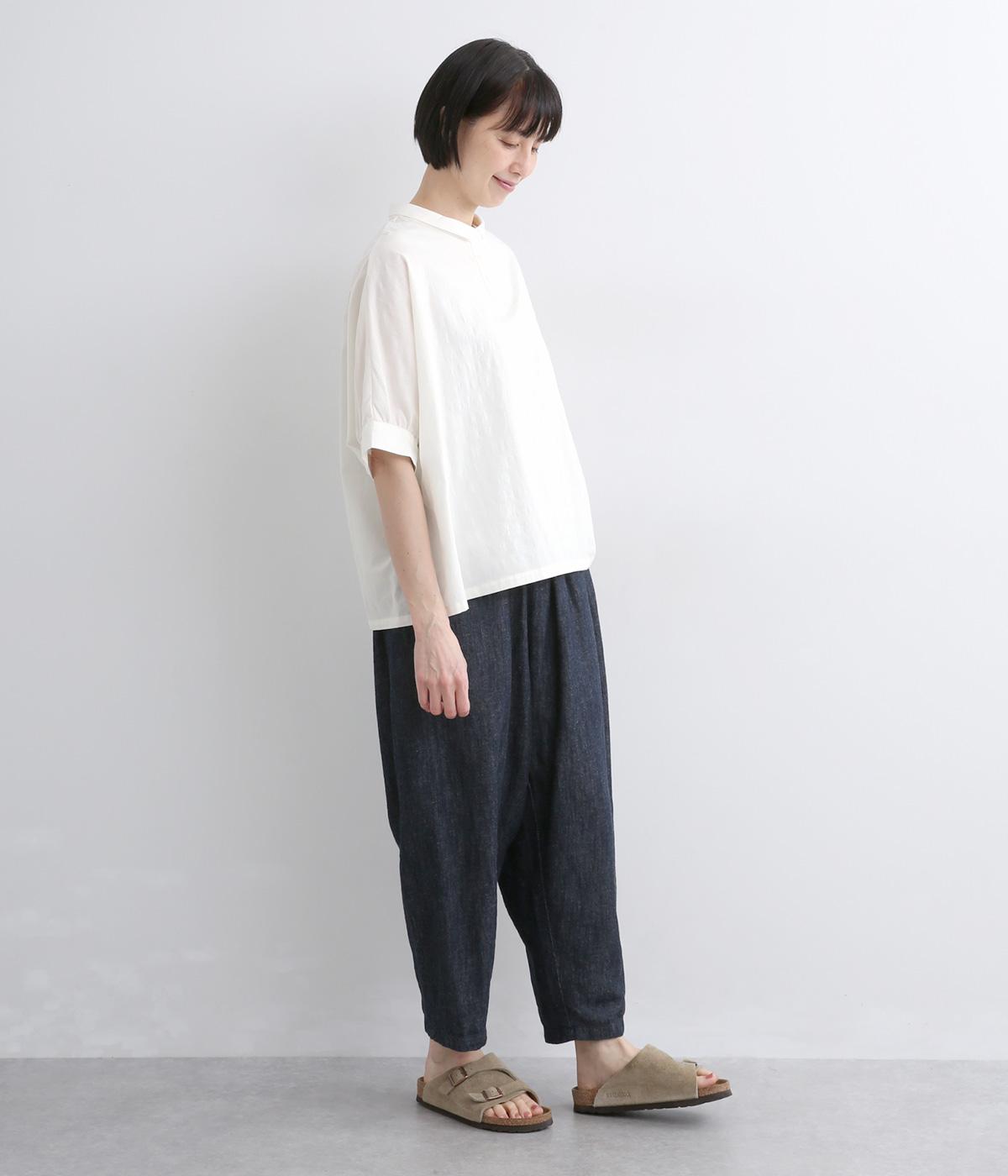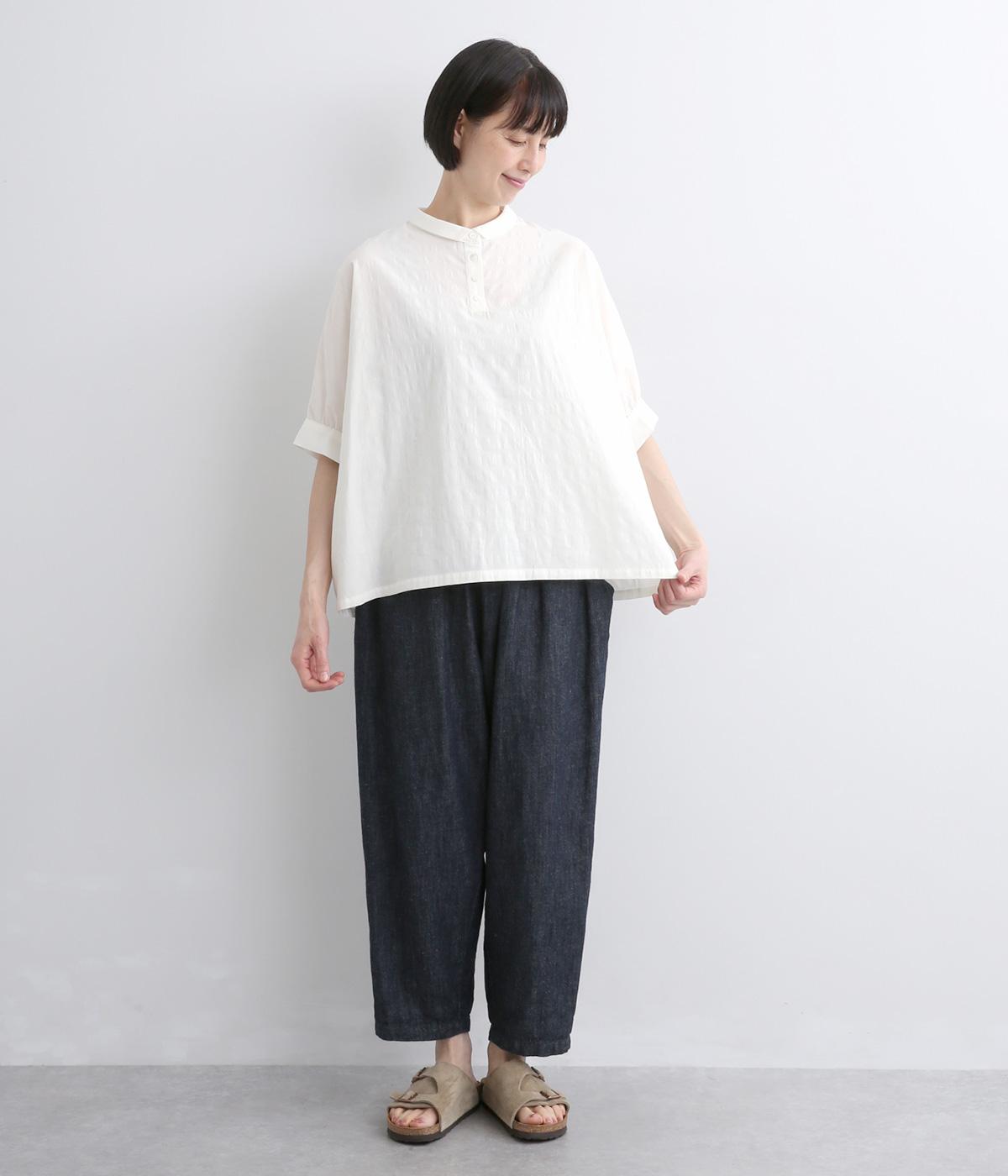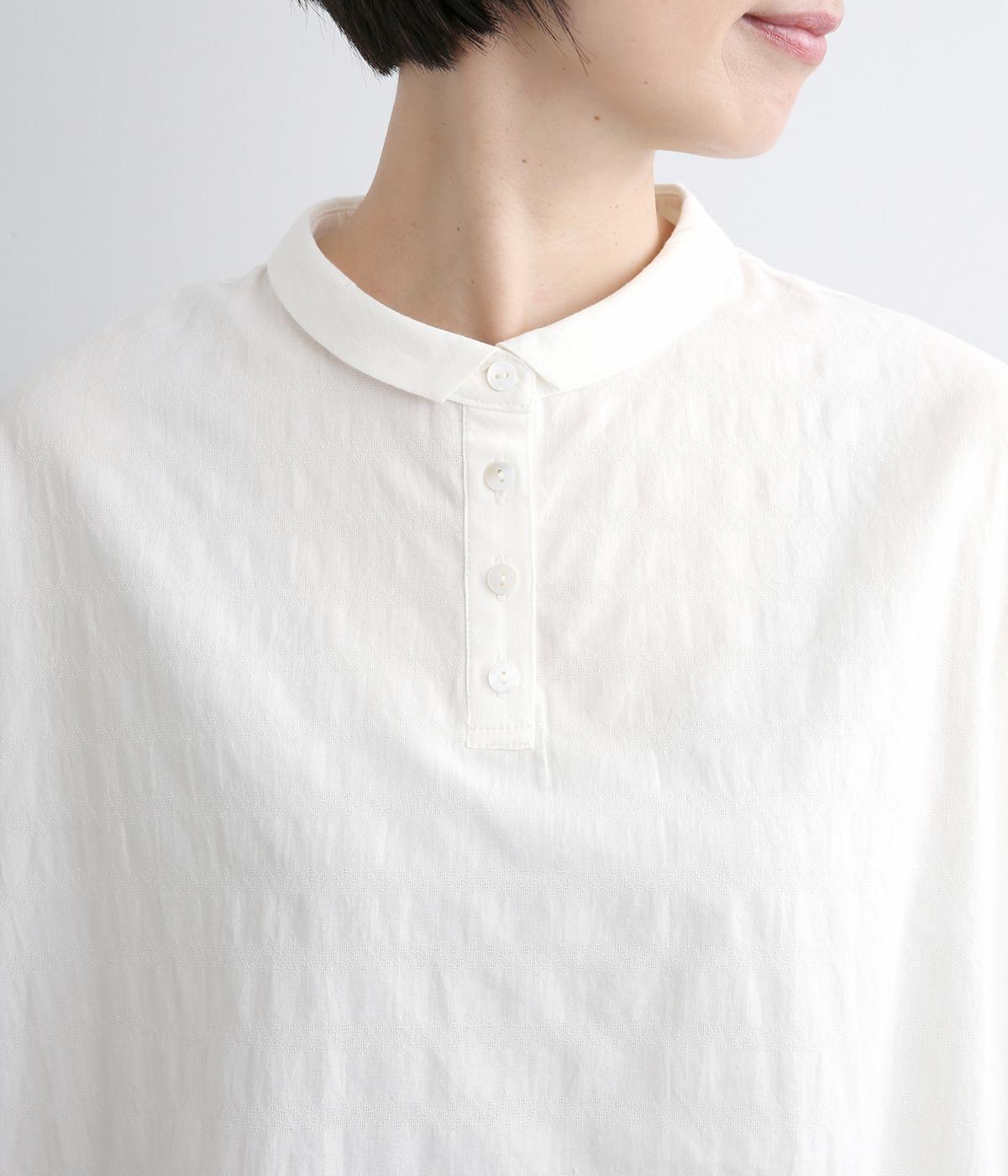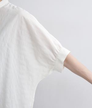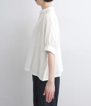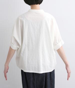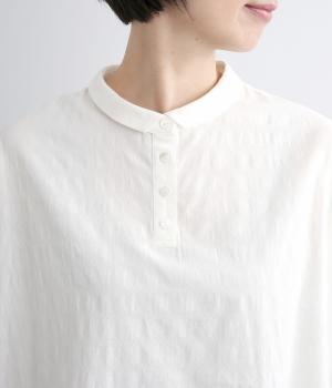 身頃続きのドルマンスリーブがリラックス感のあるシルエットを表現するブラウスです。きちんと感とかわいらしさを併せ持つチビ襟が顔まわりのアクセントに。スリット入りの袖口で動きを妨げません。