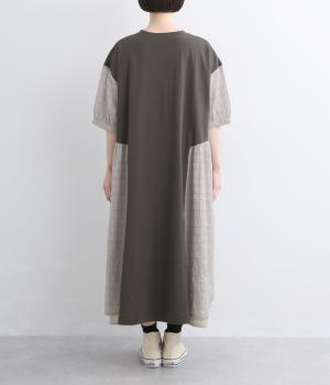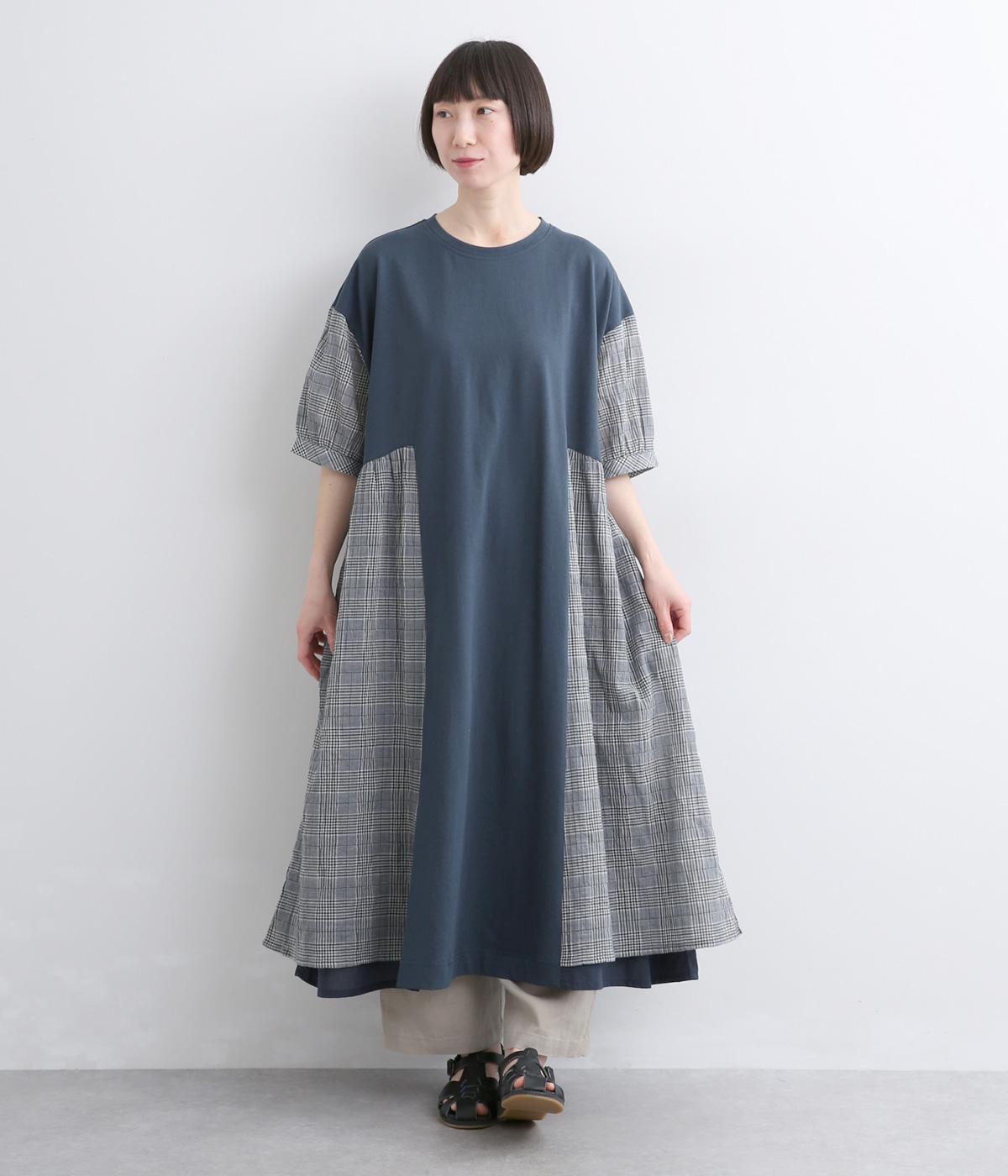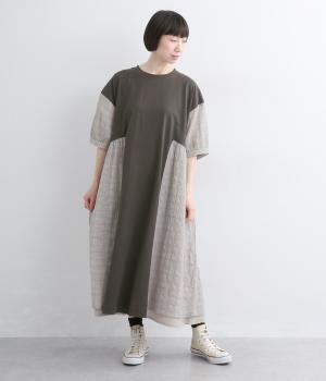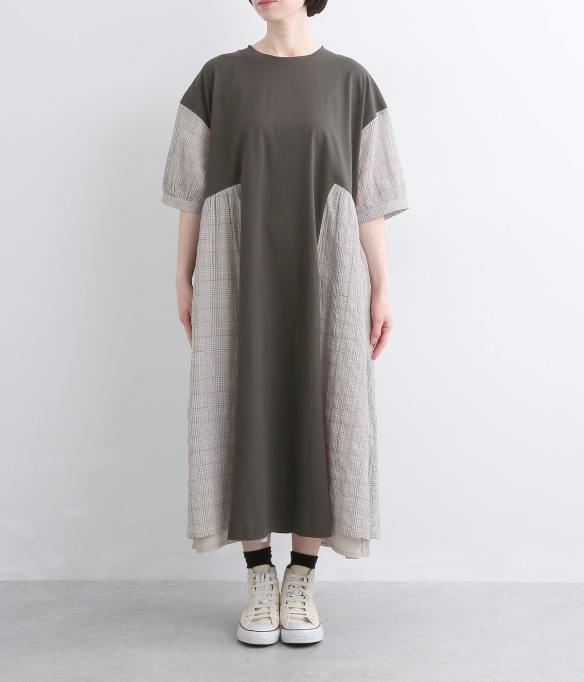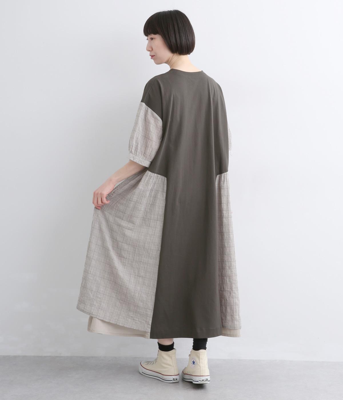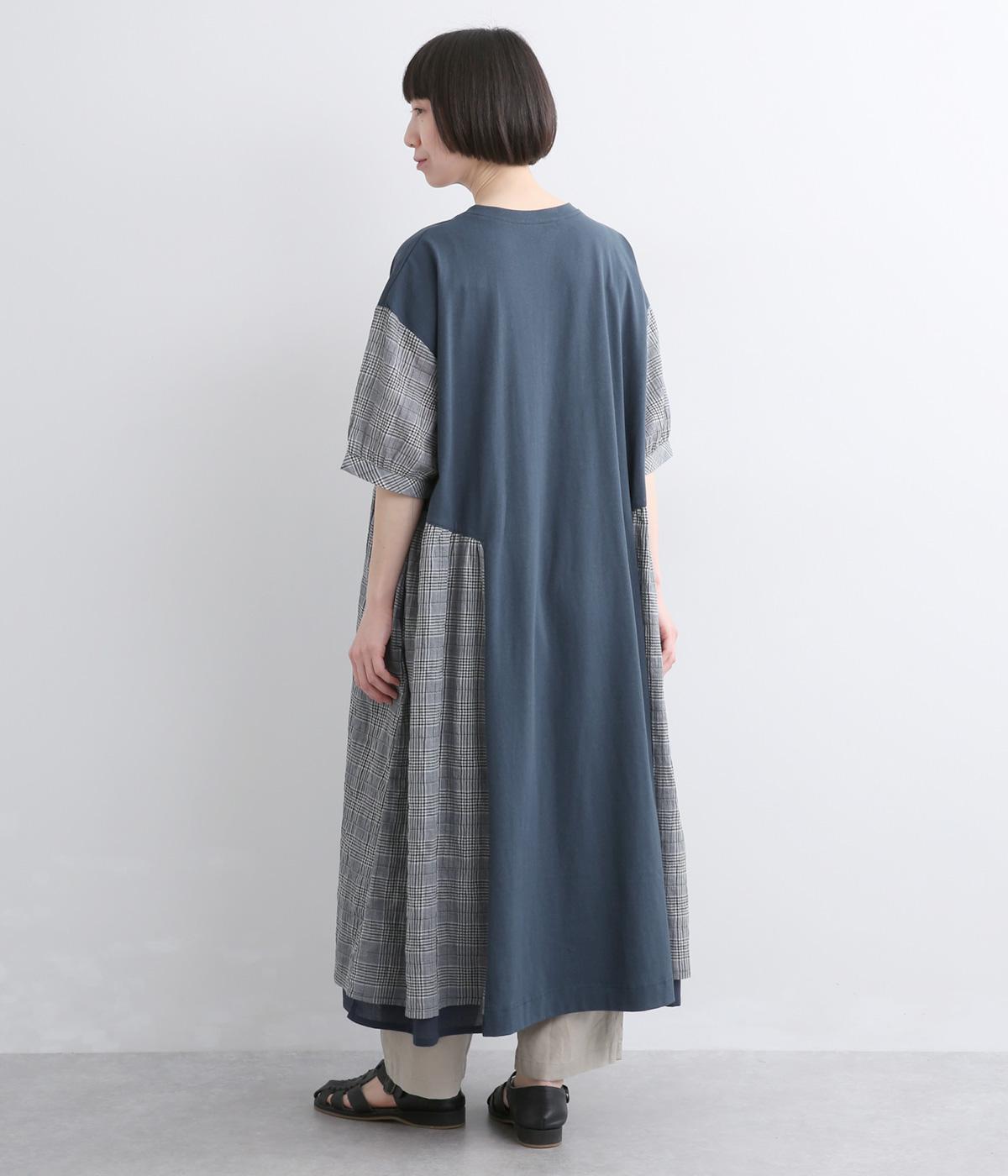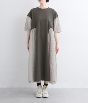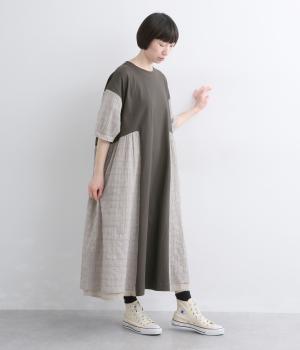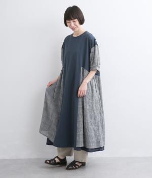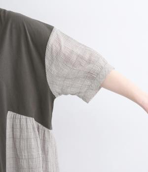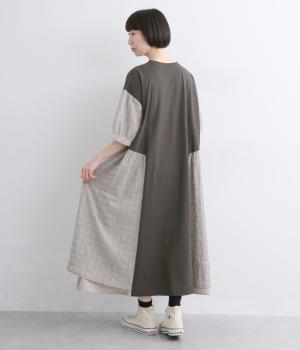 ベースは伸びのよいやわらかな質感のコットン生地を、袖やスカートの一部は細かな凹凸がある薄手の混紡生地で切り替えたドッキング仕様です。