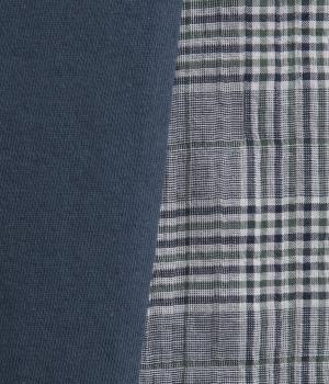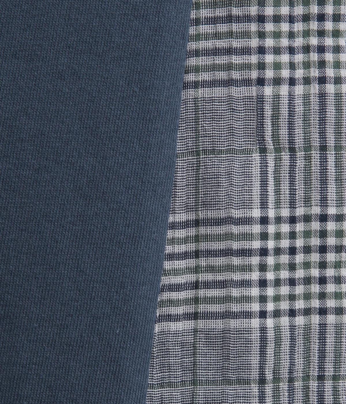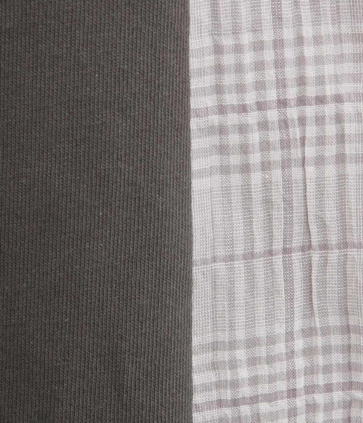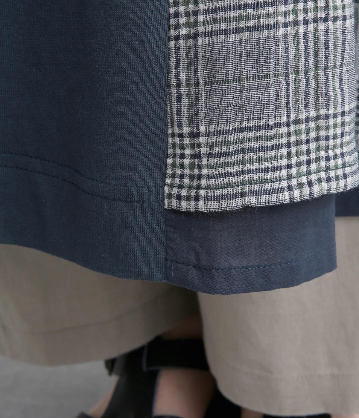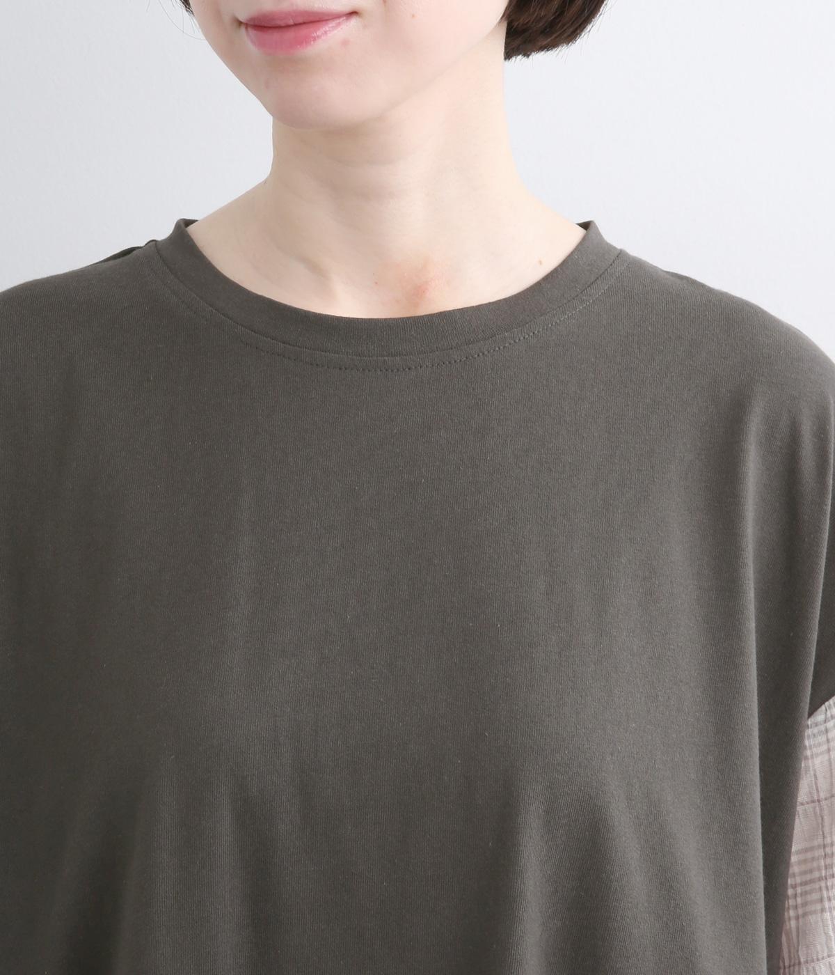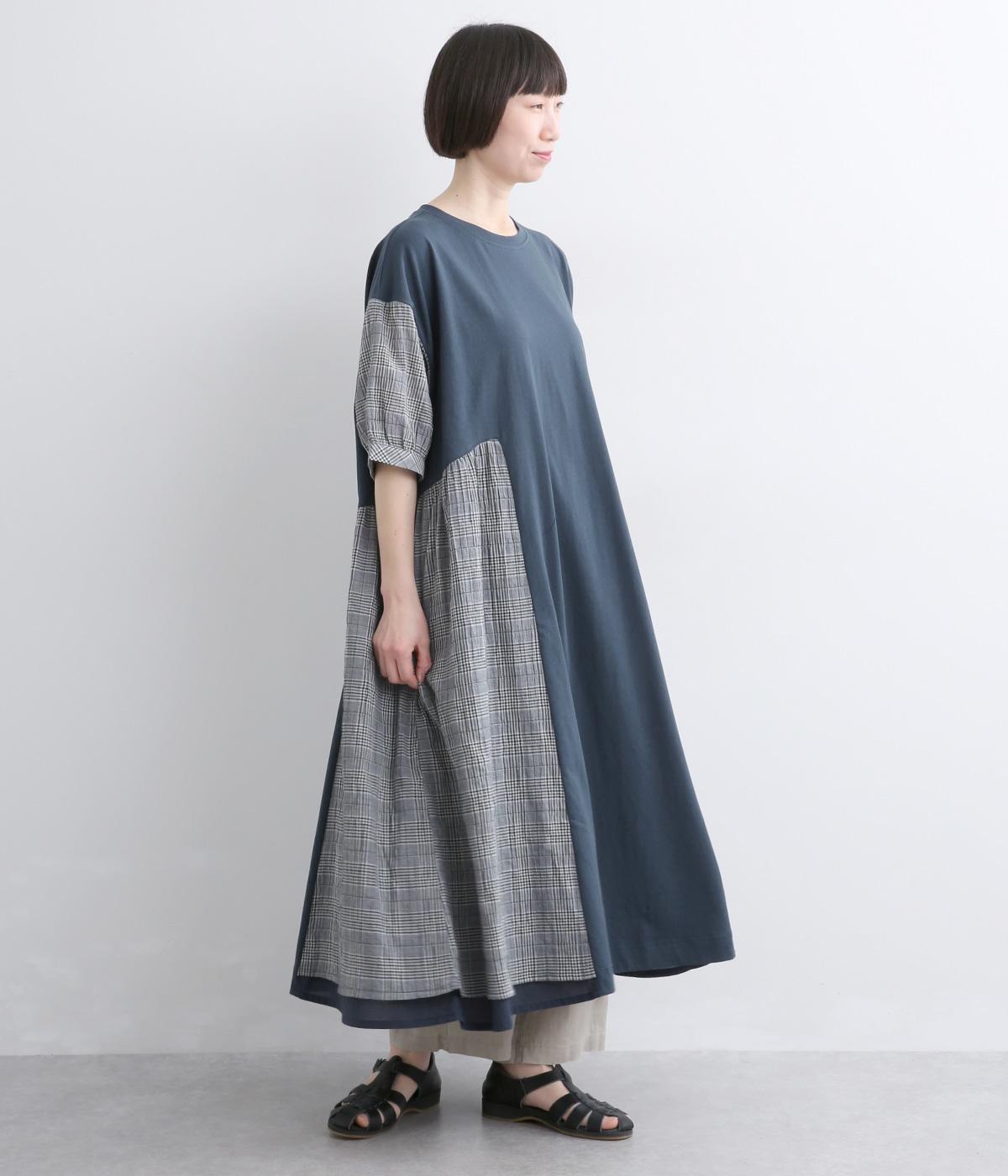ベースは伸びのよいやわらかな質感のコットン生地を、袖やスカートの一部は細かな凹凸がある薄手の混紡生地で切り替えたドッキング仕様です。