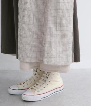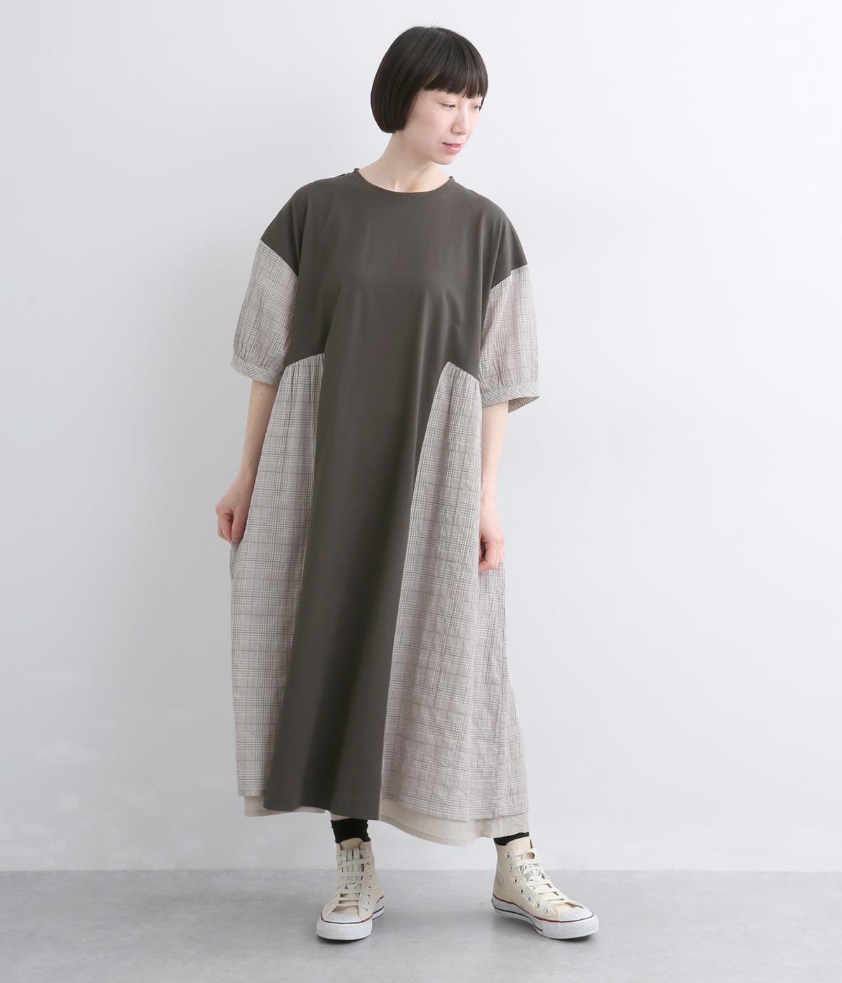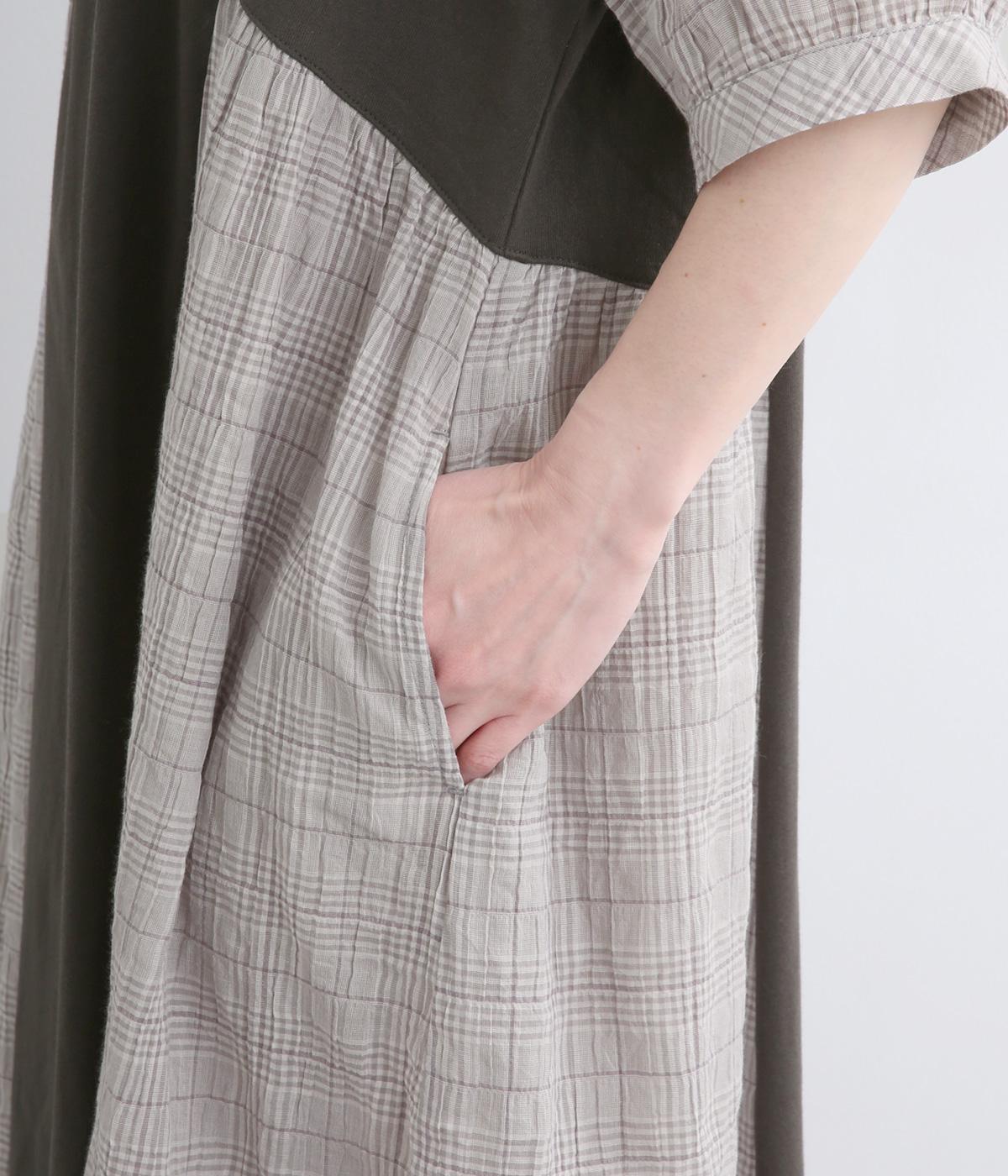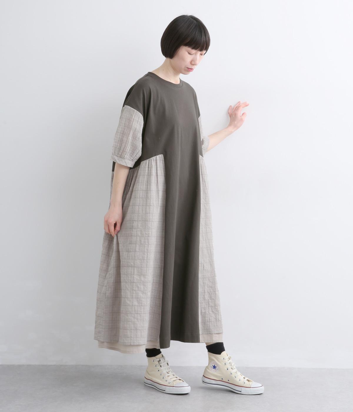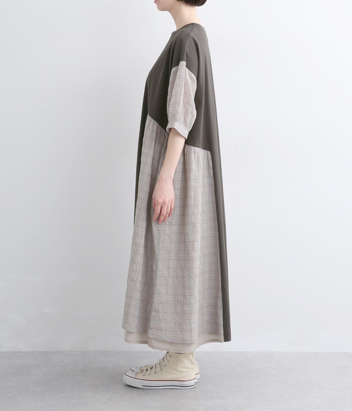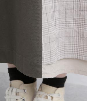 異素材切り替えが目を惹く、ゆったりシルエットのワンピースです。生地特有の落ち感が出るので、ボリュームが出すぎないのもポイントに。スカートのチェック柄部分は2枚仕立てなので、透け感を気にせず一枚で着用が可能です。