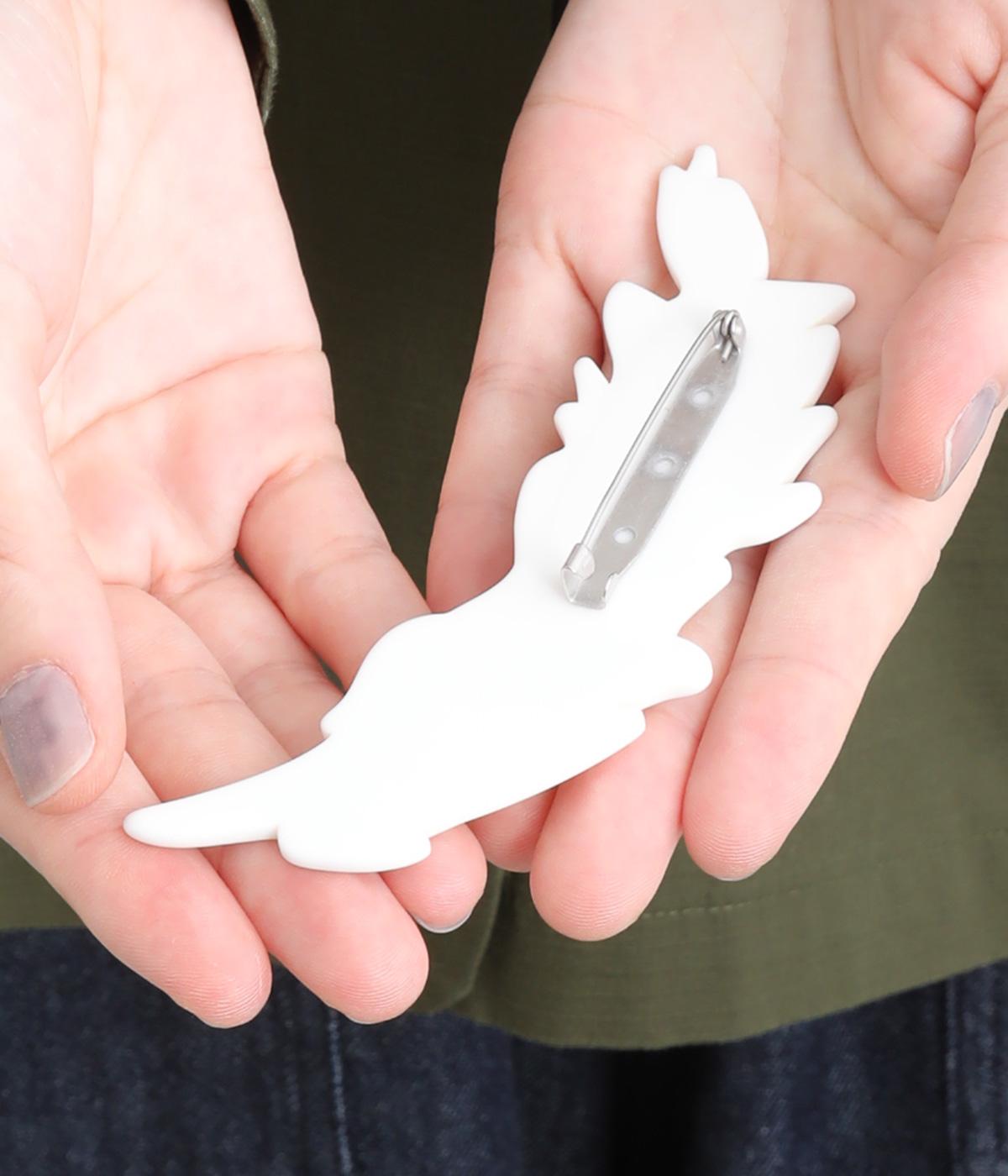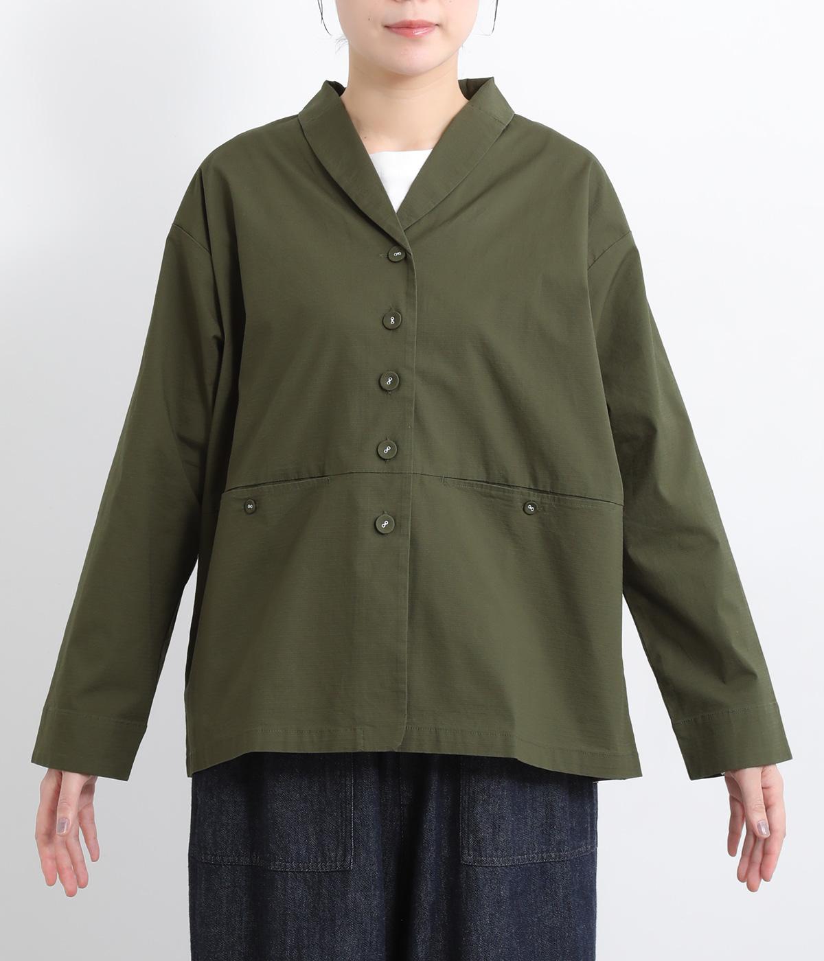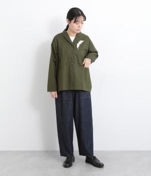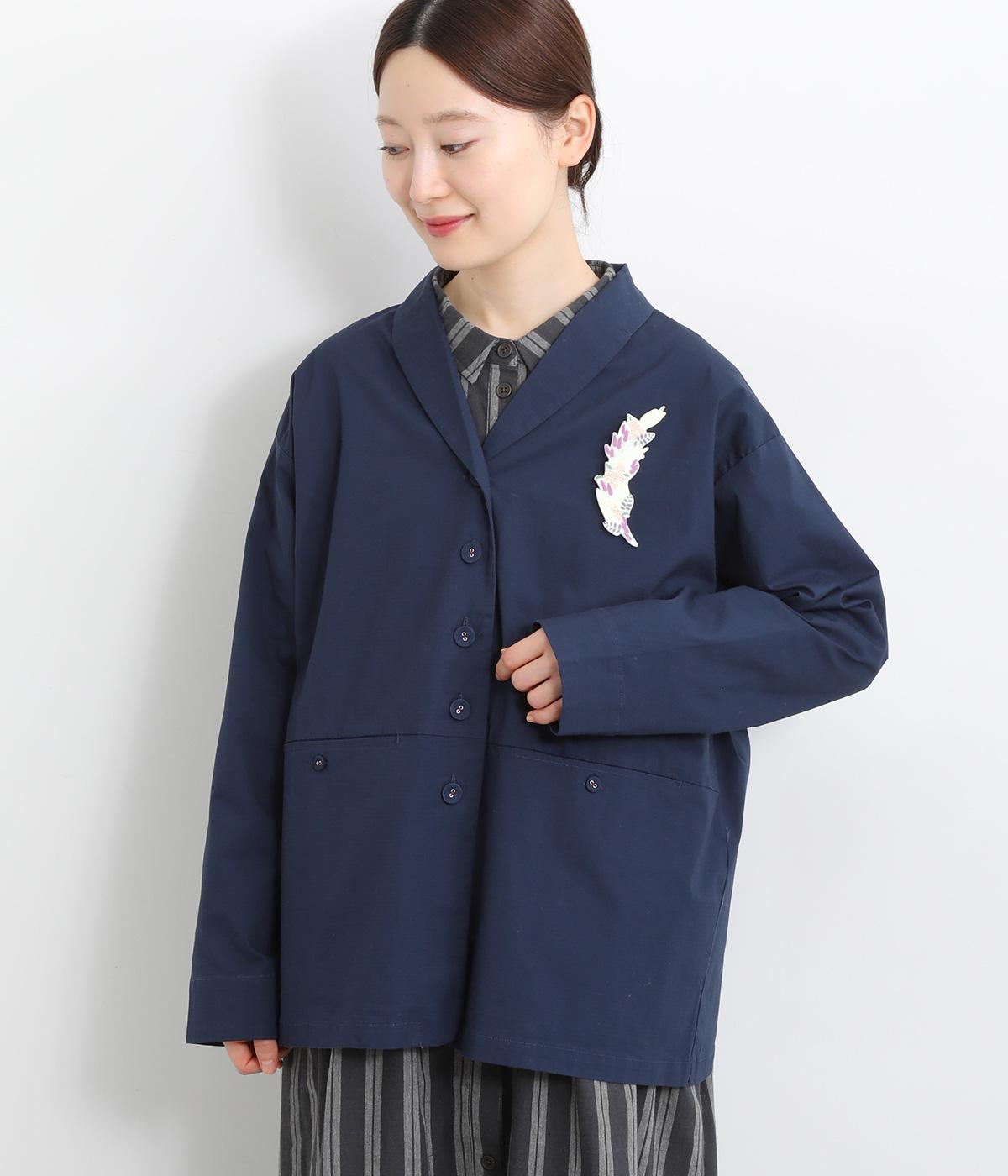 緩やかなカーブを描くショールカラーが上品なジャケット。前開きのボタンはあえて下部につけず、視線を上げてバランスよく見せています。キンモクセイをデザインした付属のブローチをつければ、華やかさがぐっとアップ。カジュアルにもきれいめにも着こなせる、便利な一着です。