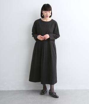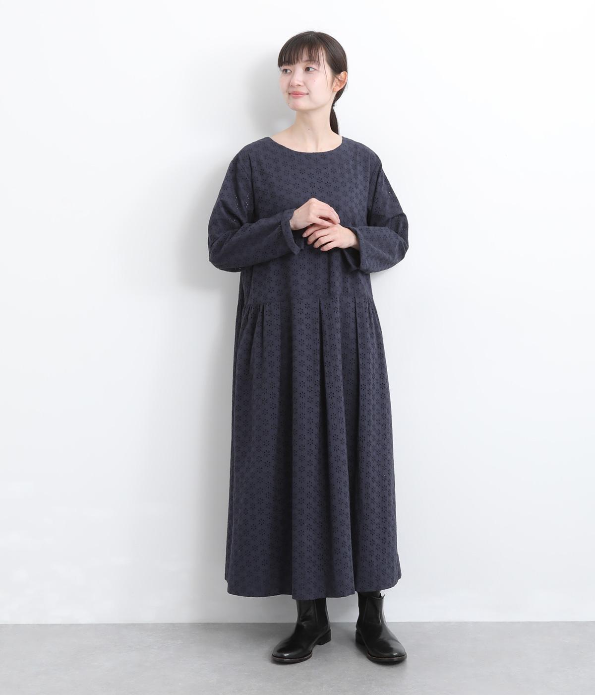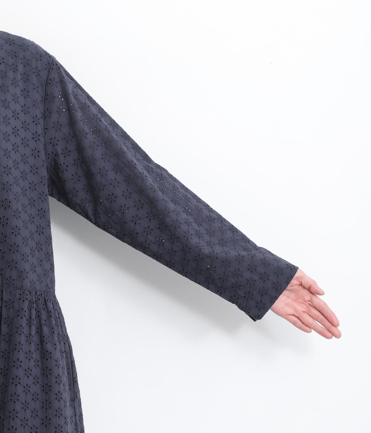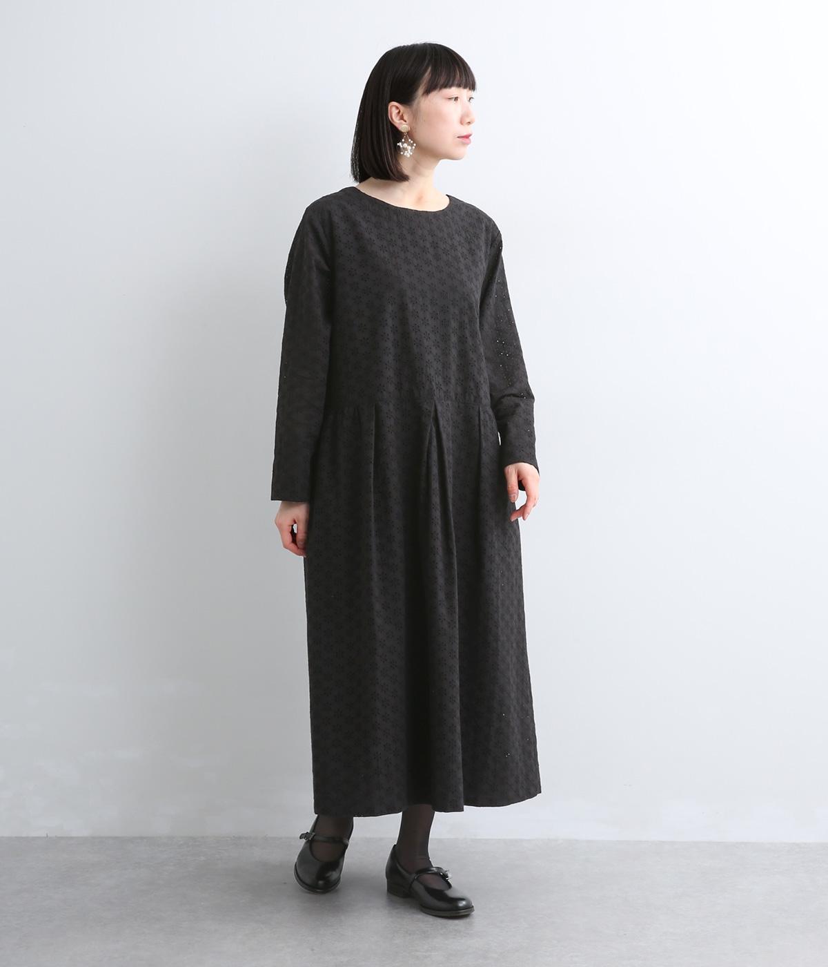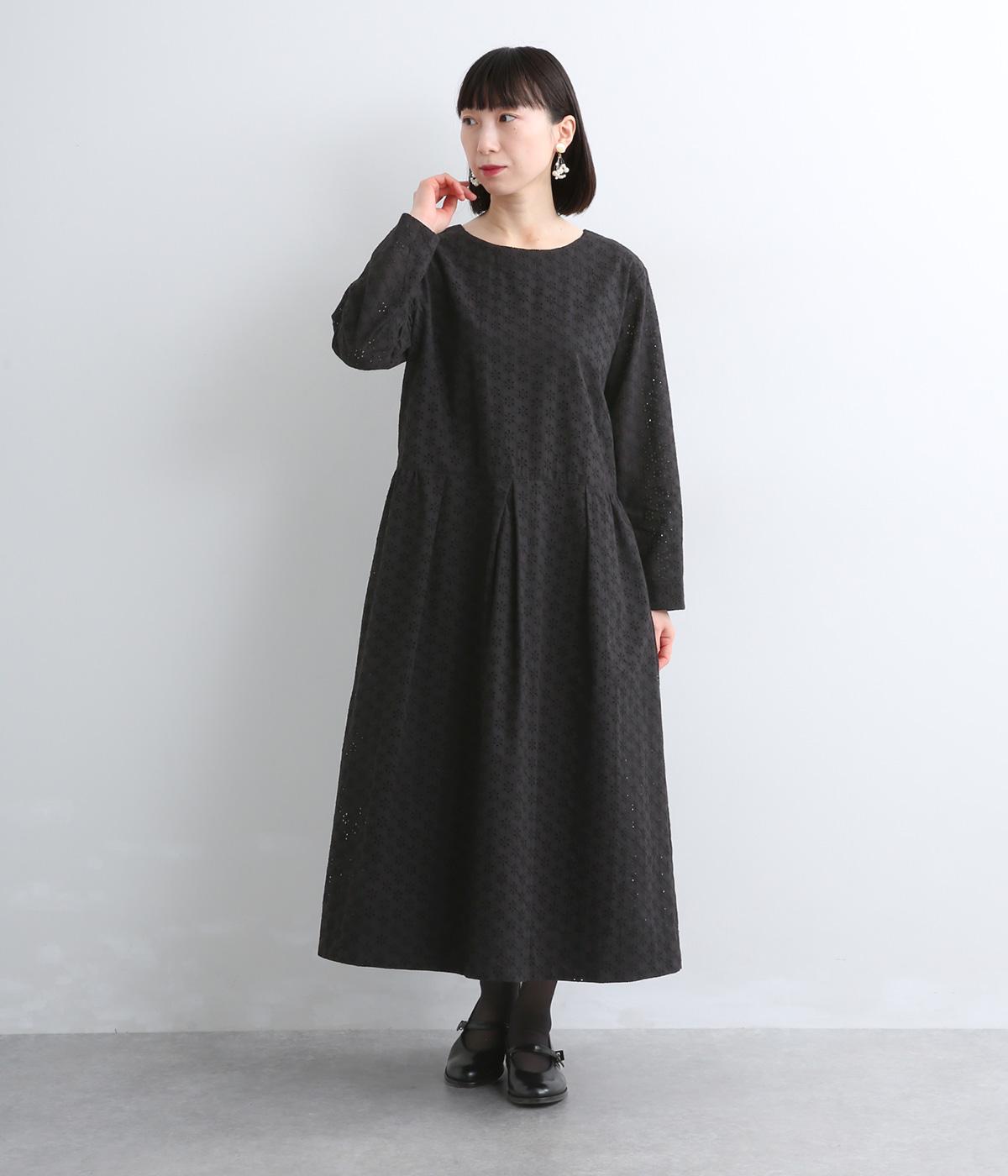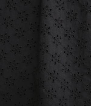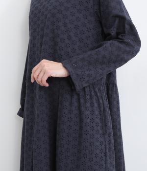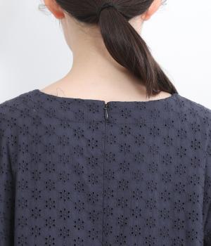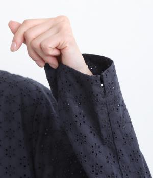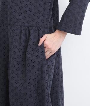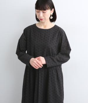 清楚でシックな印象の小花レースです。袖は裏地をつけず、腕のラインを拾いにくいほのかな透け具合で、軽やかさもたらします。ウエストの切替からふんわりと上品に広がり、動きに合わせて優雅なシルエットを描きます。