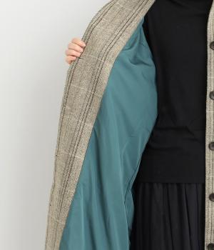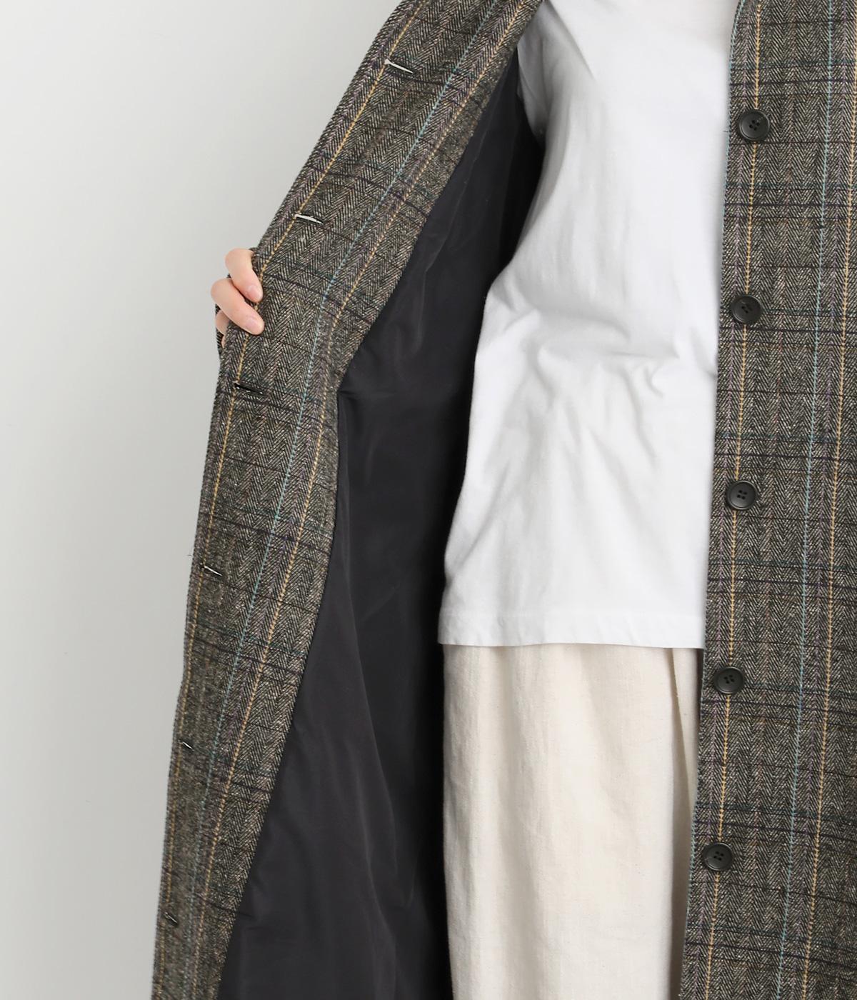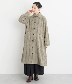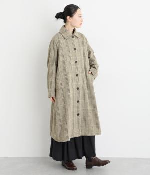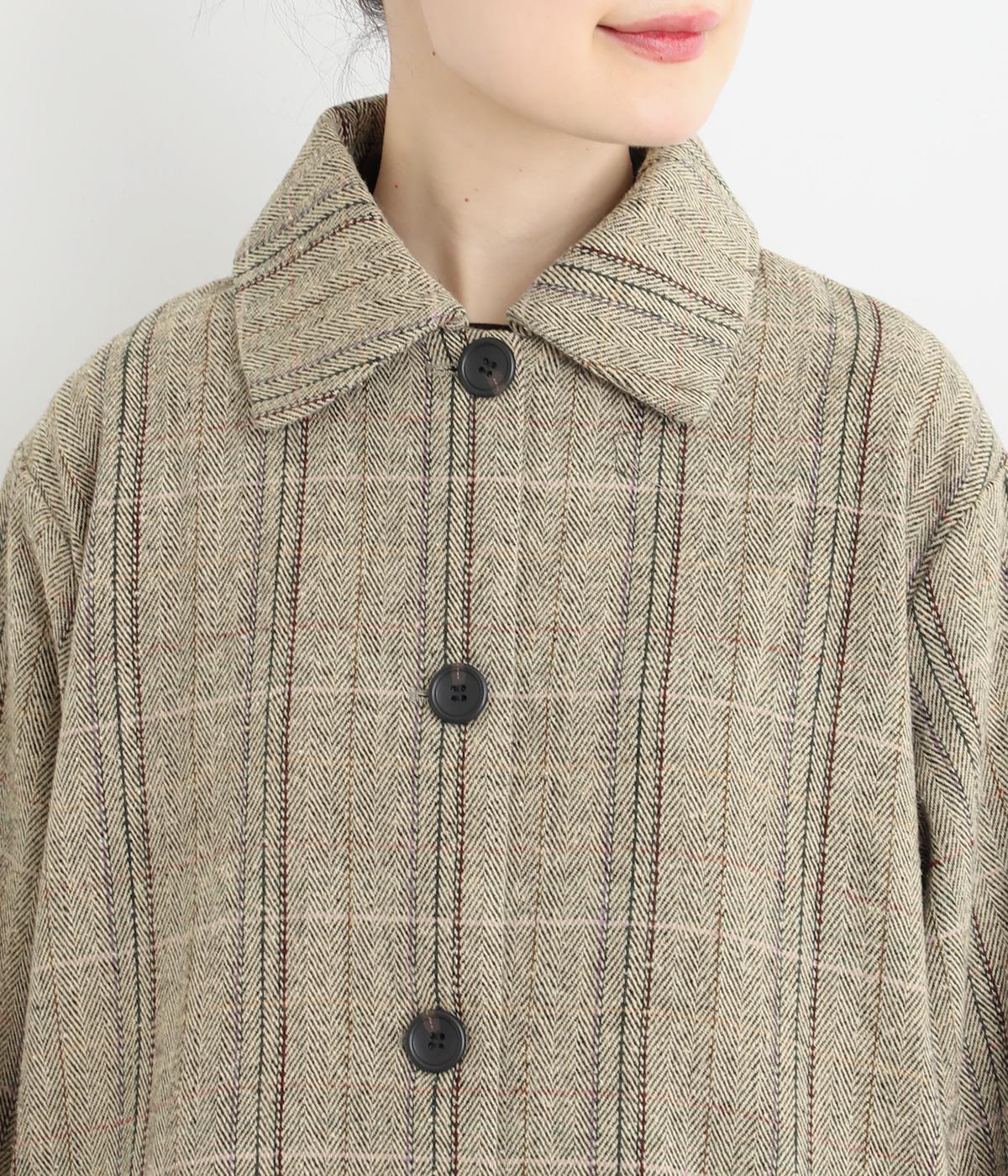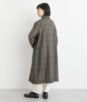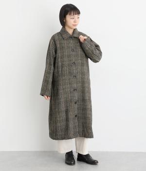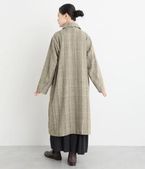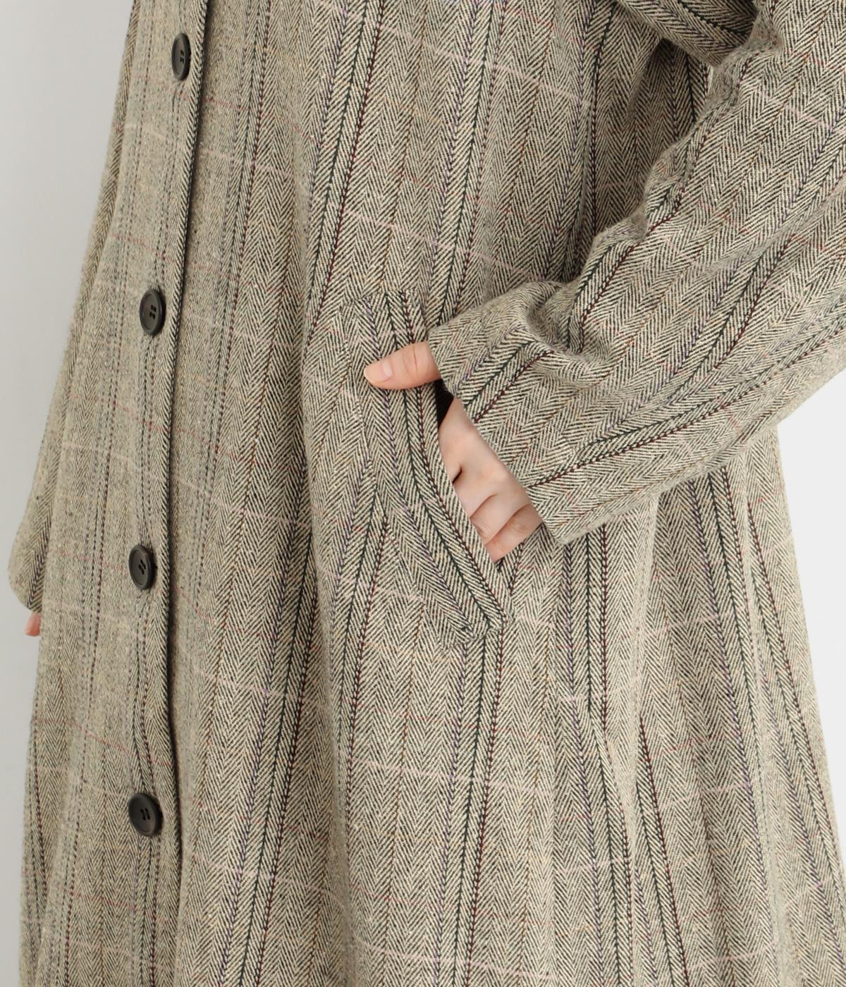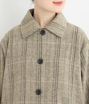 ヘリンボーンに細いラインを重ねて表現した、奥行きのあるチェック柄が魅力です。さりげない多色使いを散りばめ、クラシカルな雰囲気のなかにも遊び心を添えています。ゆったりしたシルエットが体を包み込み、重ね着の多い季節でも快適。大きめの襟や、縦のラインを強調する柄が、スタイルをすっきりと見せてくれます。