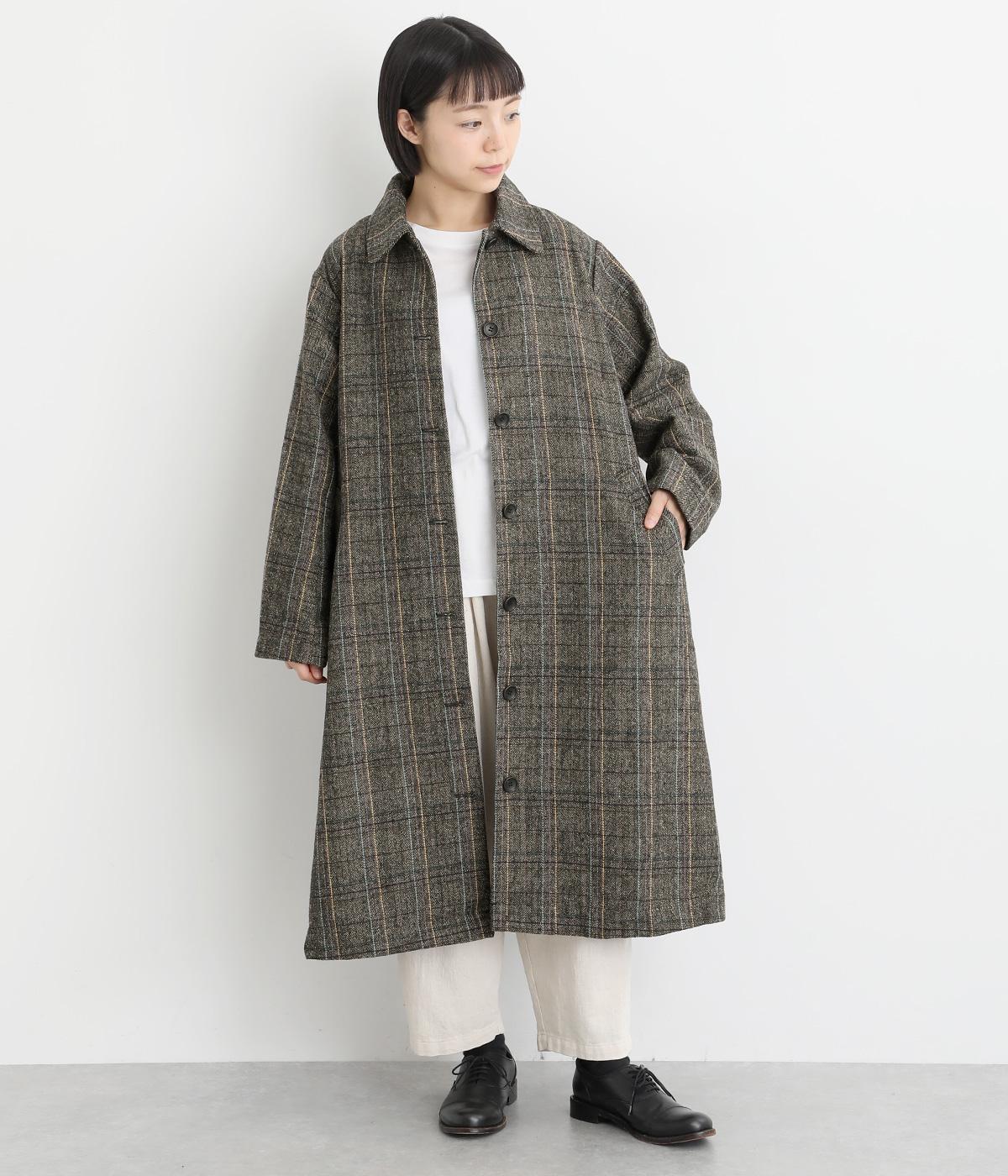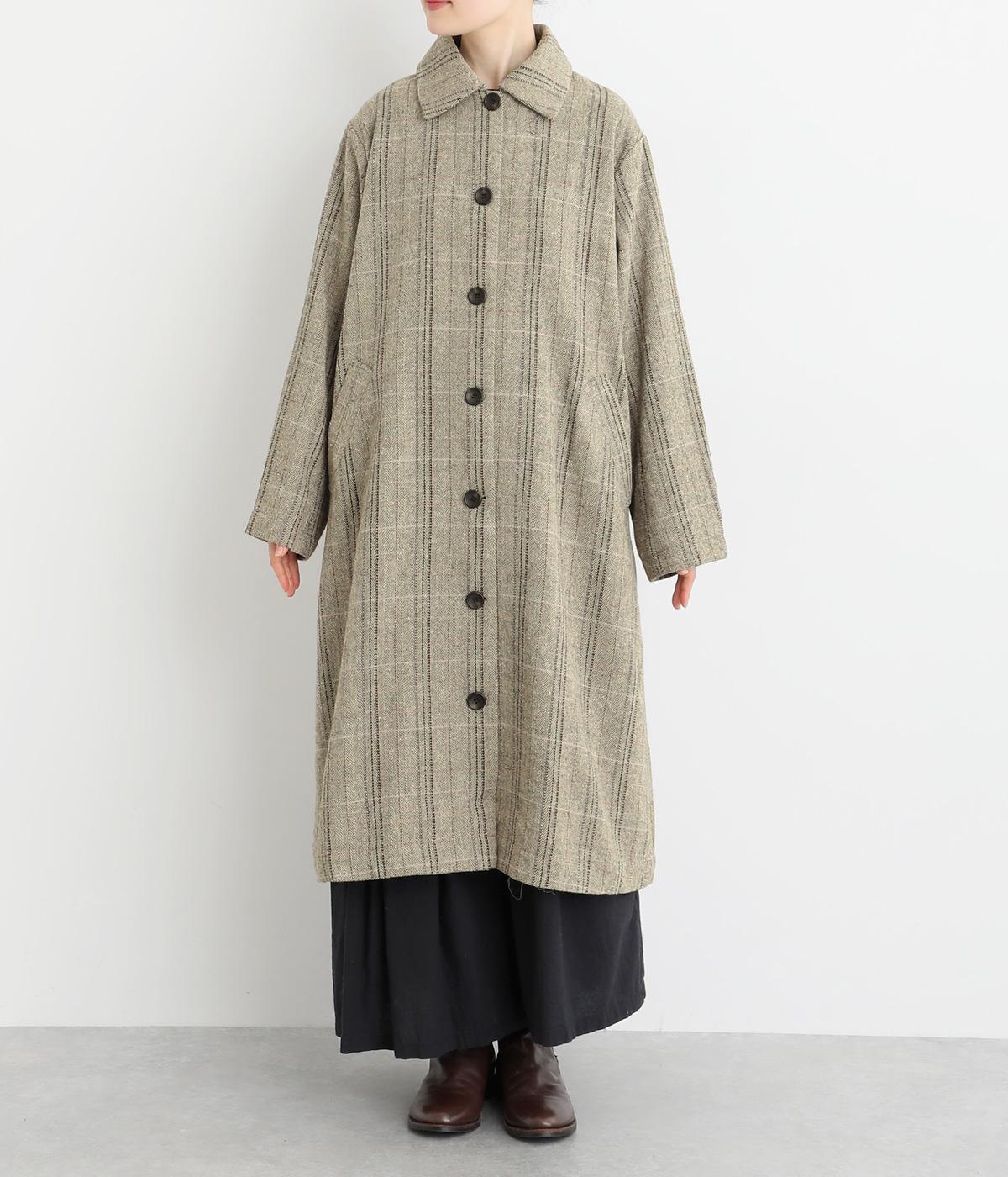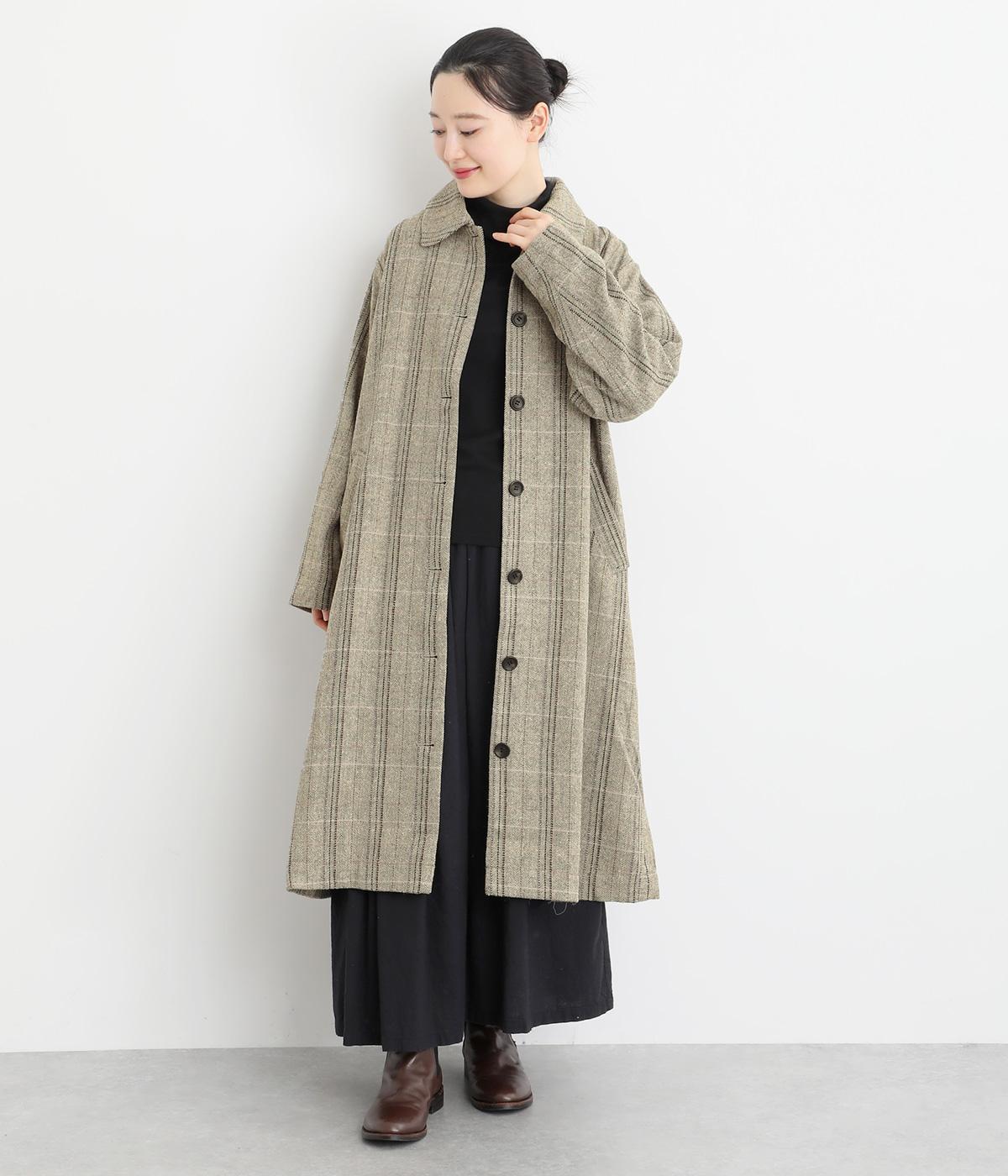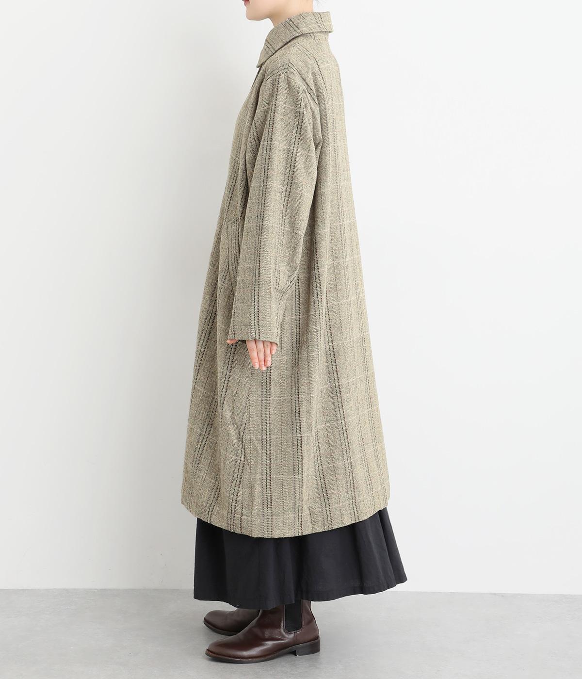 ヘリンボーンに細いラインを重ねて表現した、奥行きのあるチェック柄が魅力です。さりげない多色使いを散りばめ、クラシカルな雰囲気のなかにも遊び心を添えています。ゆったりしたシルエットが体を包み込み、重ね着の多い季節でも快適。大きめの襟や、縦のラインを強調する柄が、スタイルをすっきりと見せてくれます。