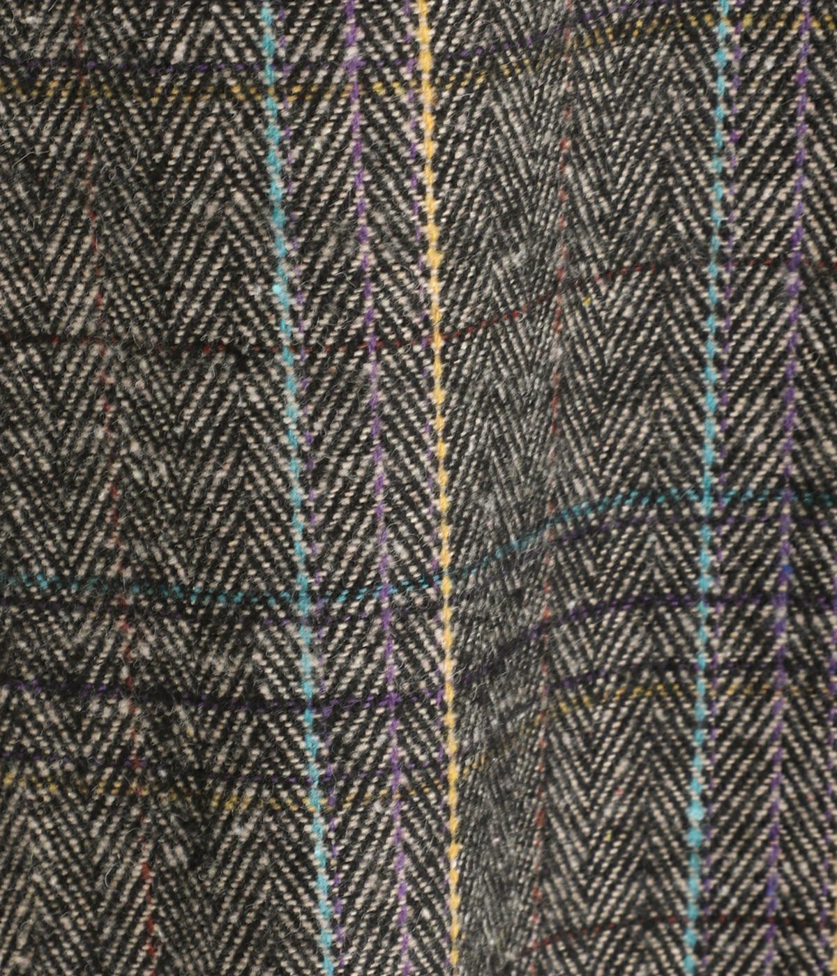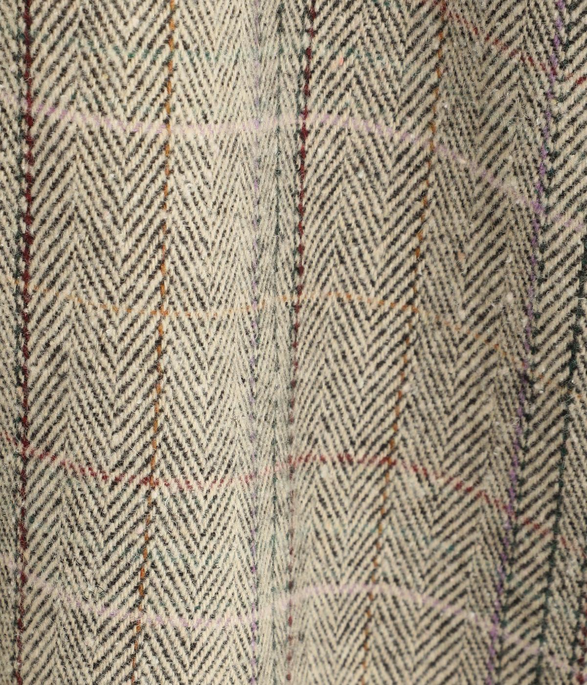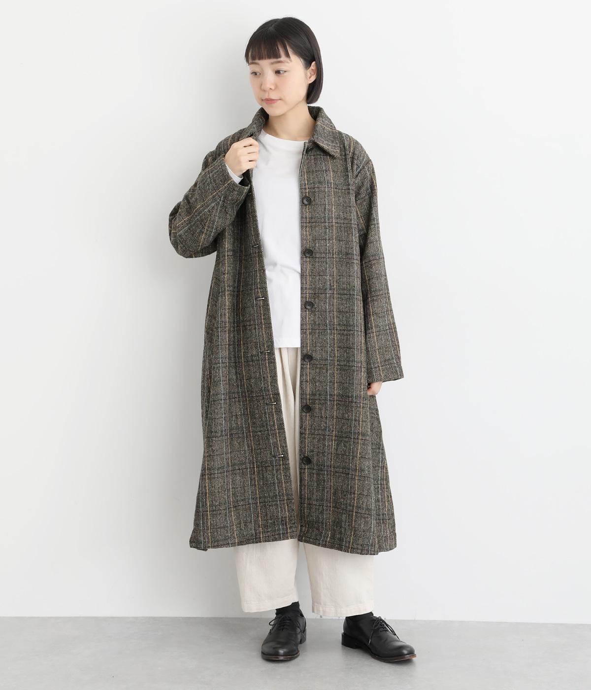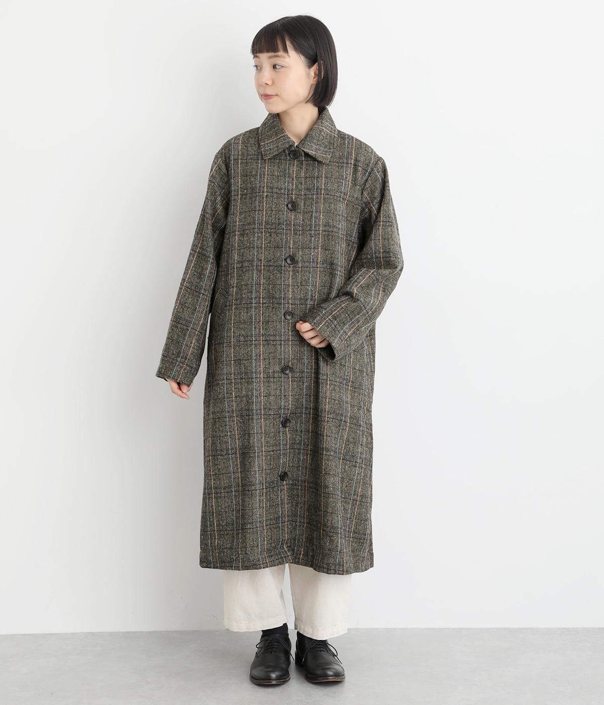 ヘリンボーンに細いラインを重ねて表現した、奥行きのあるチェック柄が魅力です。さりげない多色使いを散りばめ、クラシカルな雰囲気のなかにも遊び心を添えています。ゆったりしたシルエットが体を包み込み、重ね着の多い季節でも快適。大きめの襟や、縦のラインを強調する柄が、スタイルをすっきりと見せてくれます。