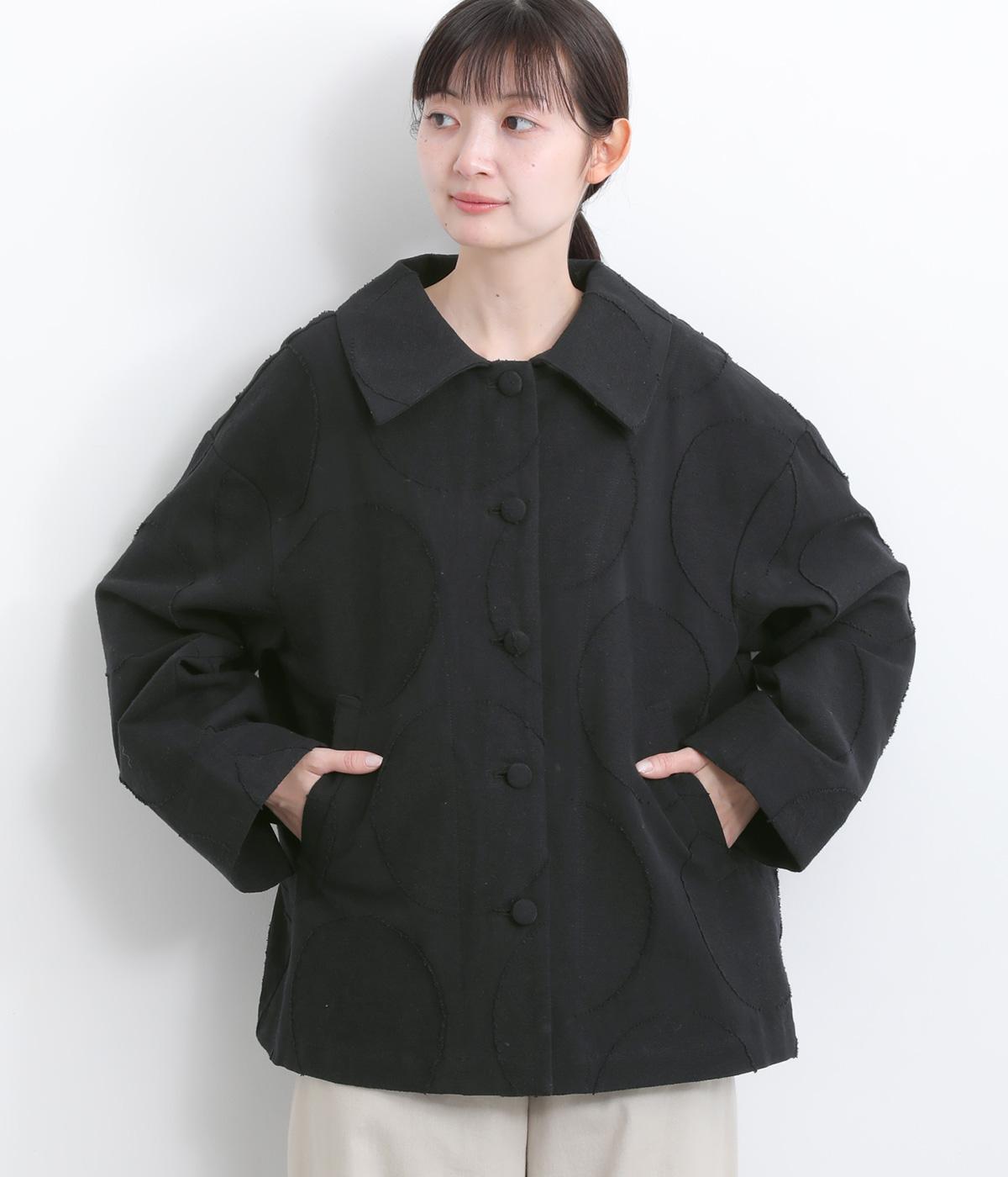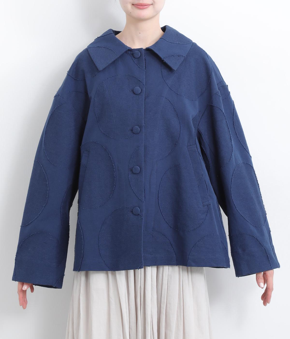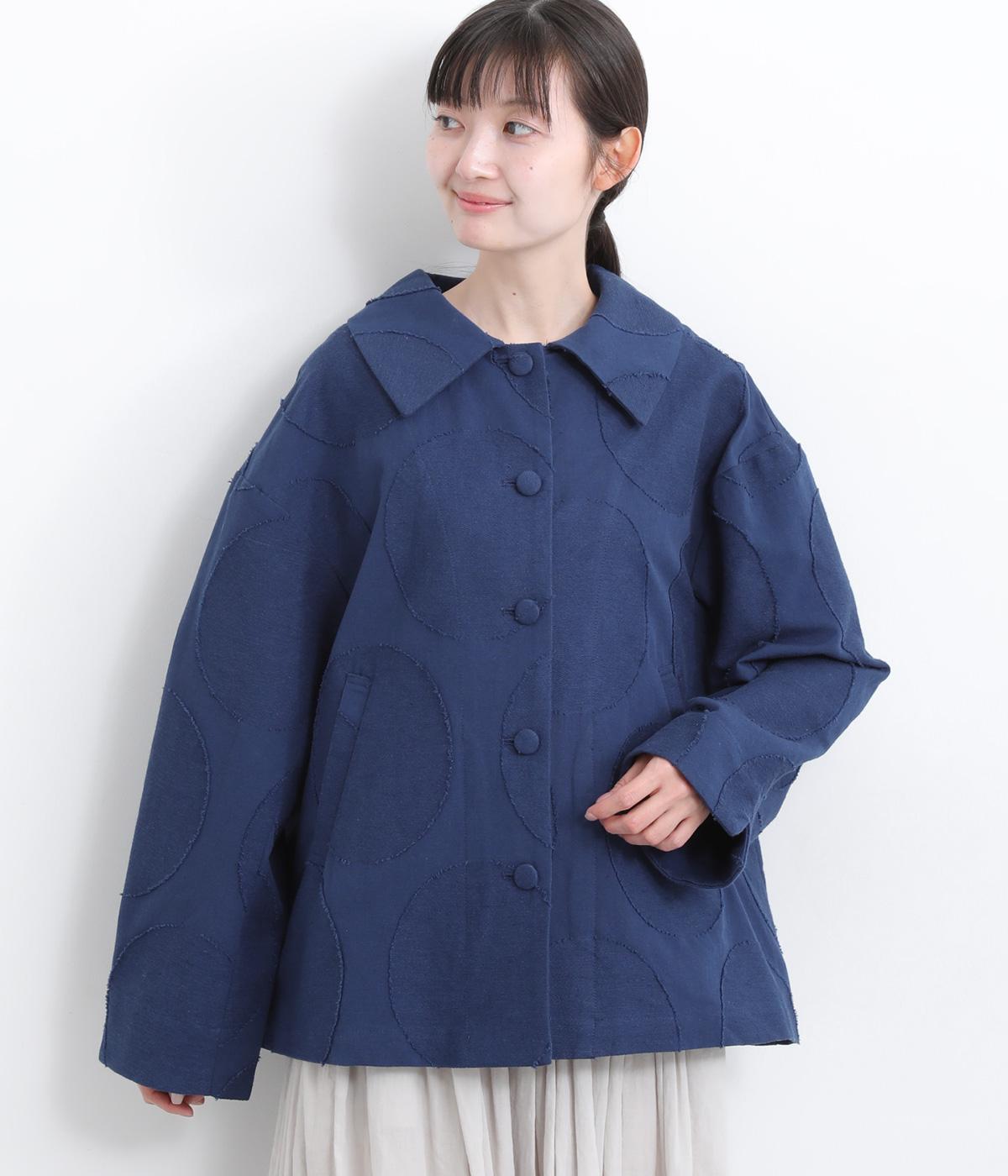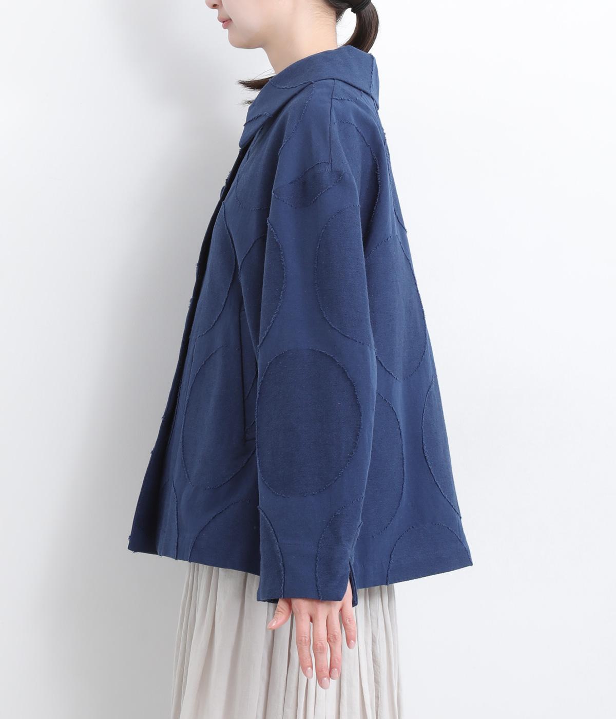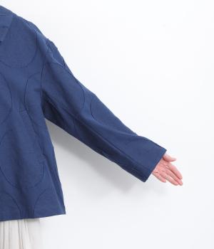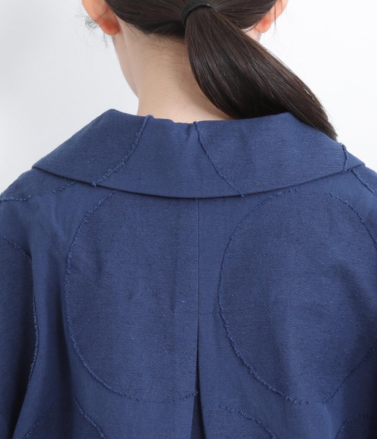 大胆なのにさりげなくなじむドット柄が奥行きのある表情をつくります。印象的な大きな襟は顔まわりをすっきりと見せてくれます。共布のくるみボタンもかわいらしいアクセントに。抜け感のあるスリット入りの袖は折り返しても◎。