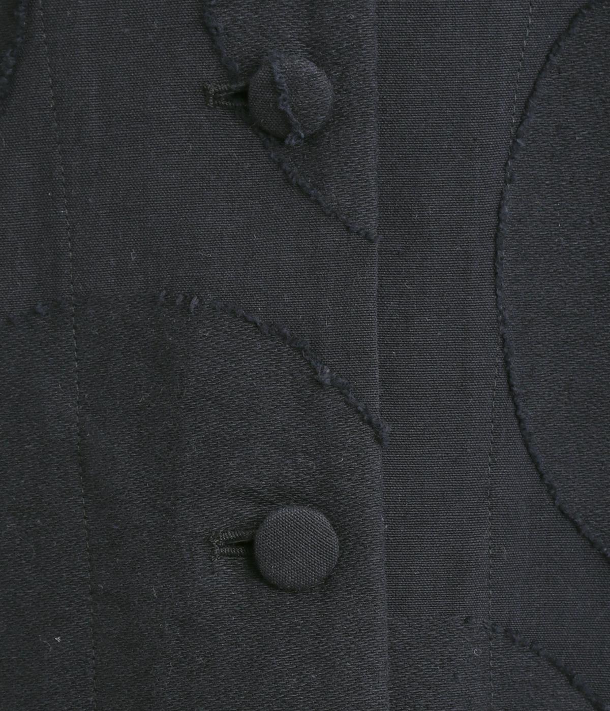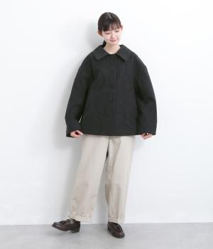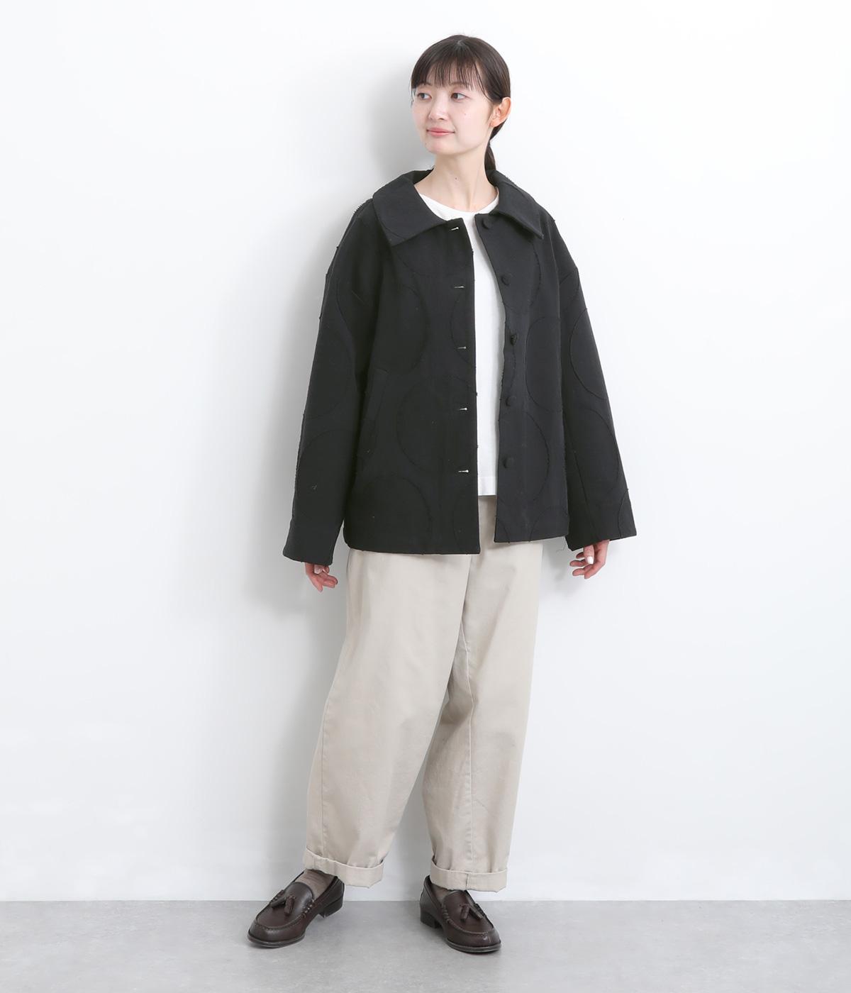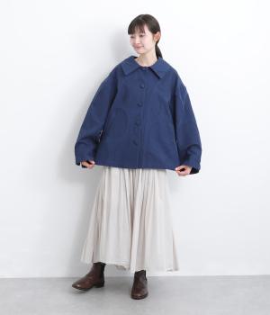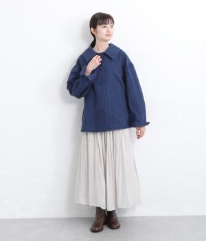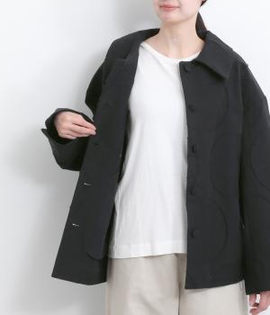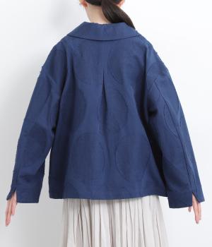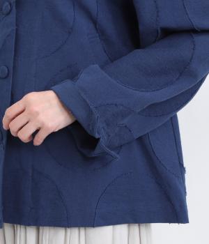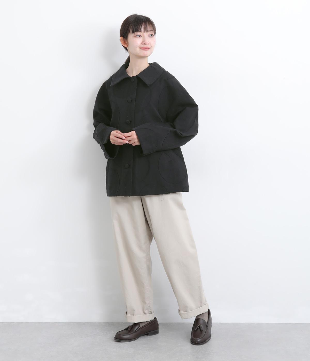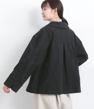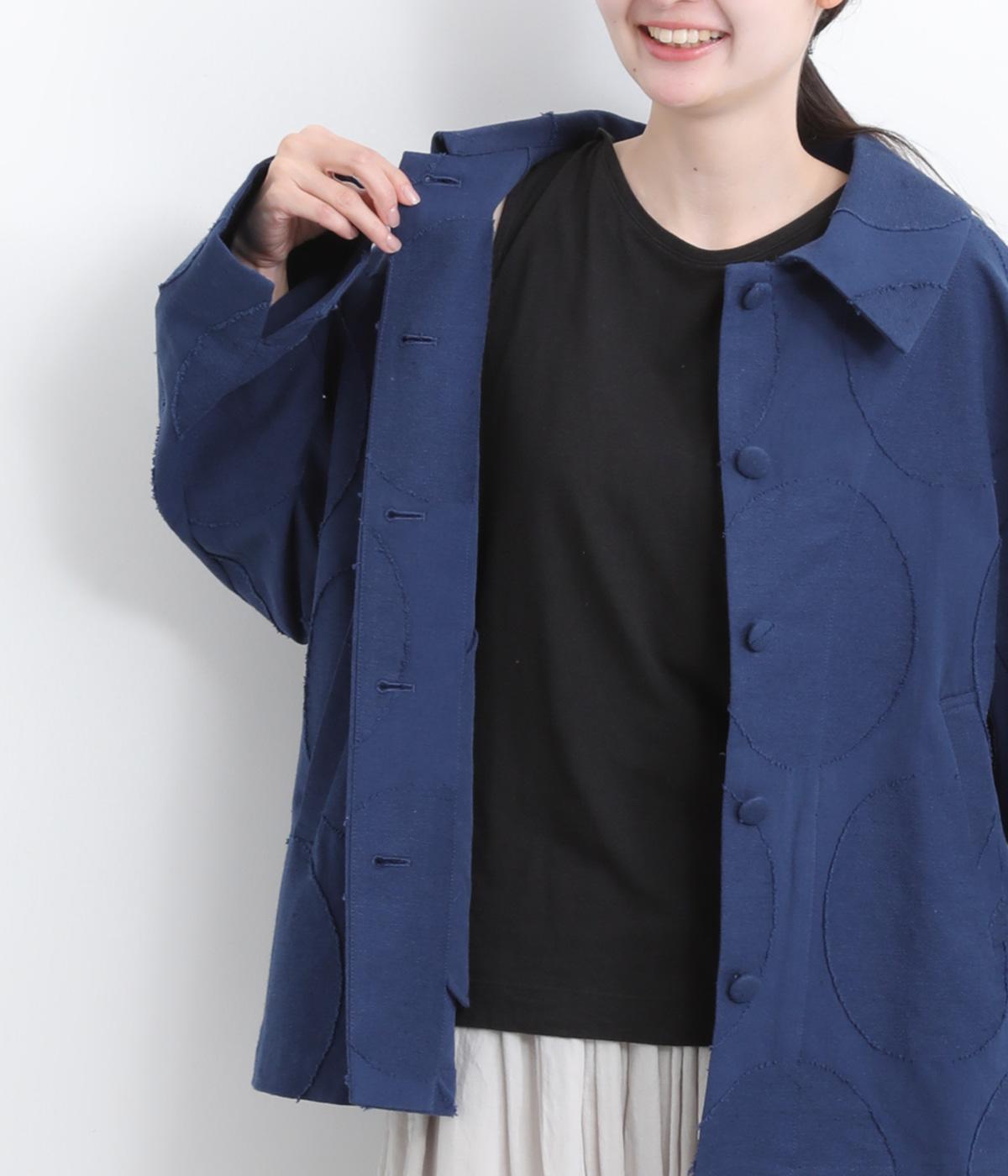 大胆なのにさりげなくなじむドット柄が奥行きのある表情をつくります。印象的な大きな襟は顔まわりをすっきりと見せてくれます。共布のくるみボタンもかわいらしいアクセントに。抜け感のあるスリット入りの袖は折り返しても◎。