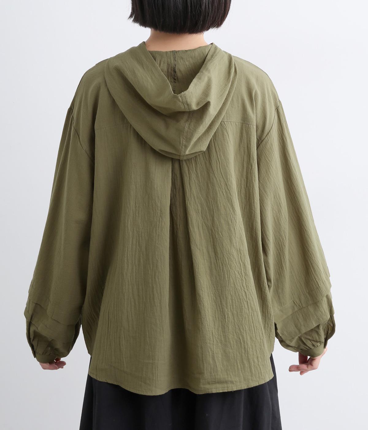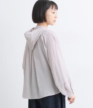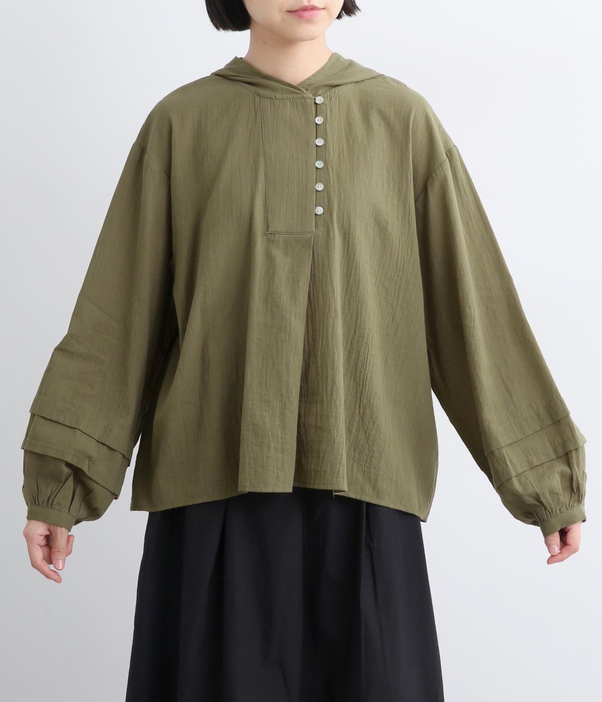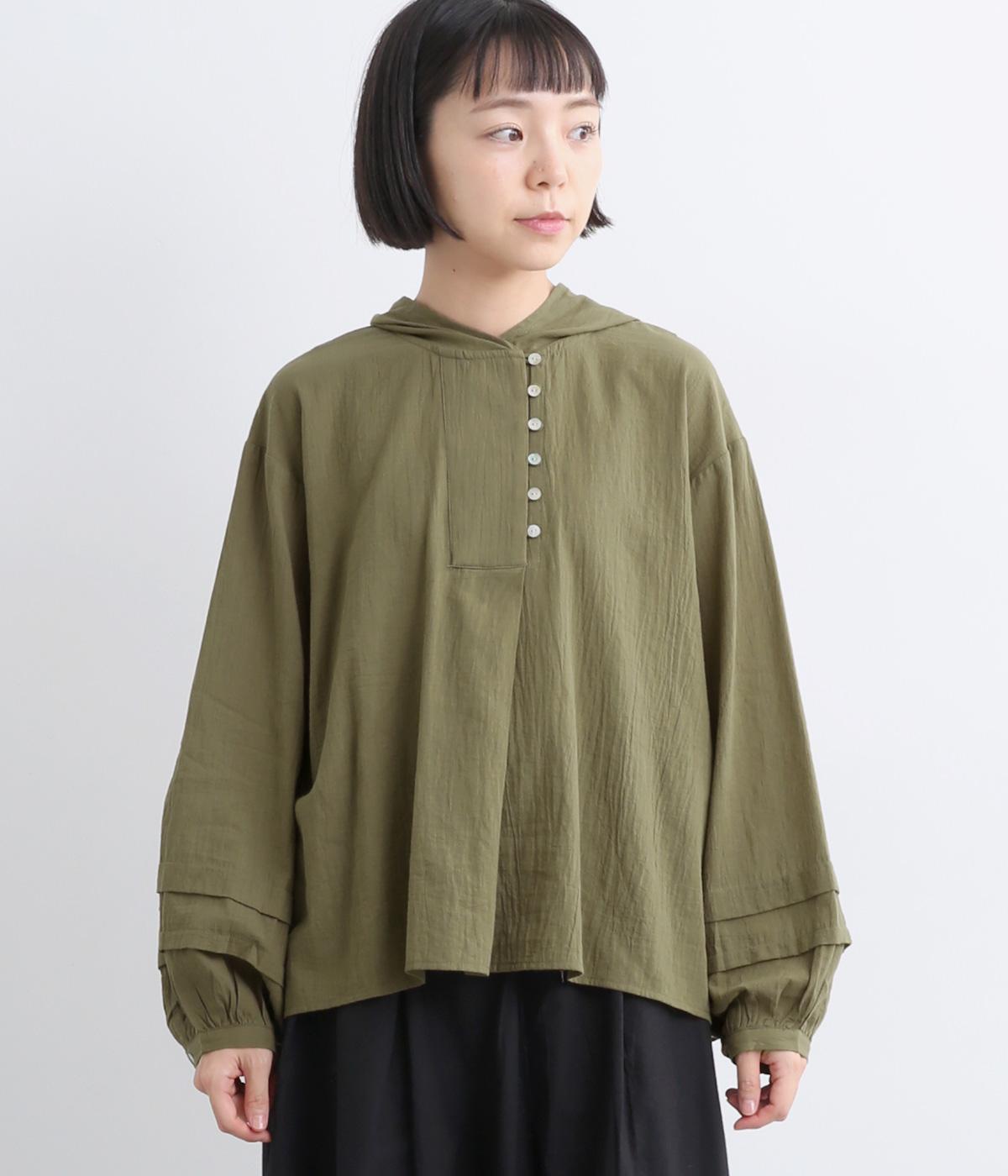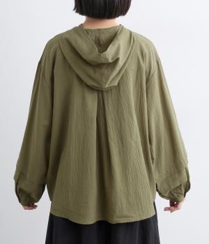 フードでカジュアル感がありながら、袖のぽわんとしたシルエットや施されたプリーツがかわいらしさを演出します。胸元のループボタンもどこかレトロな雰囲気に。こなれ感のある一枚に仕上がっています。