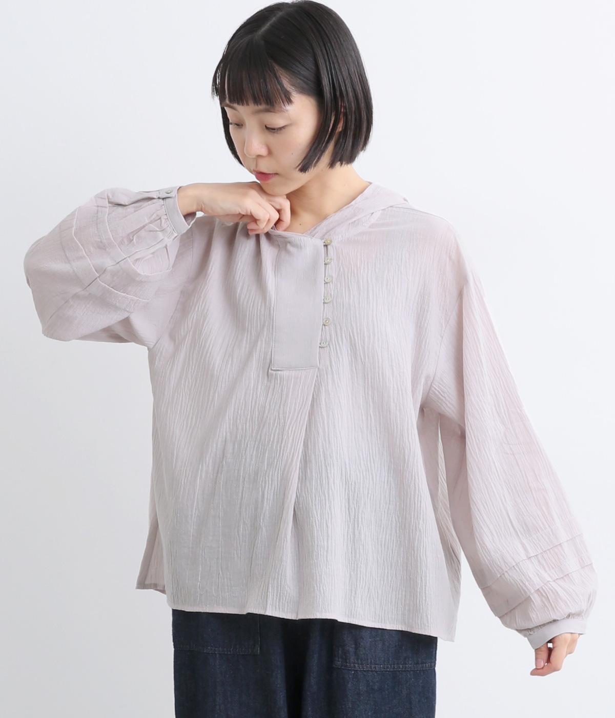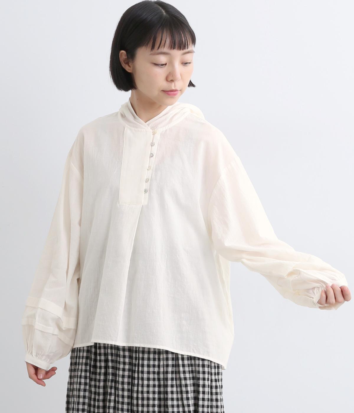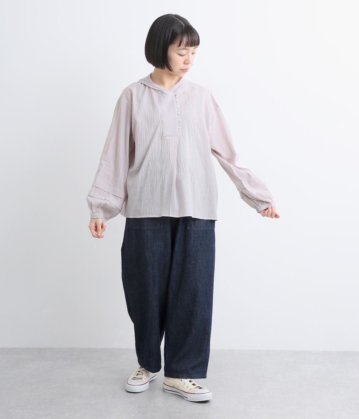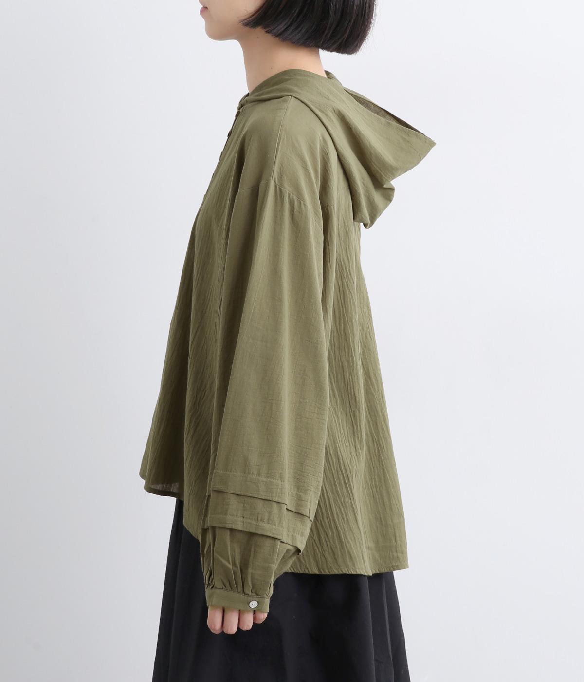 フードでカジュアル感がありながら、袖のぽわんとしたシルエットや施されたプリーツがかわいらしさを演出します。胸元のループボタンもどこかレトロな雰囲気に。こなれ感のある一枚に仕上がっています。