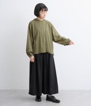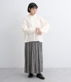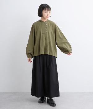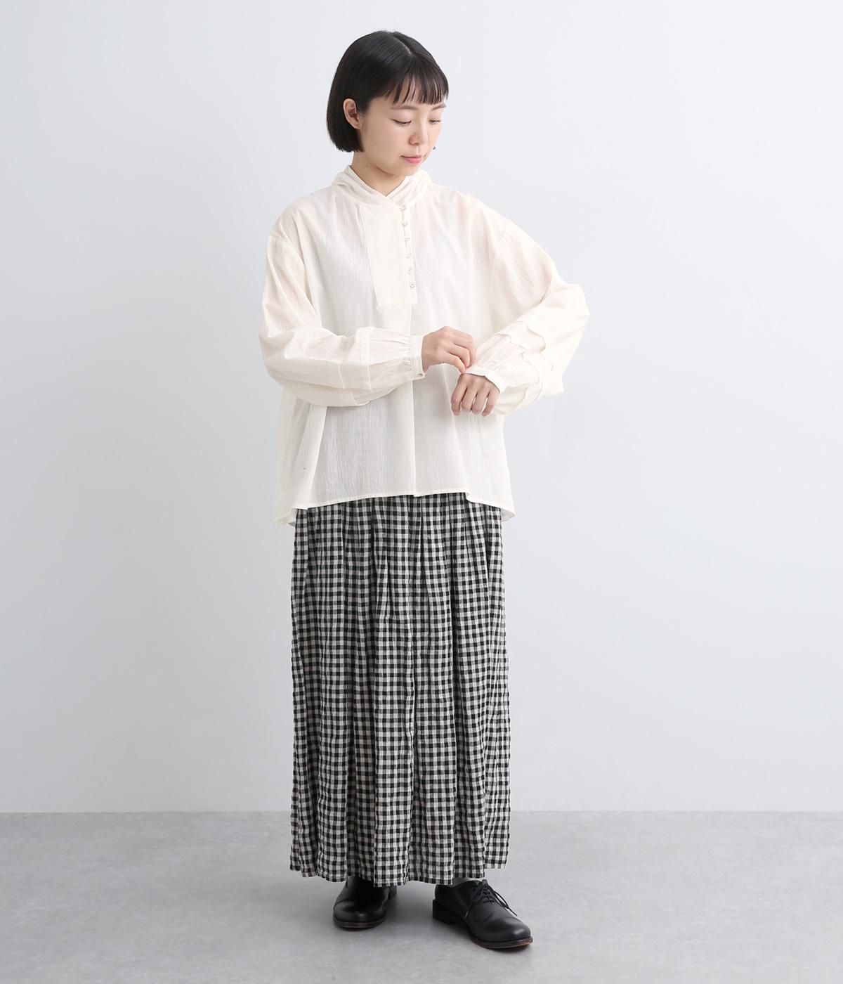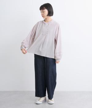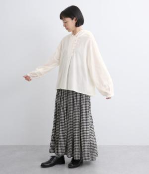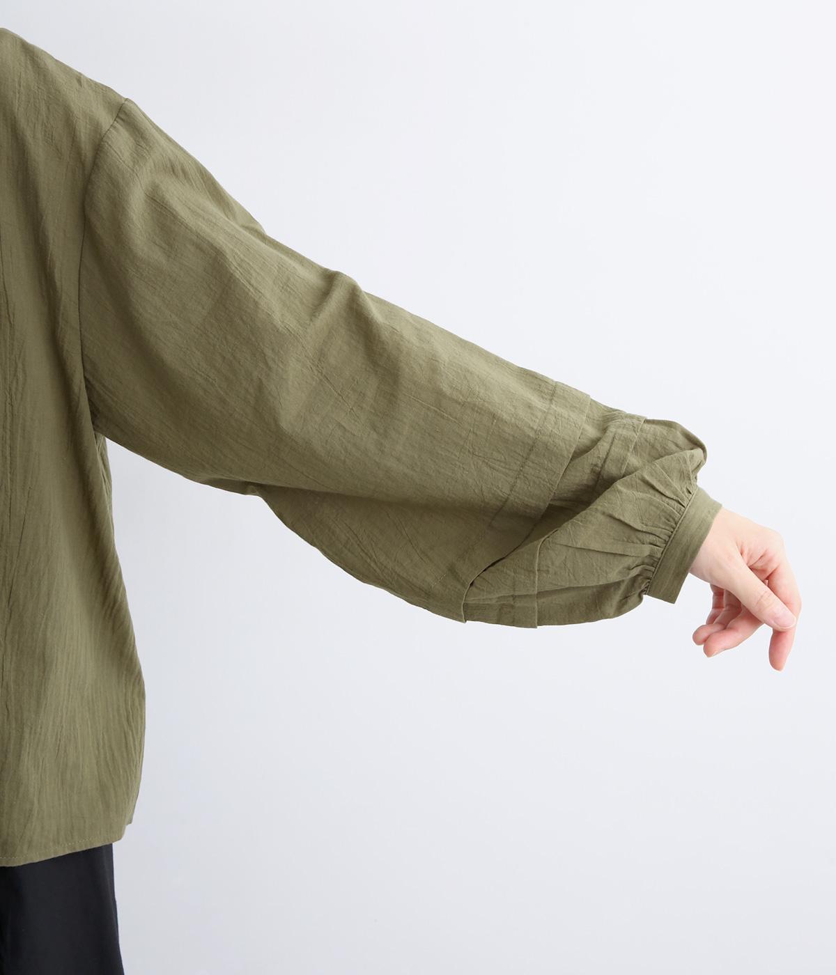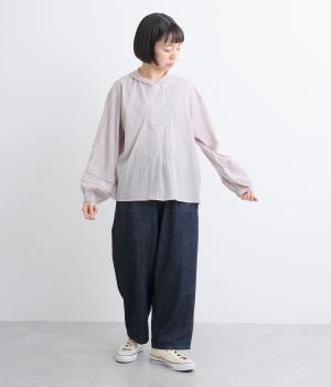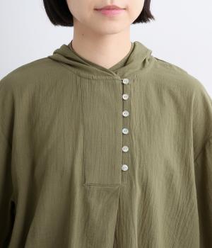 強撚糸で織った生地を加工で撚り戻したコットンクレープ生地。自然なシワ感とドライタッチが特徴です。肌ばなれよく軽やかな着心地です。