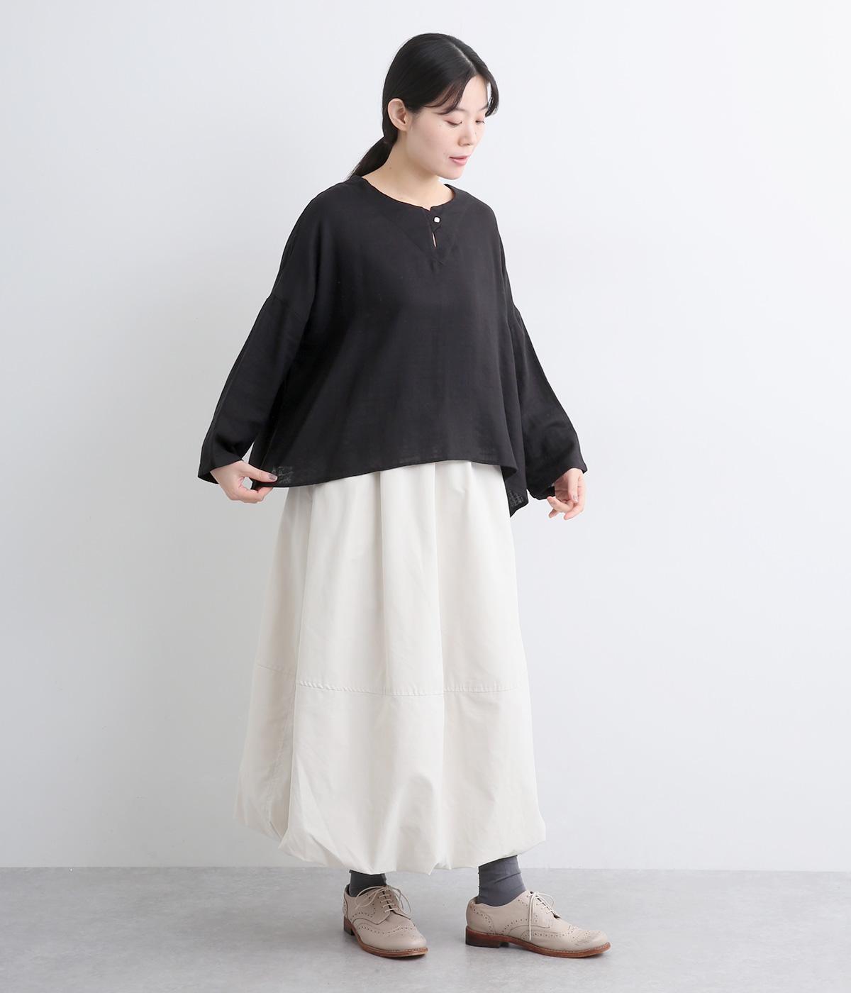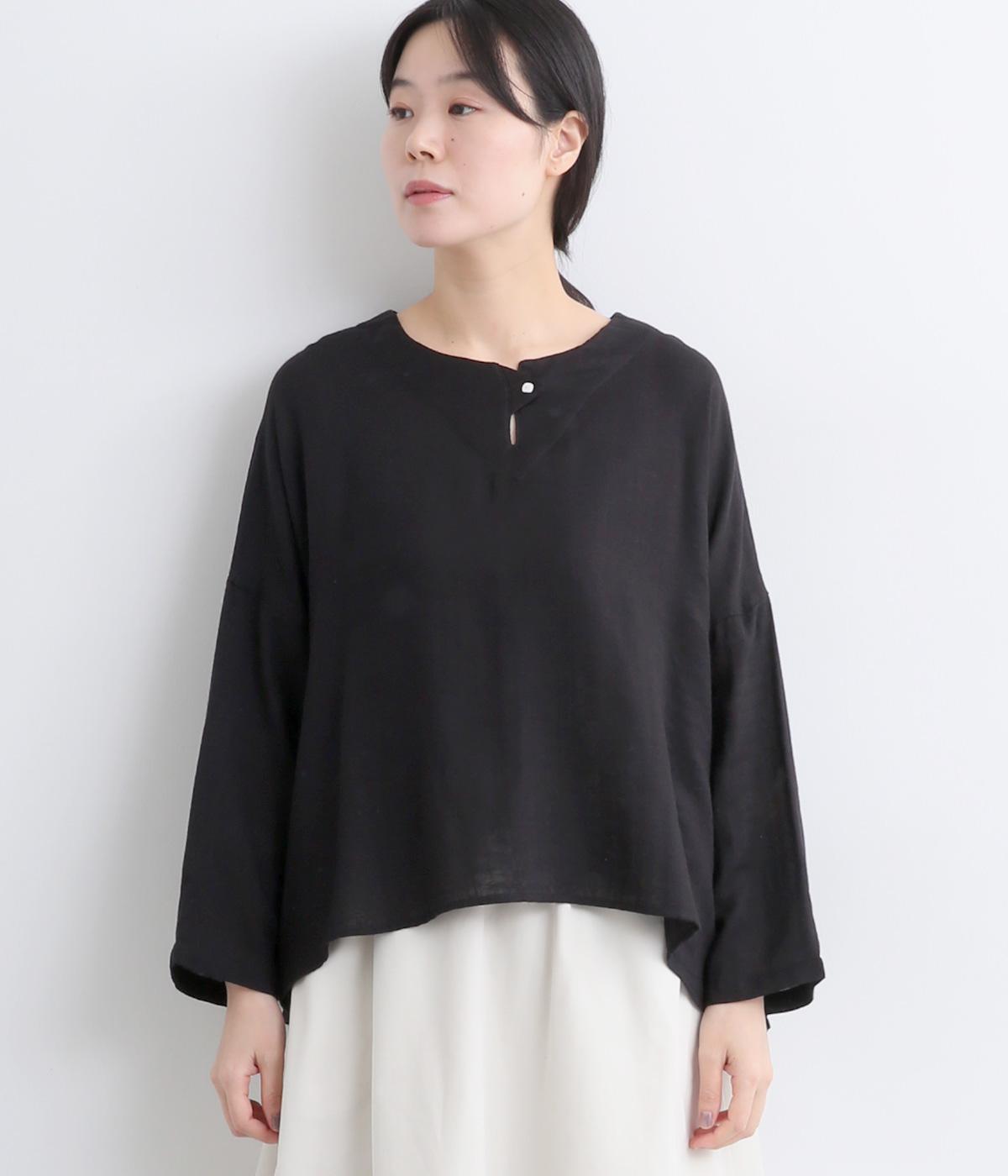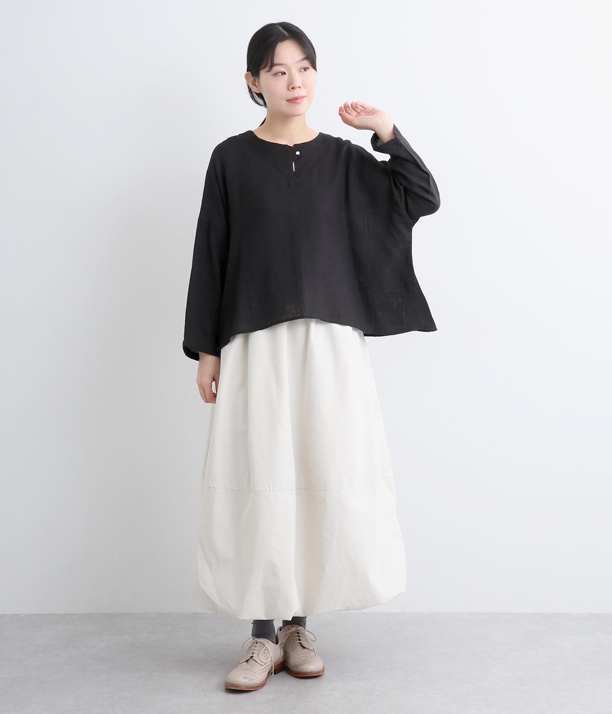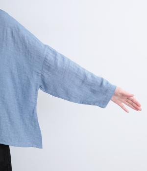 ノーカラーですっきりとした首元に、遊び心のあるボタンがさりげなく個性を添えています。ゆったりとしたドルマンスリーブとアシンメトリーな裾が豊かな表情を生み出し、体のラインを拾わずすっきりと着こなせます。
