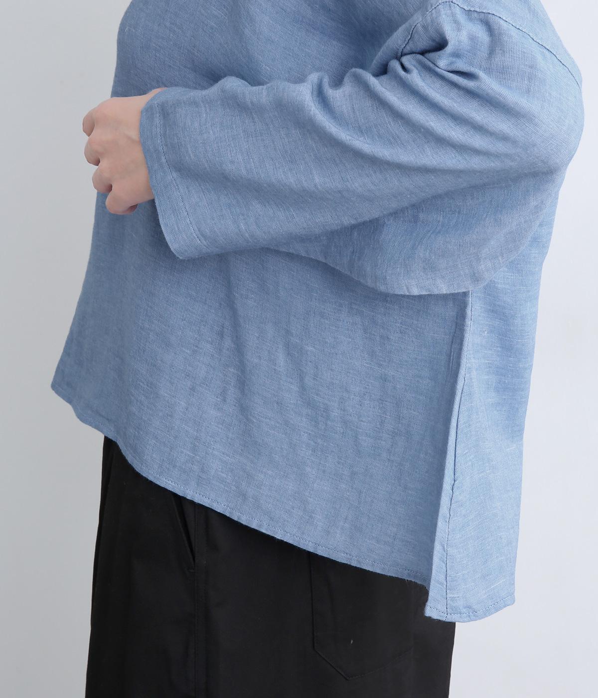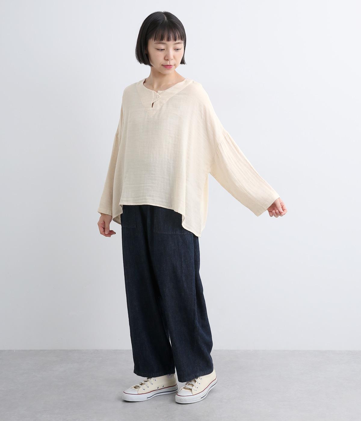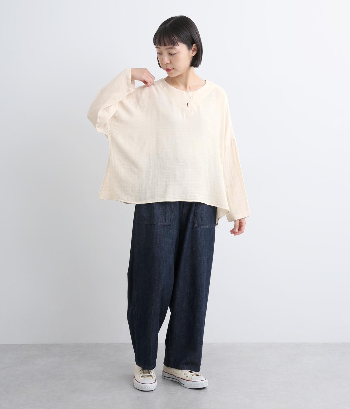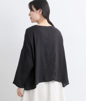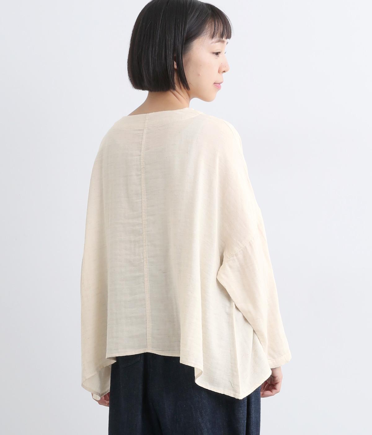 ノーカラーですっきりとした首元に、遊び心のあるボタンがさりげなく個性を添えています。ゆったりとしたドルマンスリーブとアシンメトリーな裾が豊かな表情を生み出し、体のラインを拾わずすっきりと着こなせます。