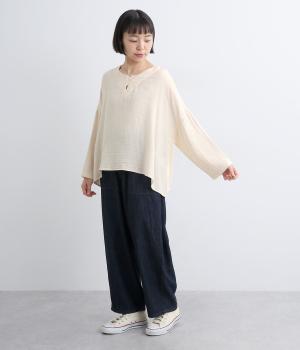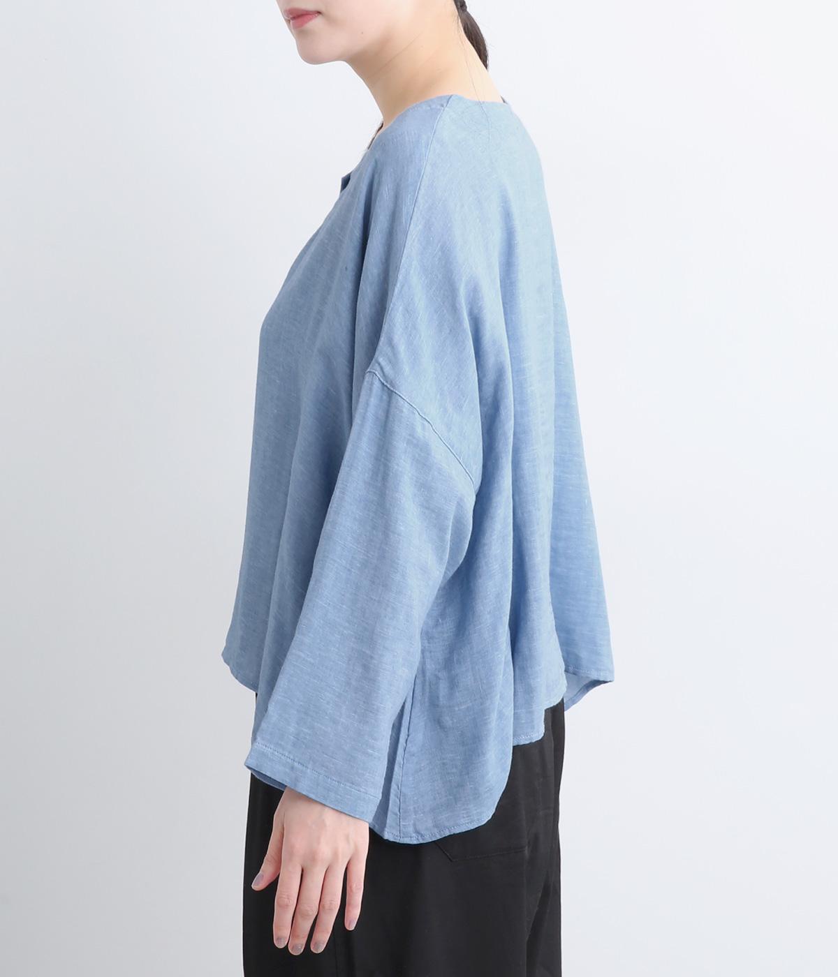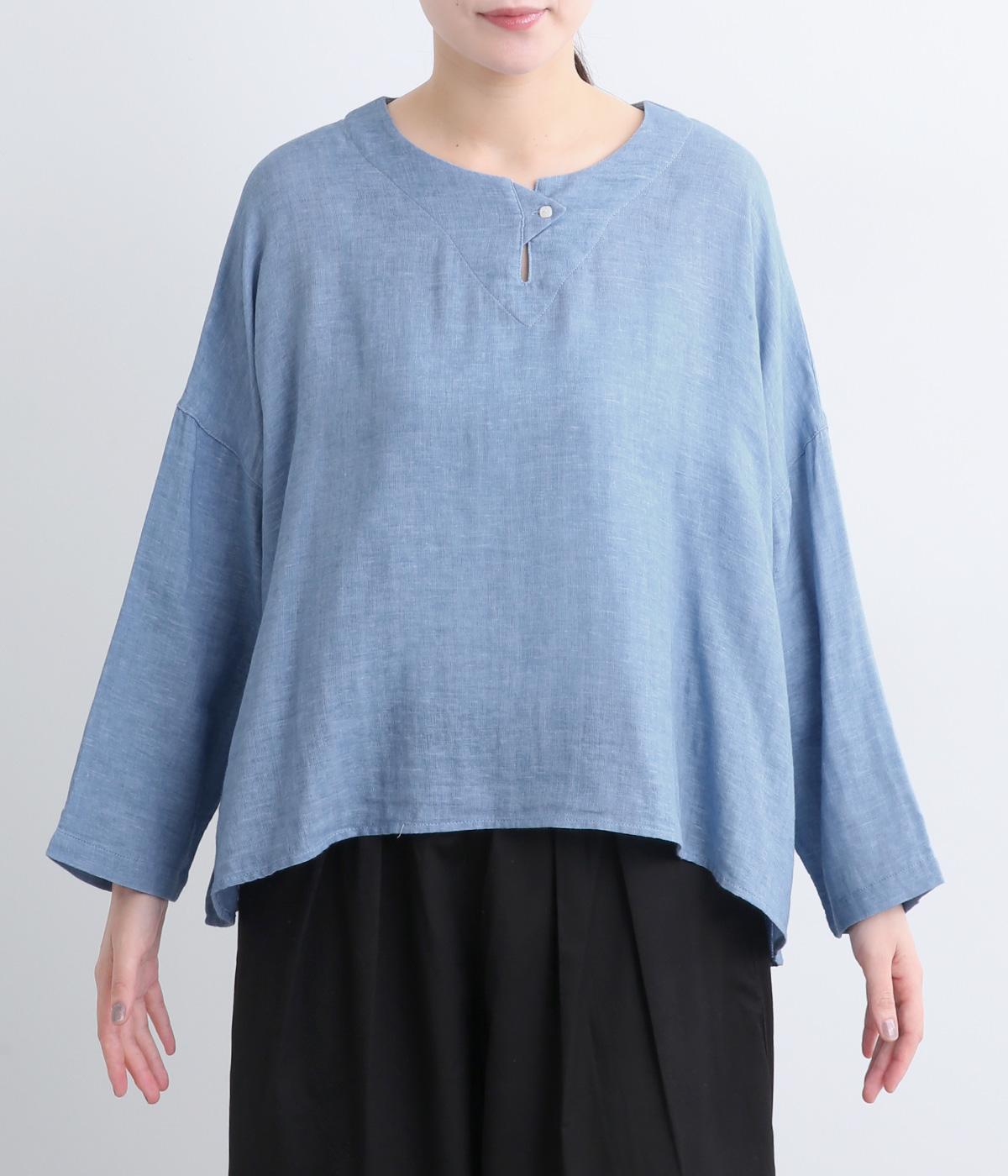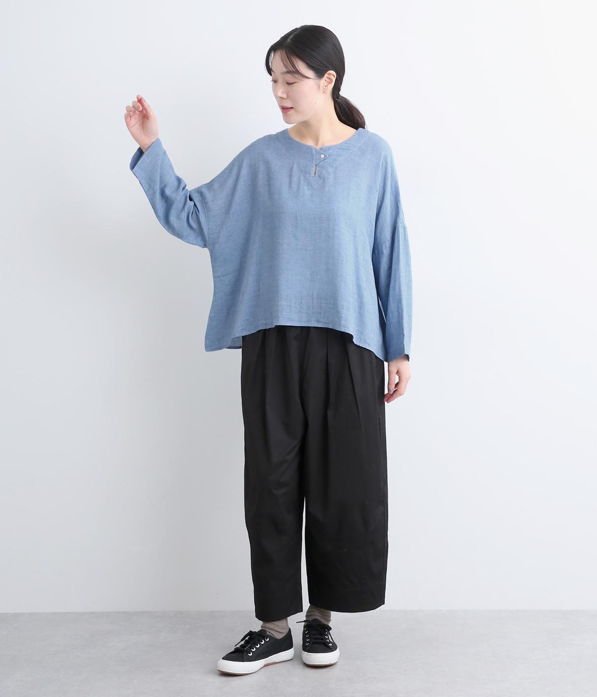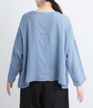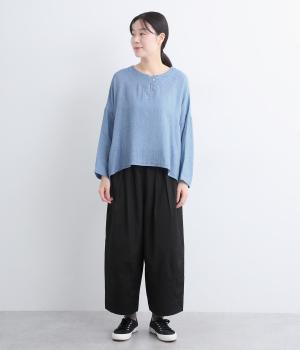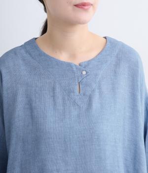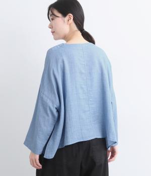 コットン、レーヨン、リネンを混紡した、軽やかで肌ざわりのよい生地です。シャンブレーの霜降りのような色ムラが特徴で、ナチュラルな風合いを楽しめます。