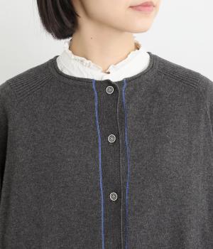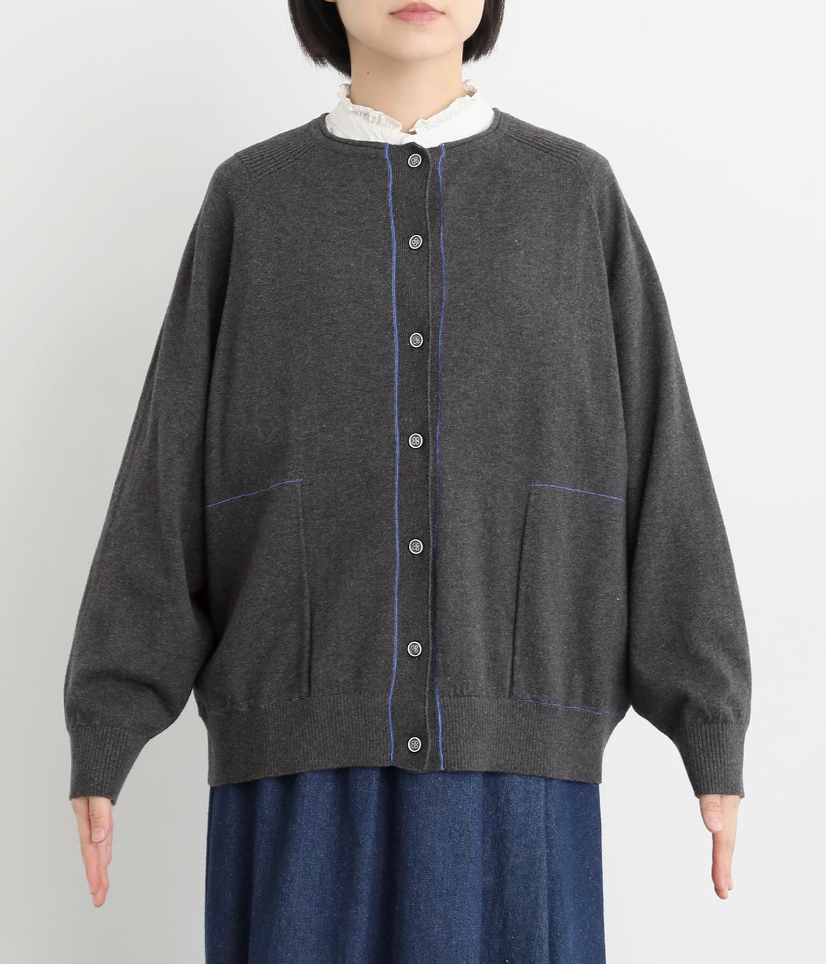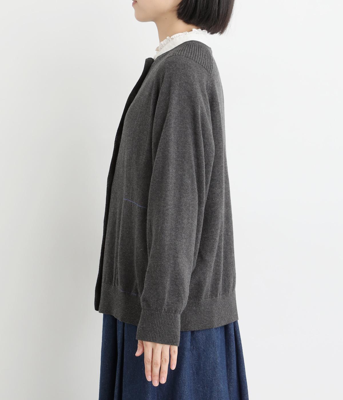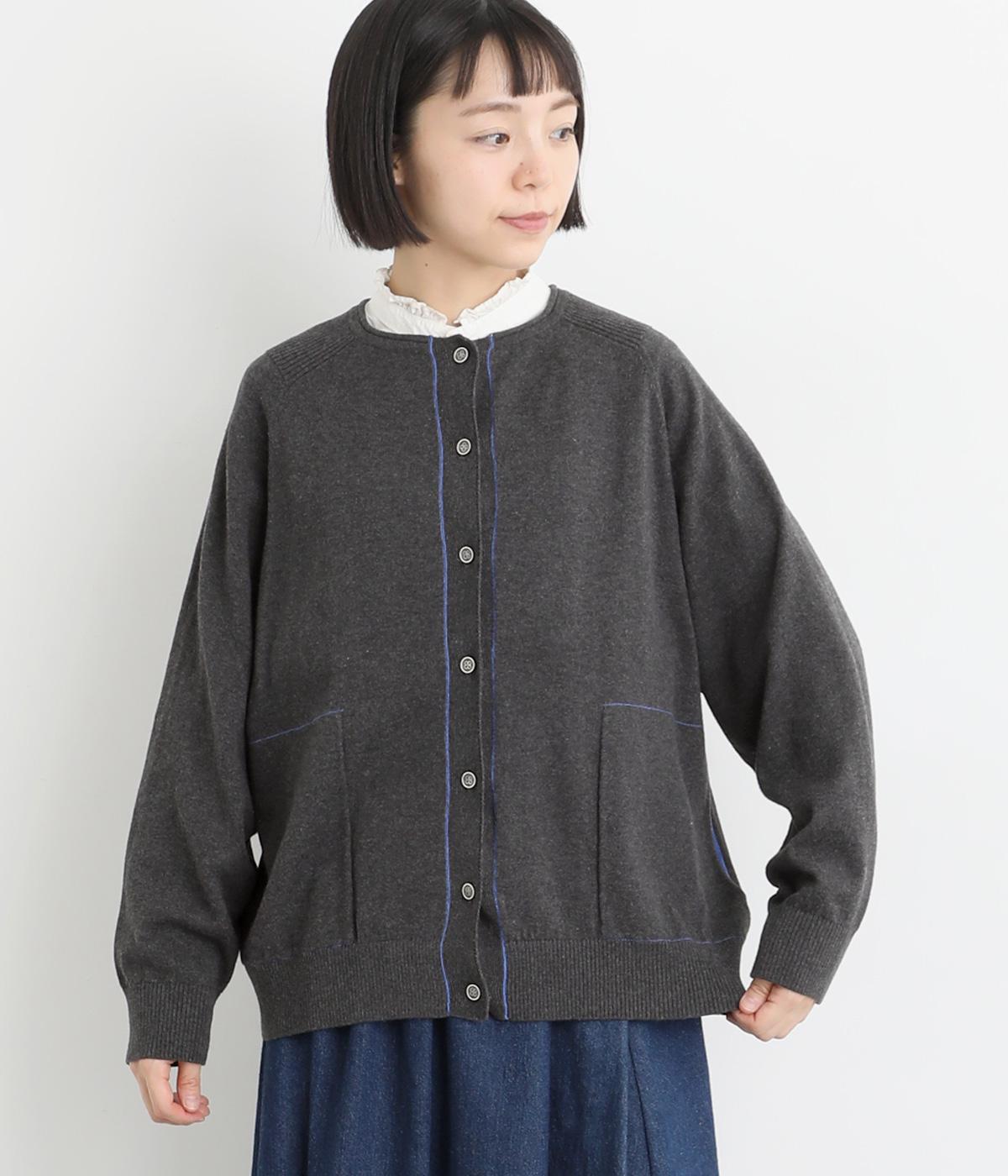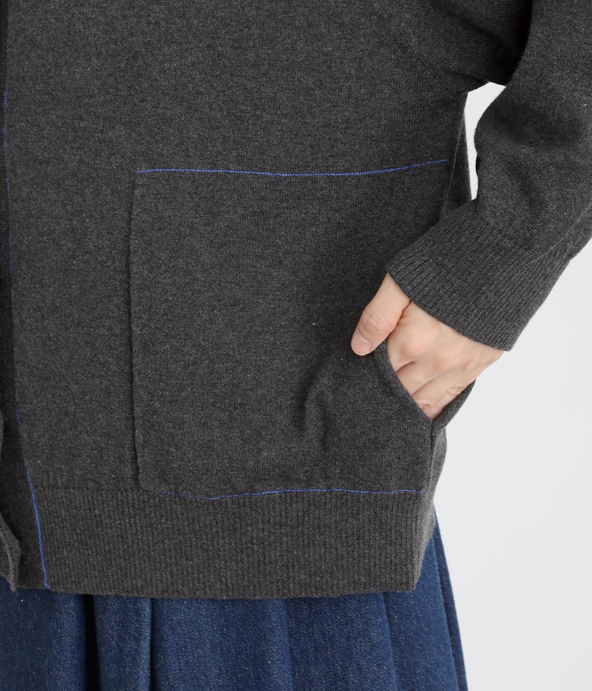 前立てとポケットまわりに入れた、細いステッチがアクセント。肩から袖にかけてのリブ編みが立体感を生み、シンプルさのなかに上質さを演出します。ポケットの裏地にはさりげない配色を効かせ、見えない部分にも遊び心をプラスしました。