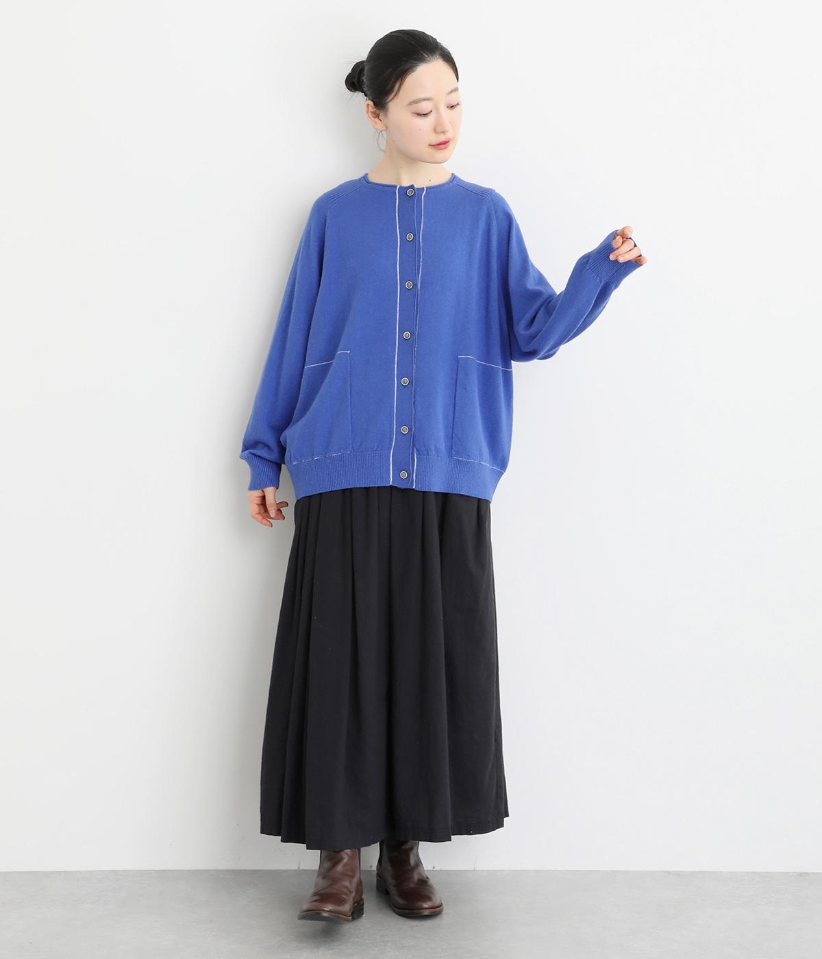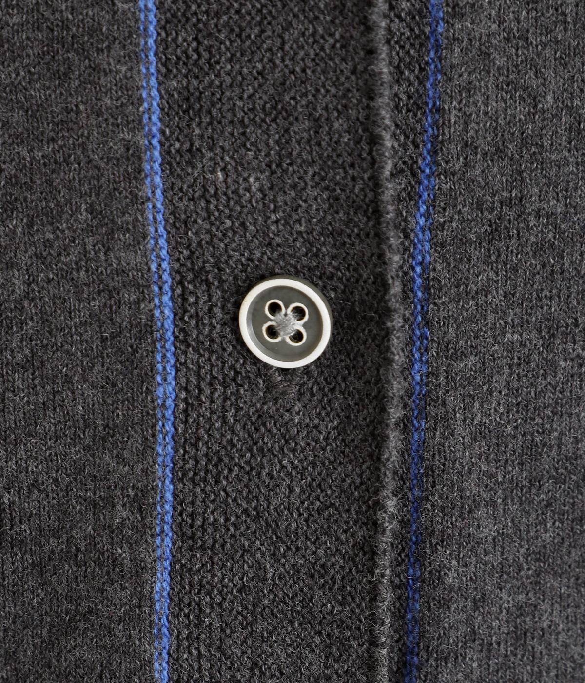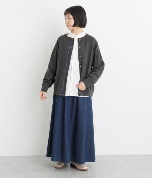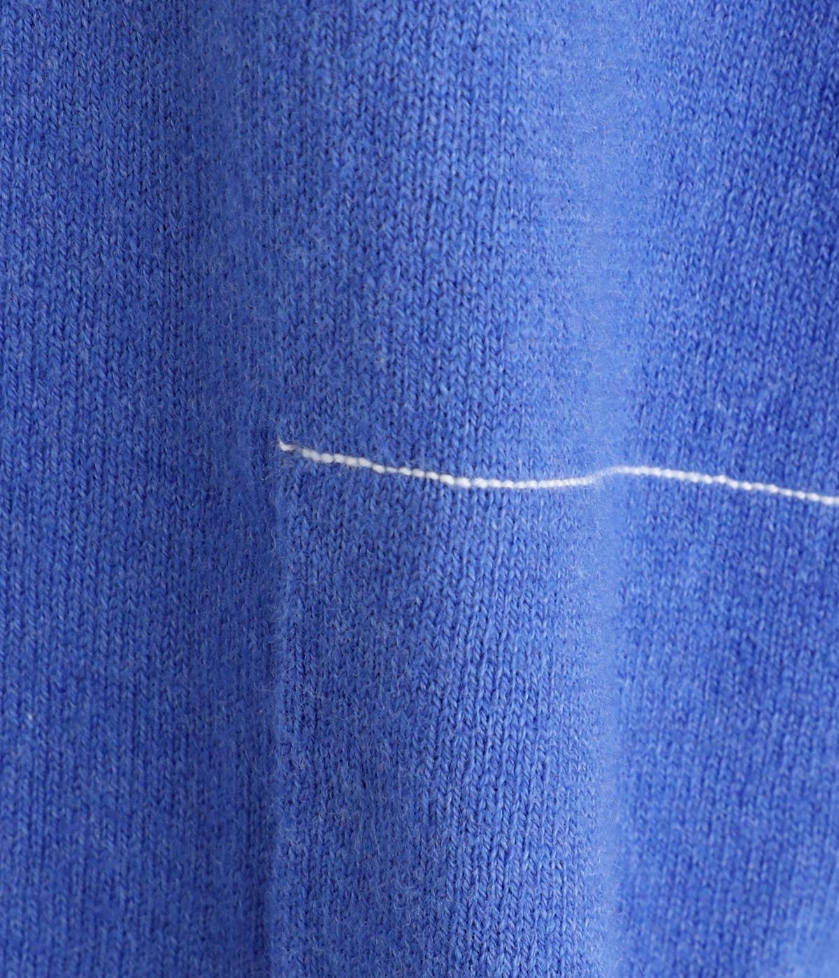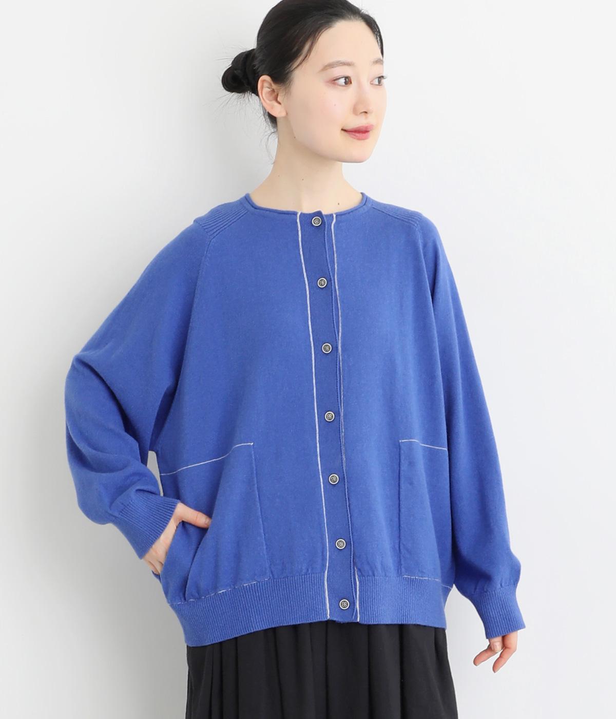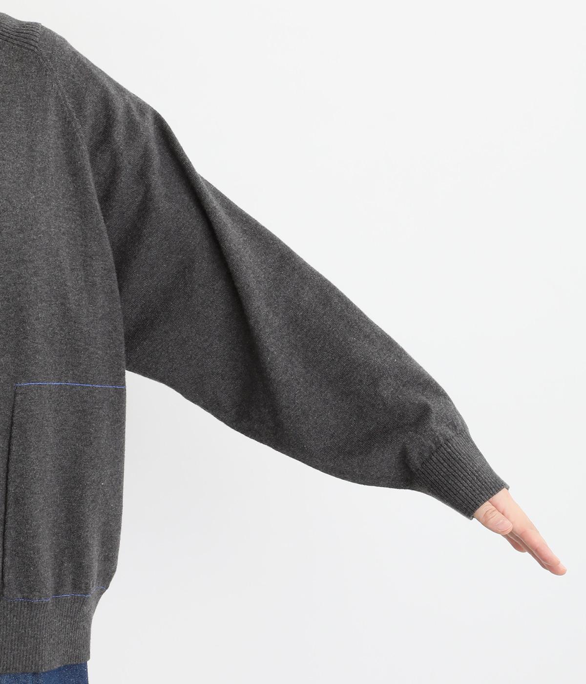 前立てとポケットまわりに入れた、細いステッチがアクセント。肩から袖にかけてのリブ編みが立体感を生み、シンプルさのなかに上質さを演出します。ポケットの裏地にはさりげない配色を効かせ、見えない部分にも遊び心をプラスしました。