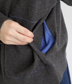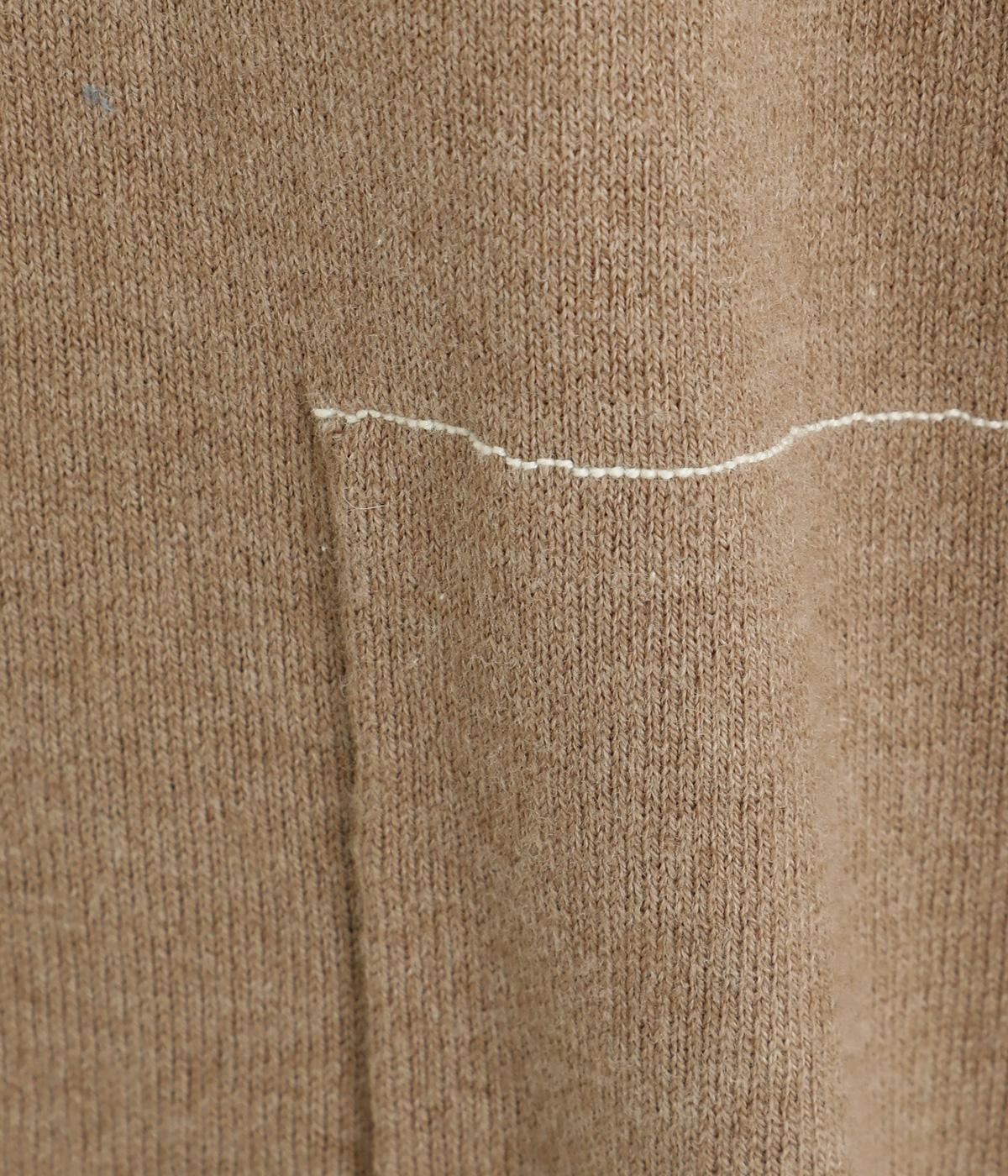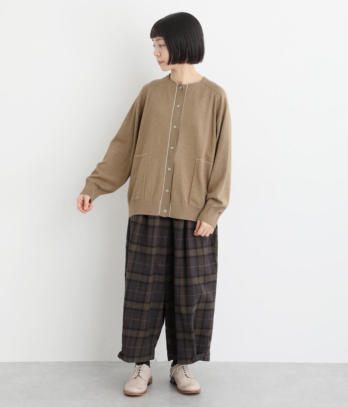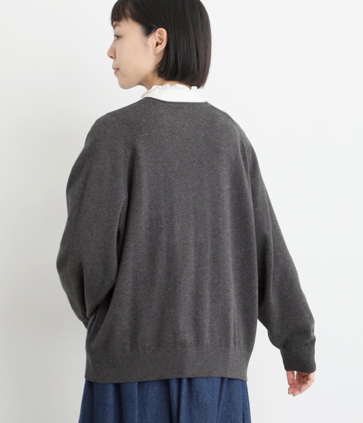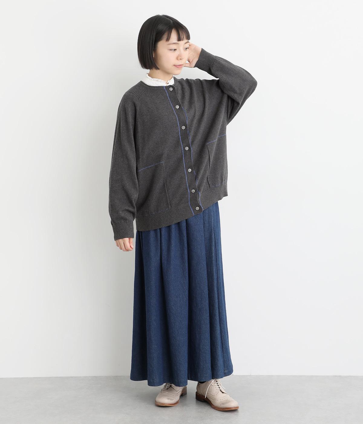 前立てとポケットまわりに入れた、細いステッチがアクセント。肩から袖にかけてのリブ編みが立体感を生み、シンプルさのなかに上質さを演出します。ポケットの裏地にはさりげない配色を効かせ、見えない部分にも遊び心をプラスしました。