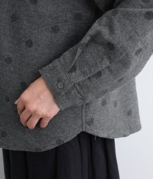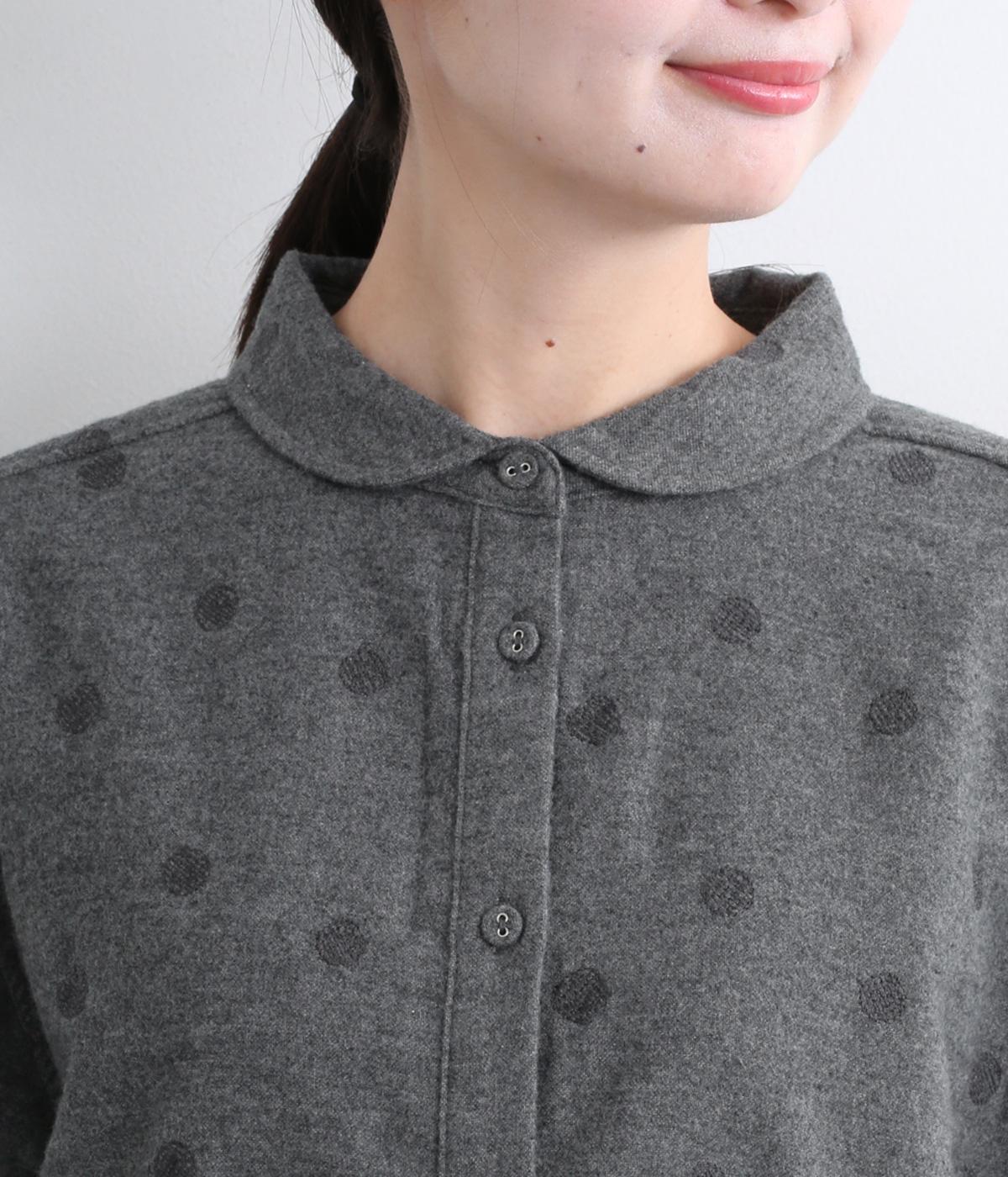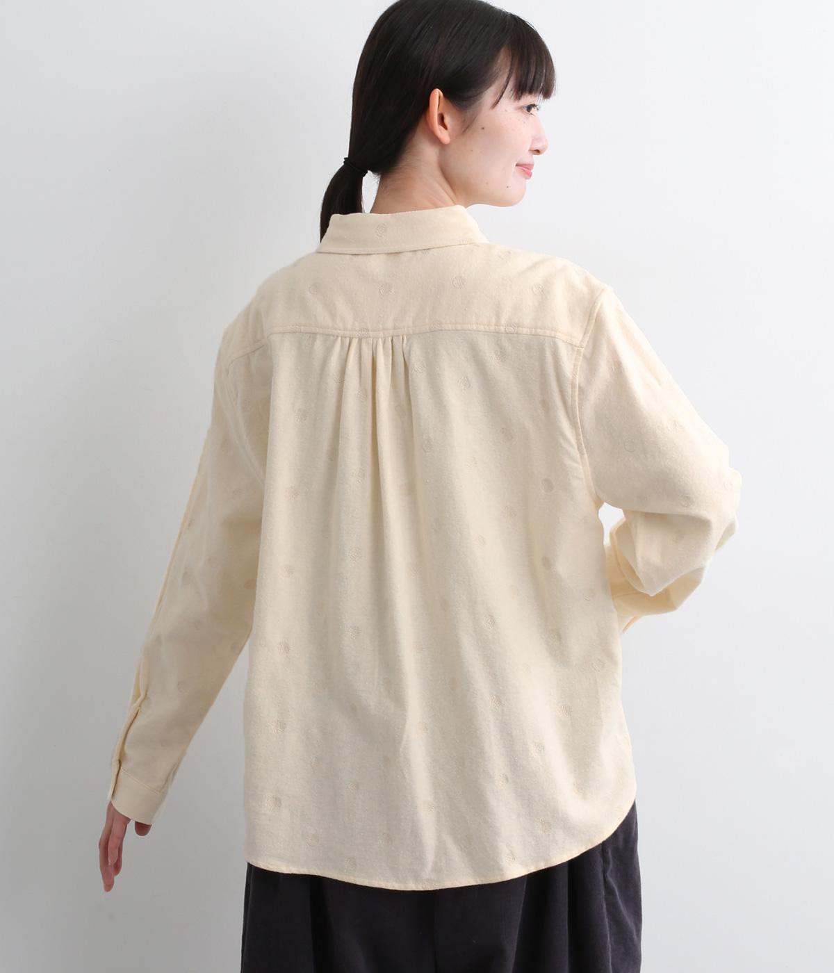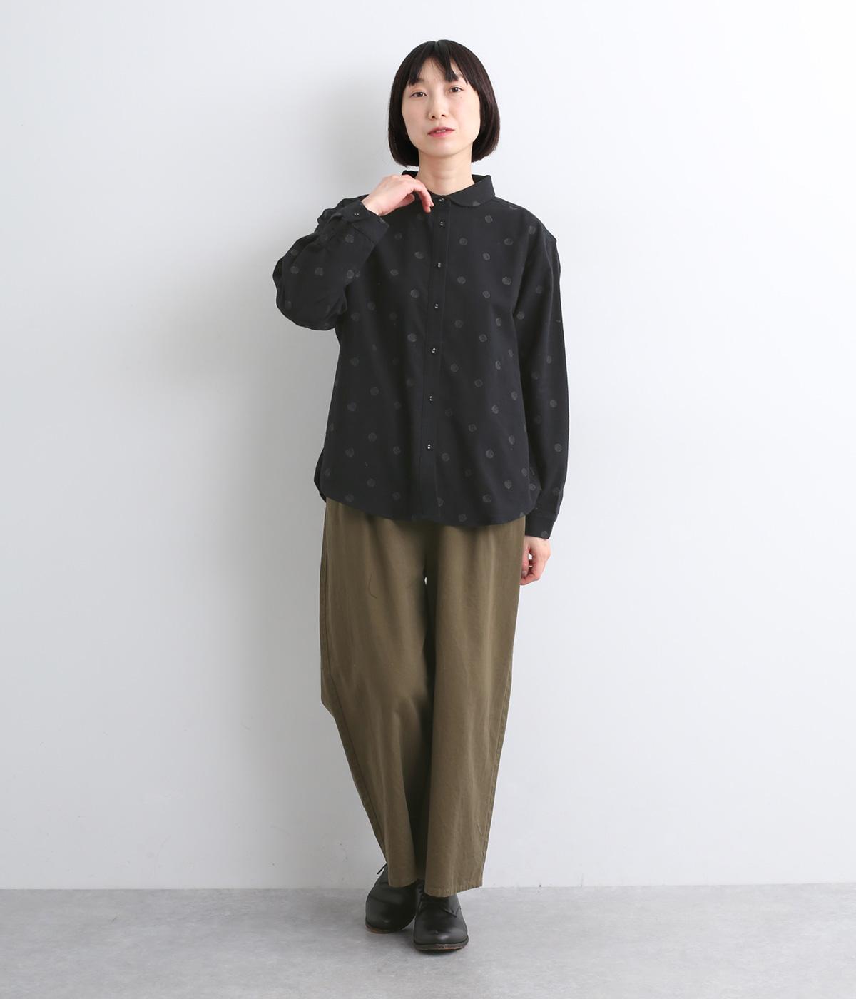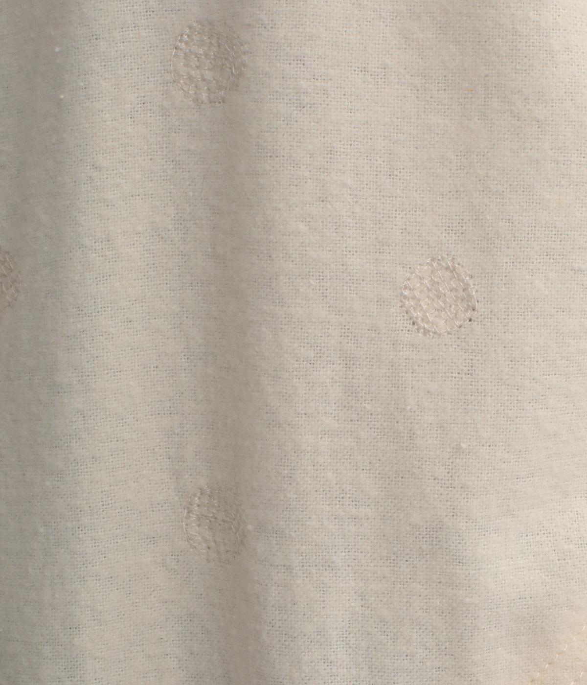 肌にやさしく着るほどになじむコットン生地を使用しました。ドットの総柄は刺しゅうであしらっています。天然素材ならではのやさしい風合いが魅力です。