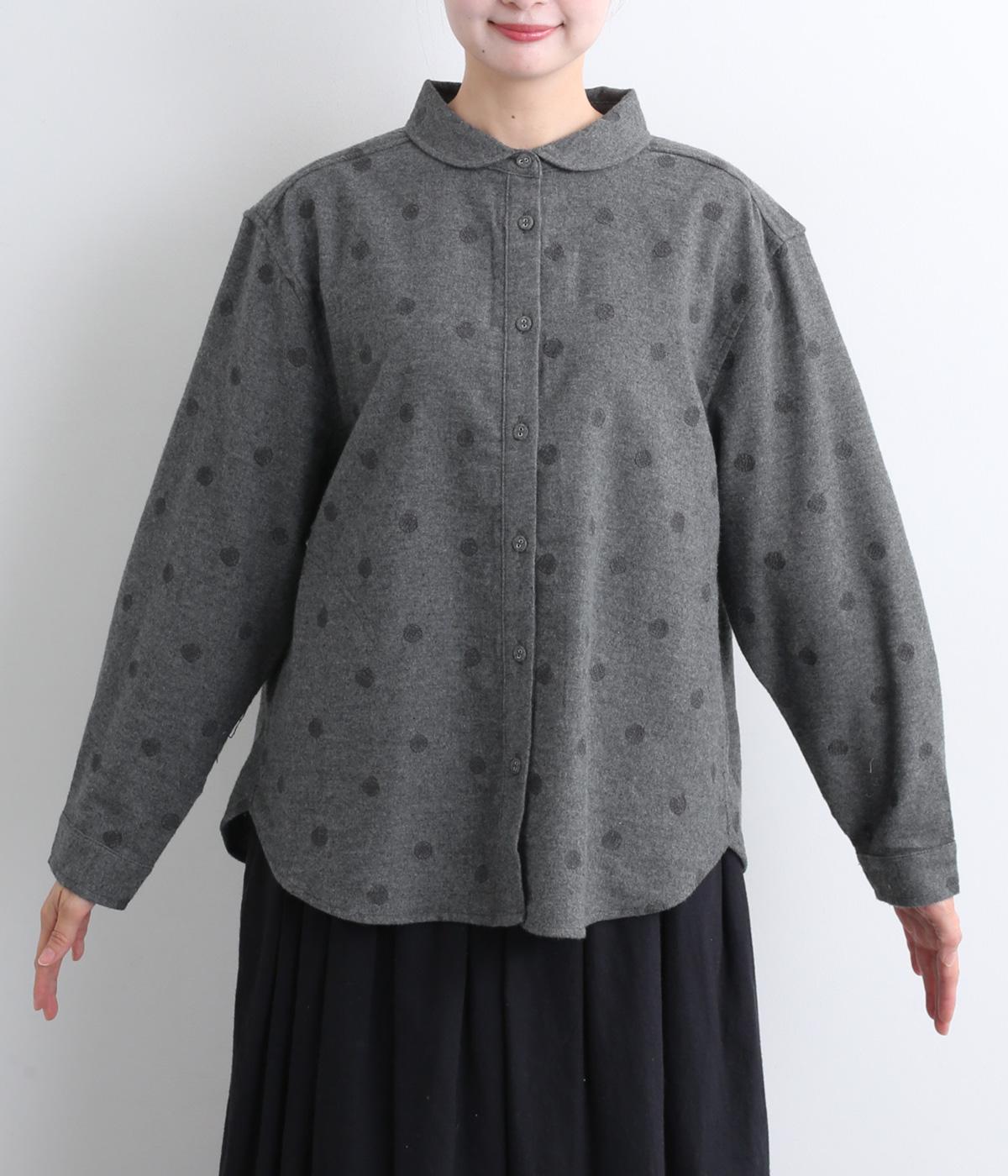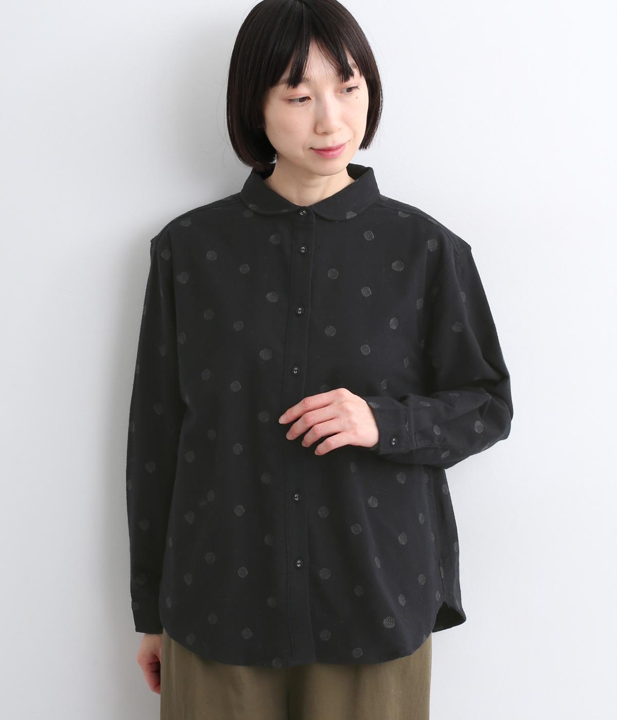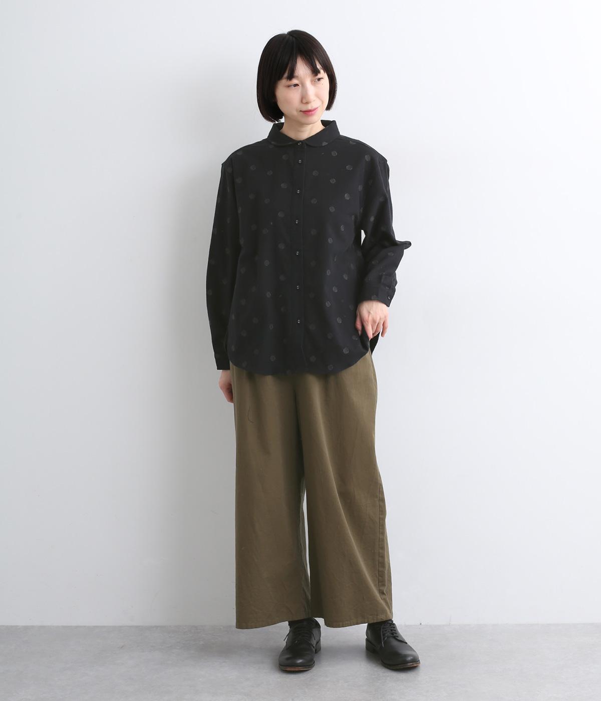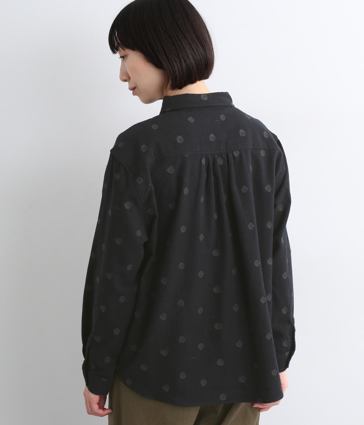 肌にやさしく着るほどになじむコットン生地を使用しました。ドットの総柄は刺しゅうであしらっています。天然素材ならではのやさしい風合いが魅力です。