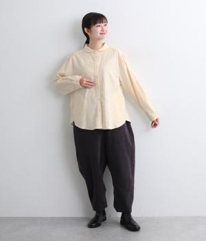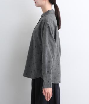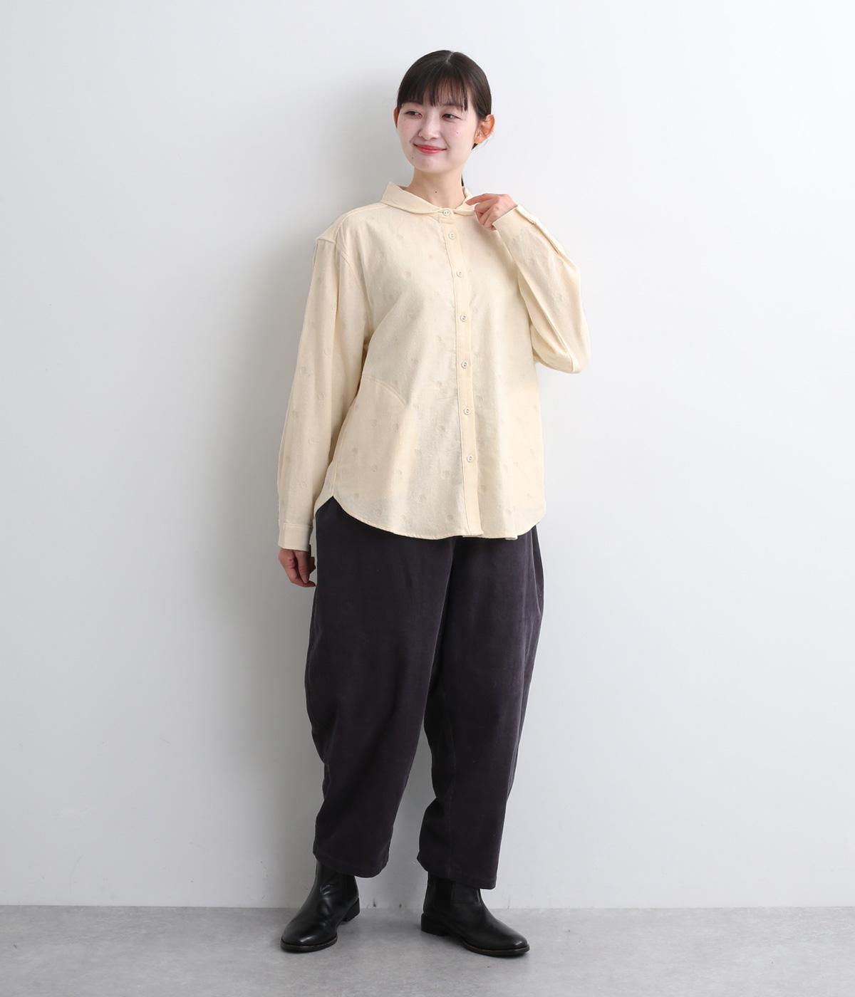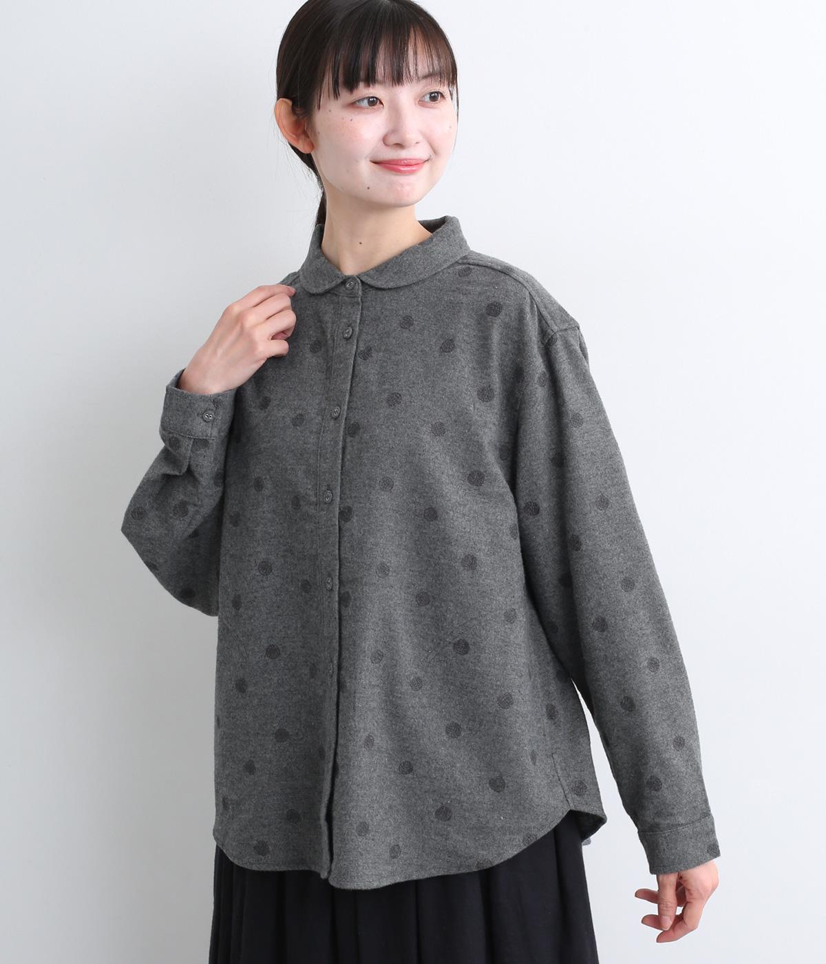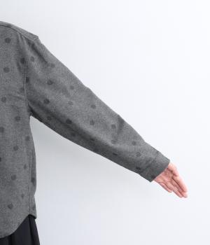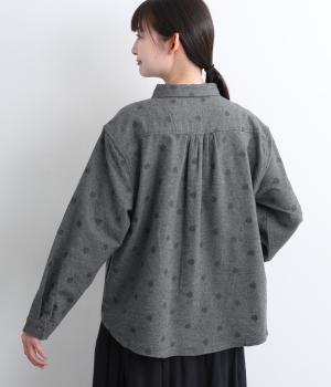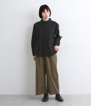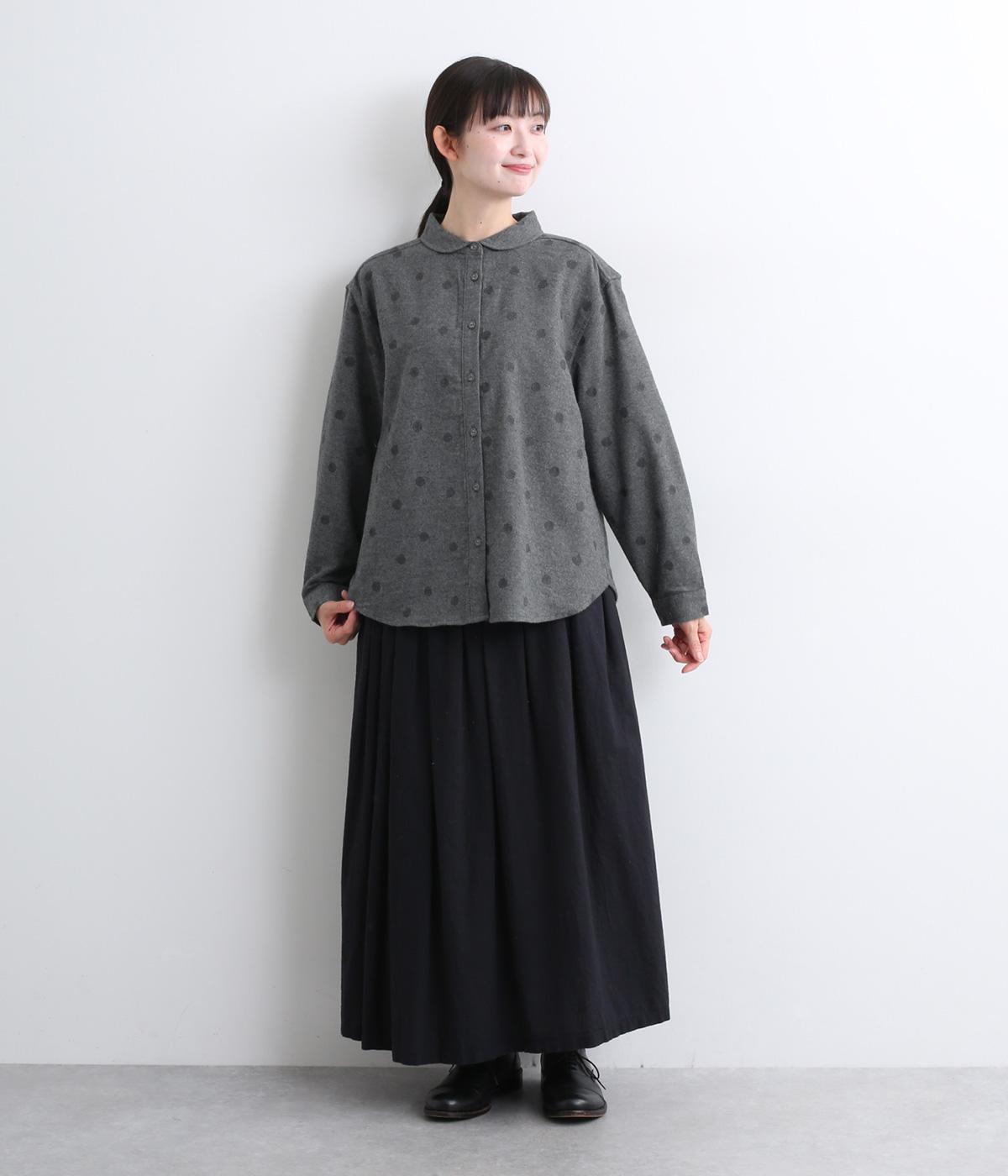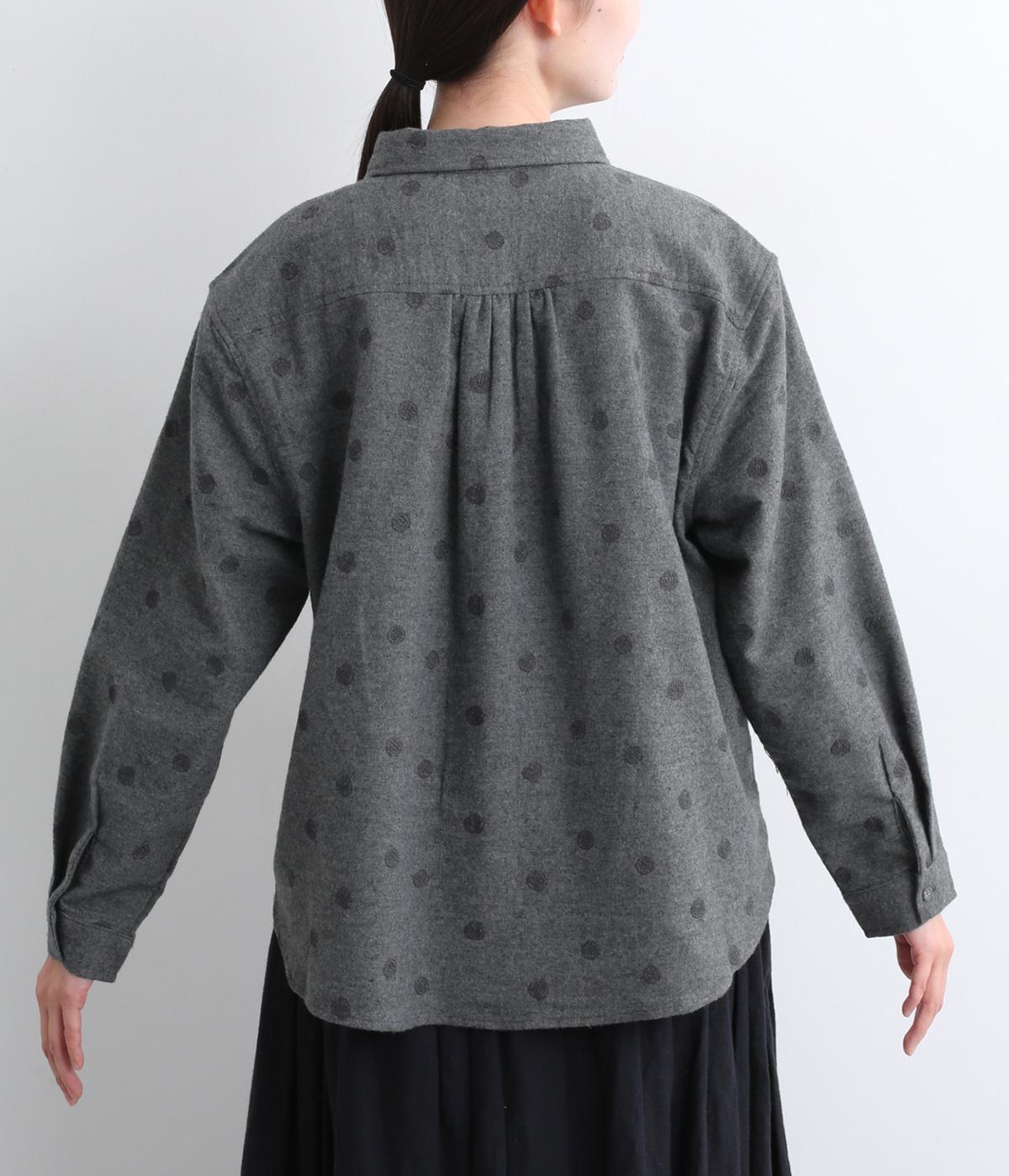 肌にやさしく着るほどになじむコットン生地を使用しました。ドットの総柄は刺しゅうであしらっています。天然素材ならではのやさしい風合いが魅力です。