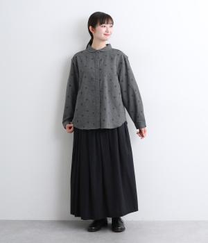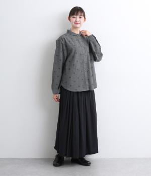 贅沢なドットの総柄刺しゅうが印象的なスカート。背中にほどこしたギャザーやラウンドヘムがふんわりした女性らしい雰囲気を添えています。くるみボタンもかわいらしいアクセントに。一枚で着るだけでサマ見えします。