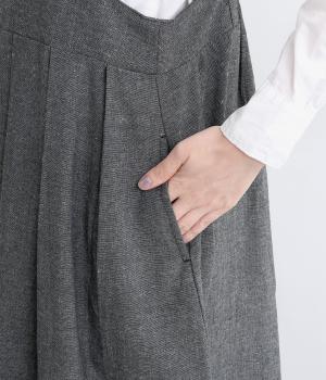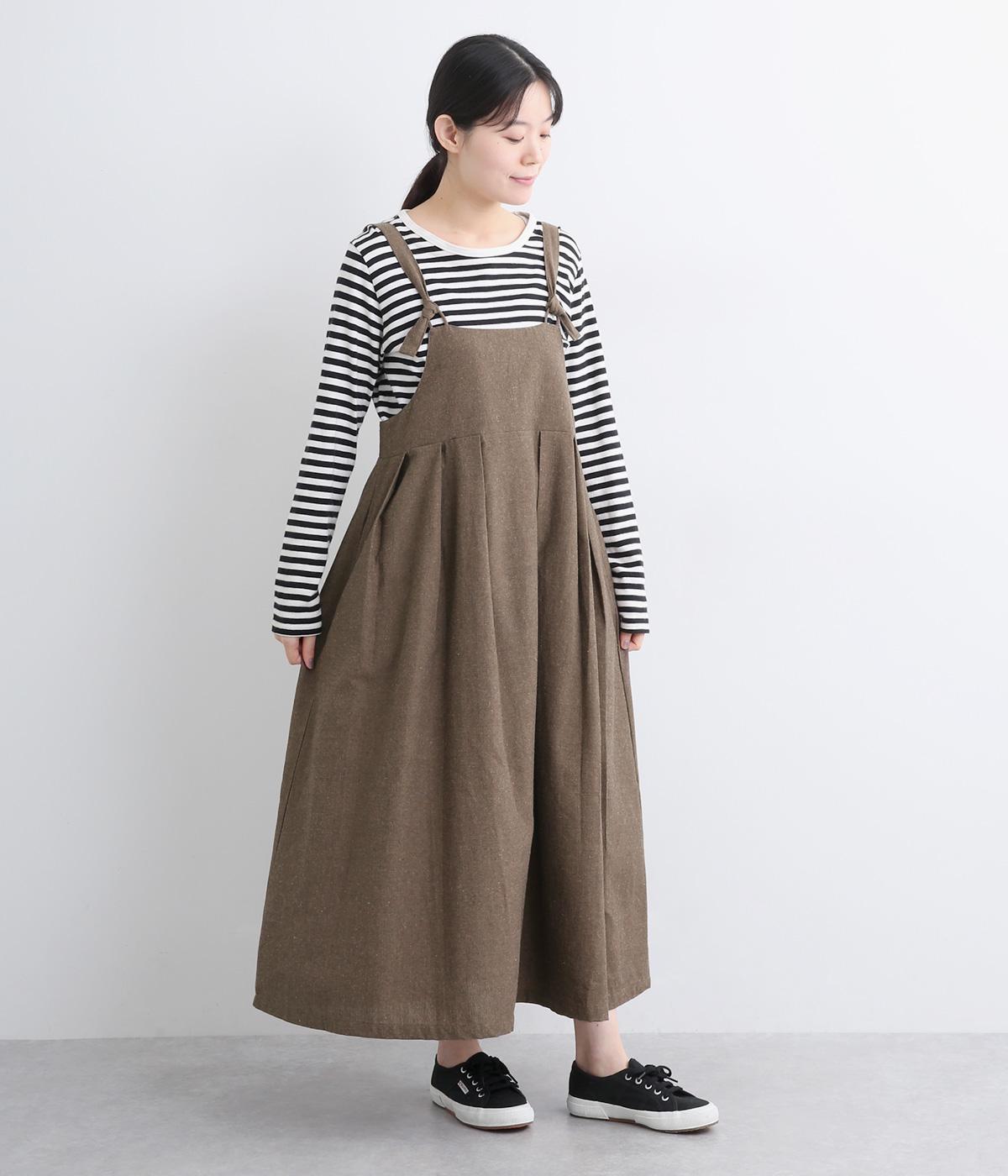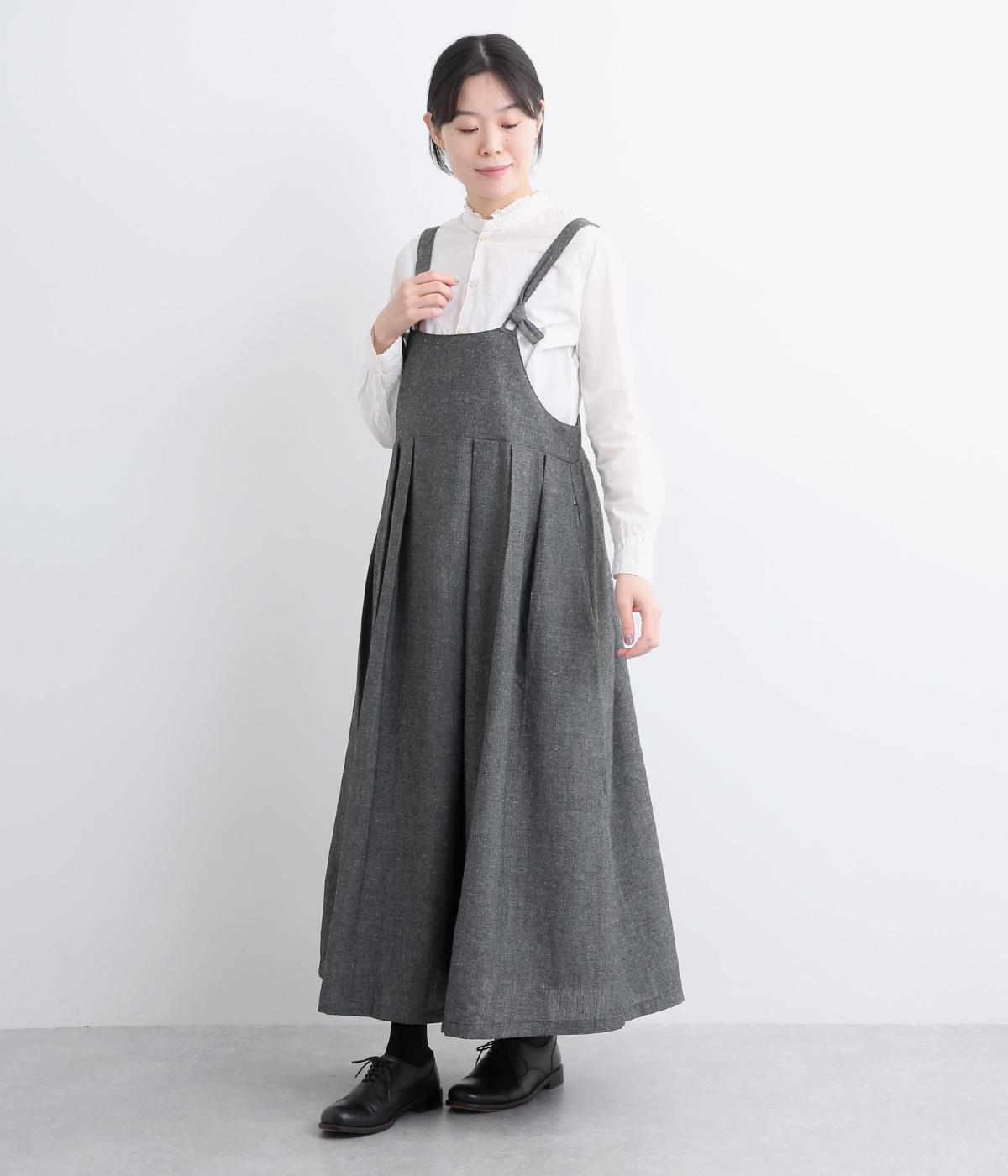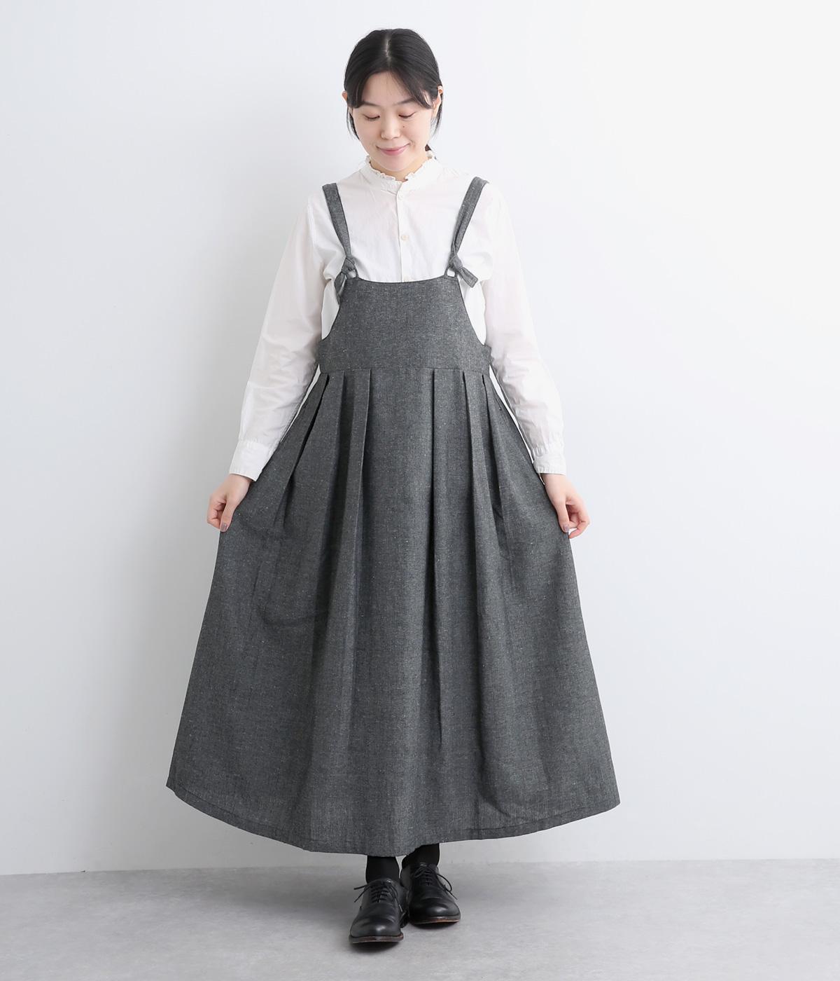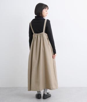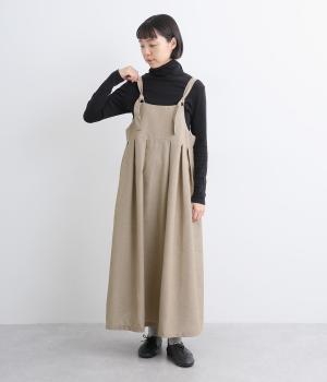 ハイウエストで切り替えがあり、落ち感のあるジャンパースカートです。肩紐は調節可能で、結び目がさりげないアクセントに。バックル部分も同素材の布で仕上げており、あたりがやわらかくストレスのない着心地を叶えます。