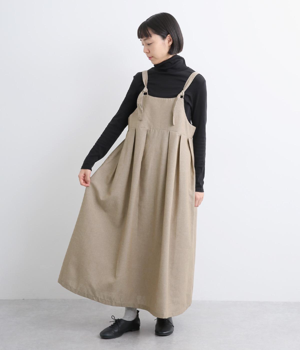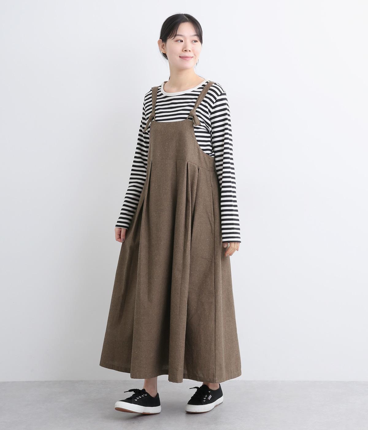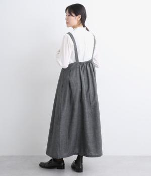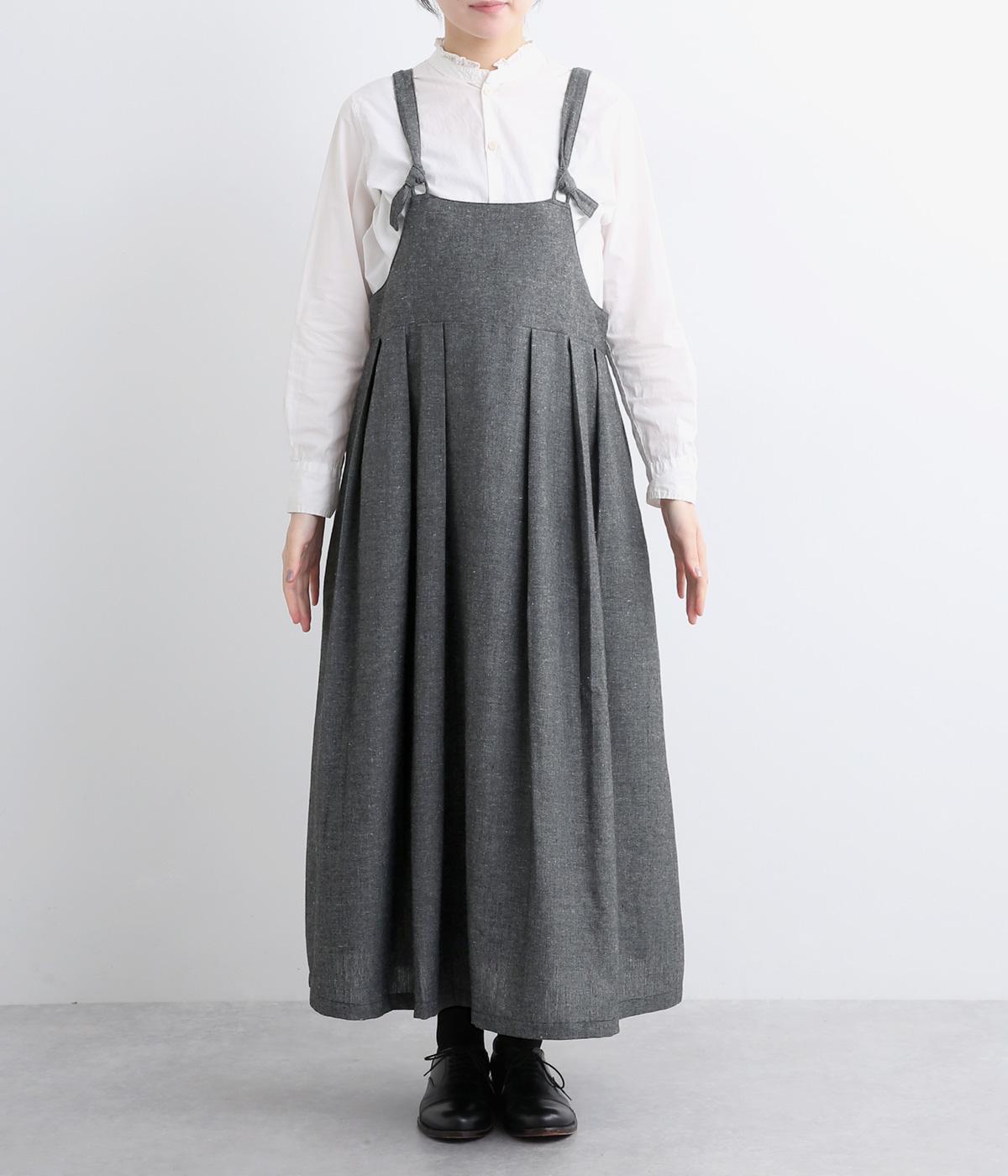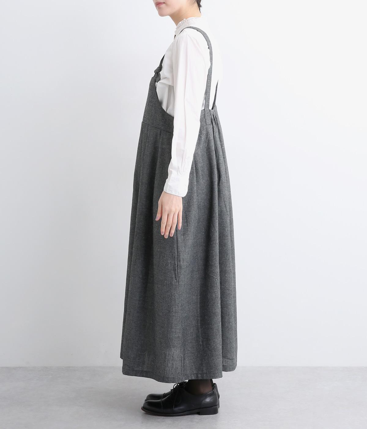 ハイウエストで切り替えがあり、落ち感のあるジャンパースカートです。肩紐は調節可能で、結び目がさりげないアクセントに。バックル部分も同素材の布で仕上げており、あたりがやわらかくストレスのない着心地を叶えます。