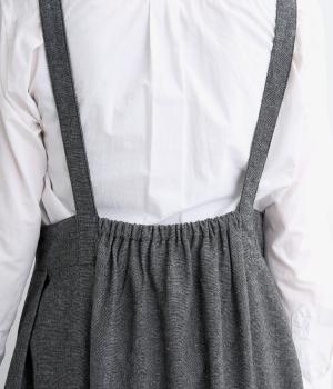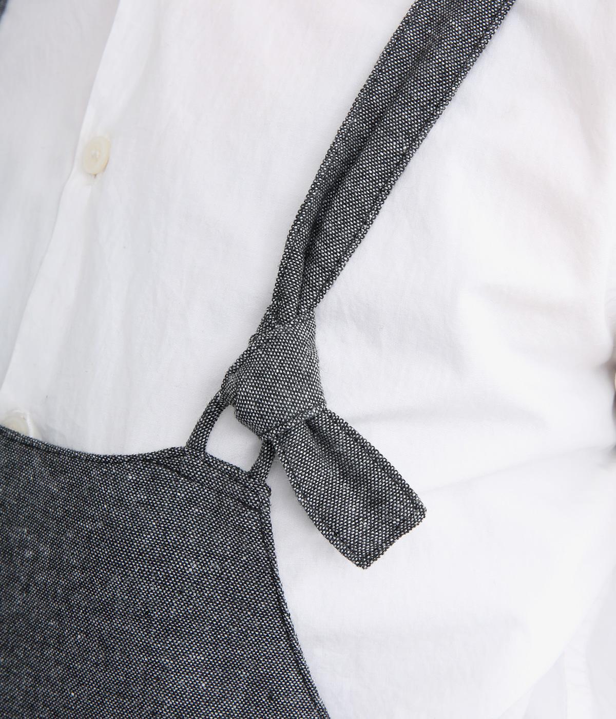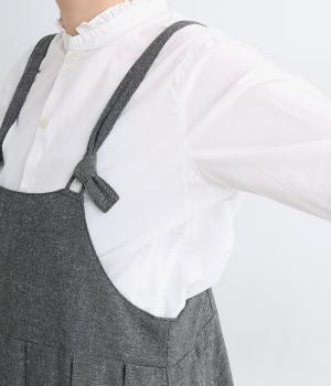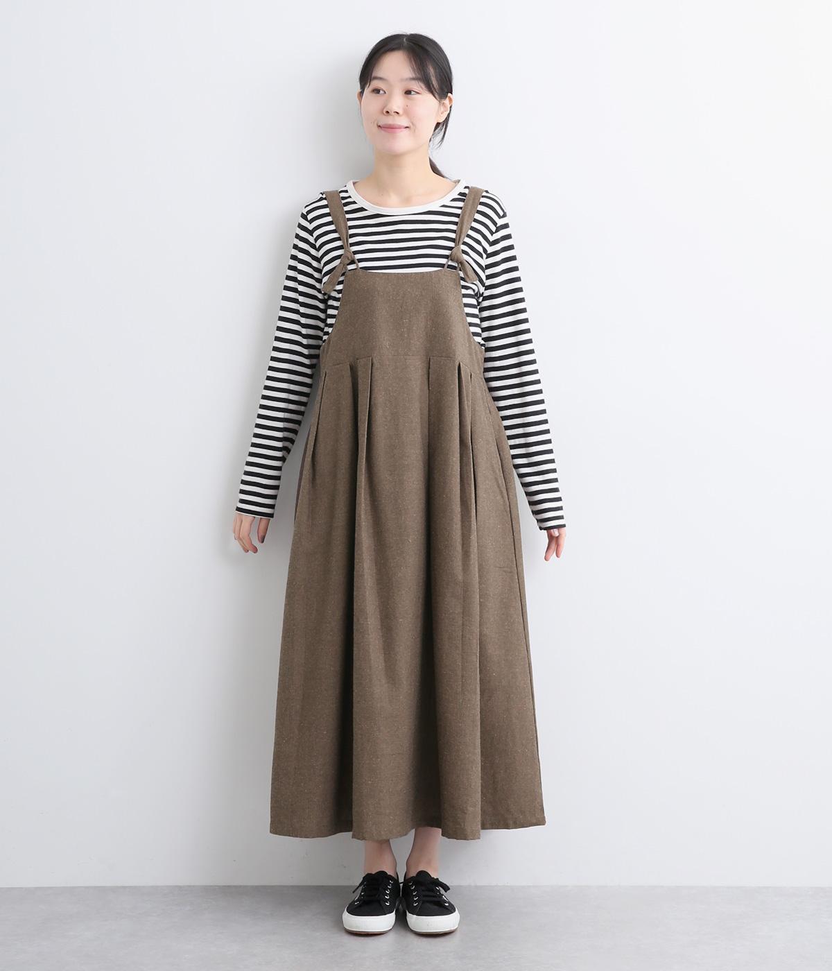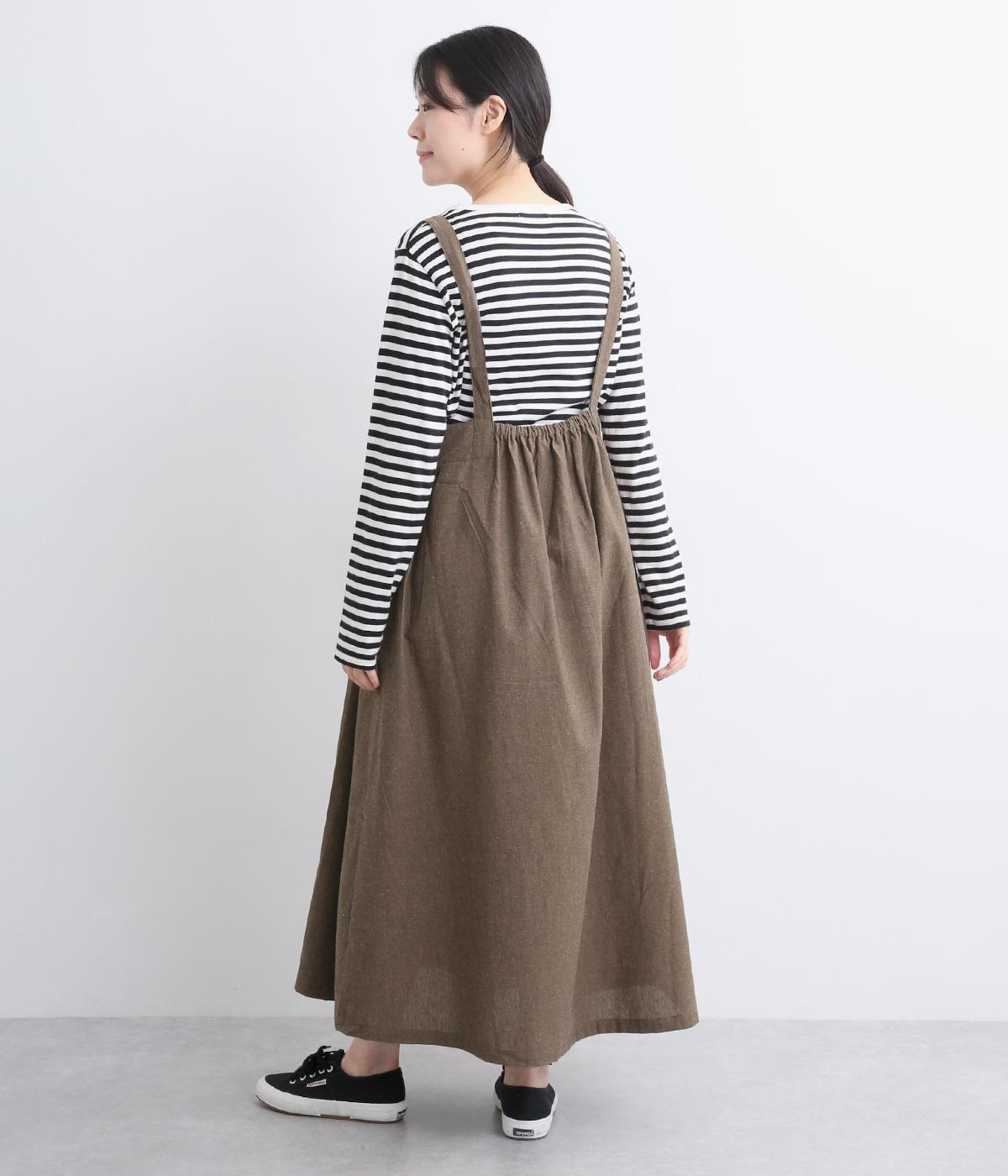 ハイウエストで切り替えがあり、落ち感のあるジャンパースカートです。肩紐は調節可能で、結び目がさりげないアクセントに。バックル部分も同素材の布で仕上げており、あたりがやわらかくストレスのない着心地を叶えます。