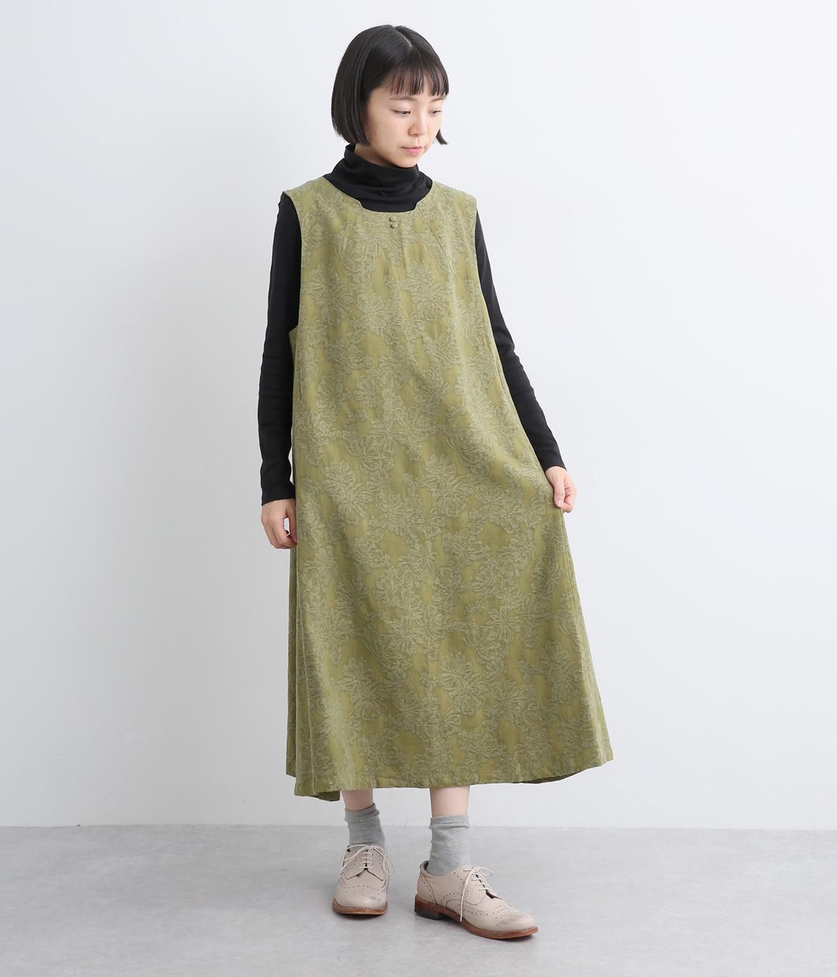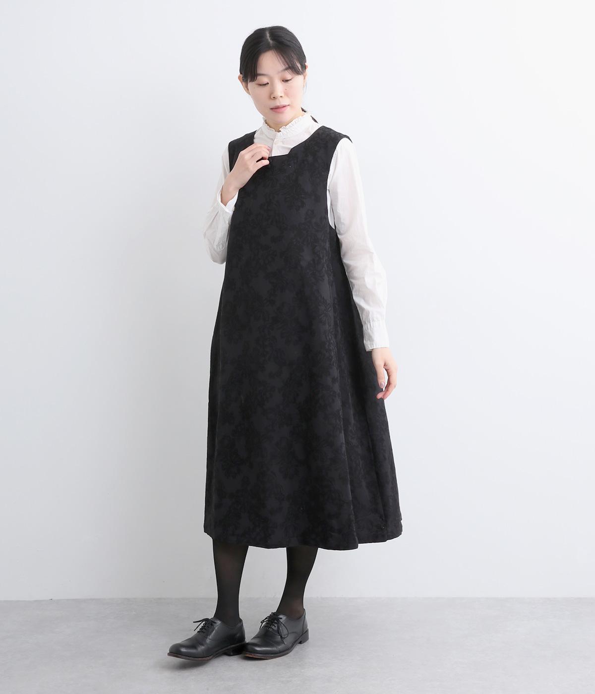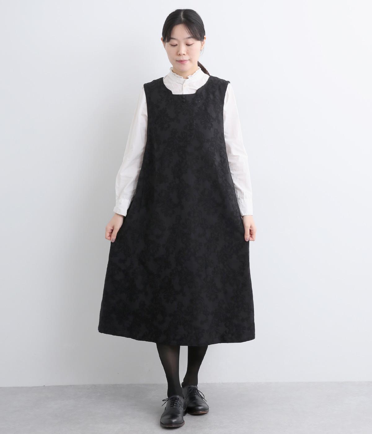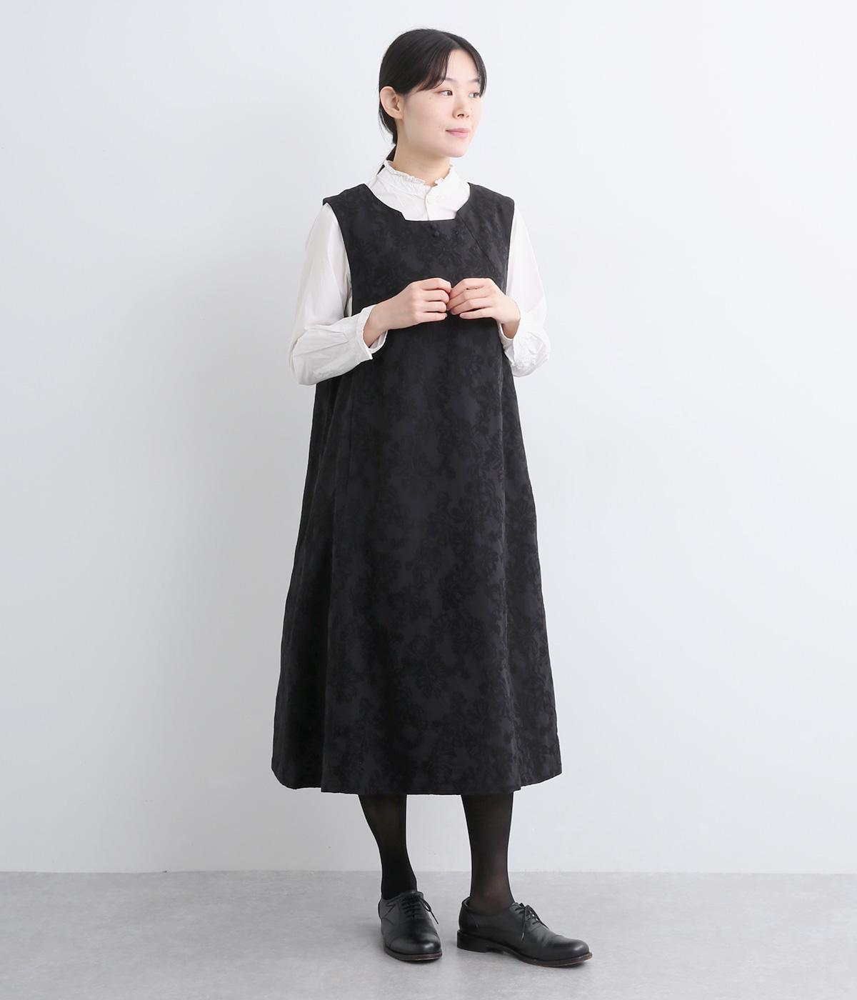 首元のカットが特徴的で、くるみボタンがアクセントのデザインです。シックなボタニカル柄で上品に仕上がりました。インナーにブラウスやニットを合わせたり、カーディガンやジャケットを羽織ったりと、幅広い着こなしが叶います。
