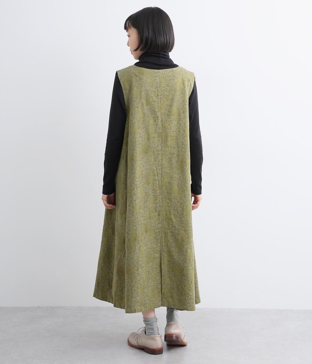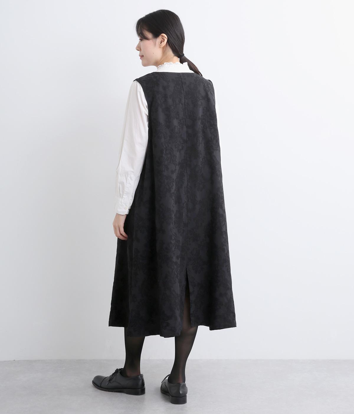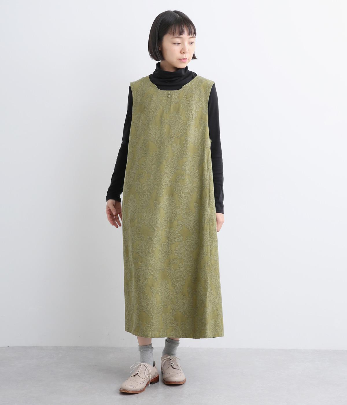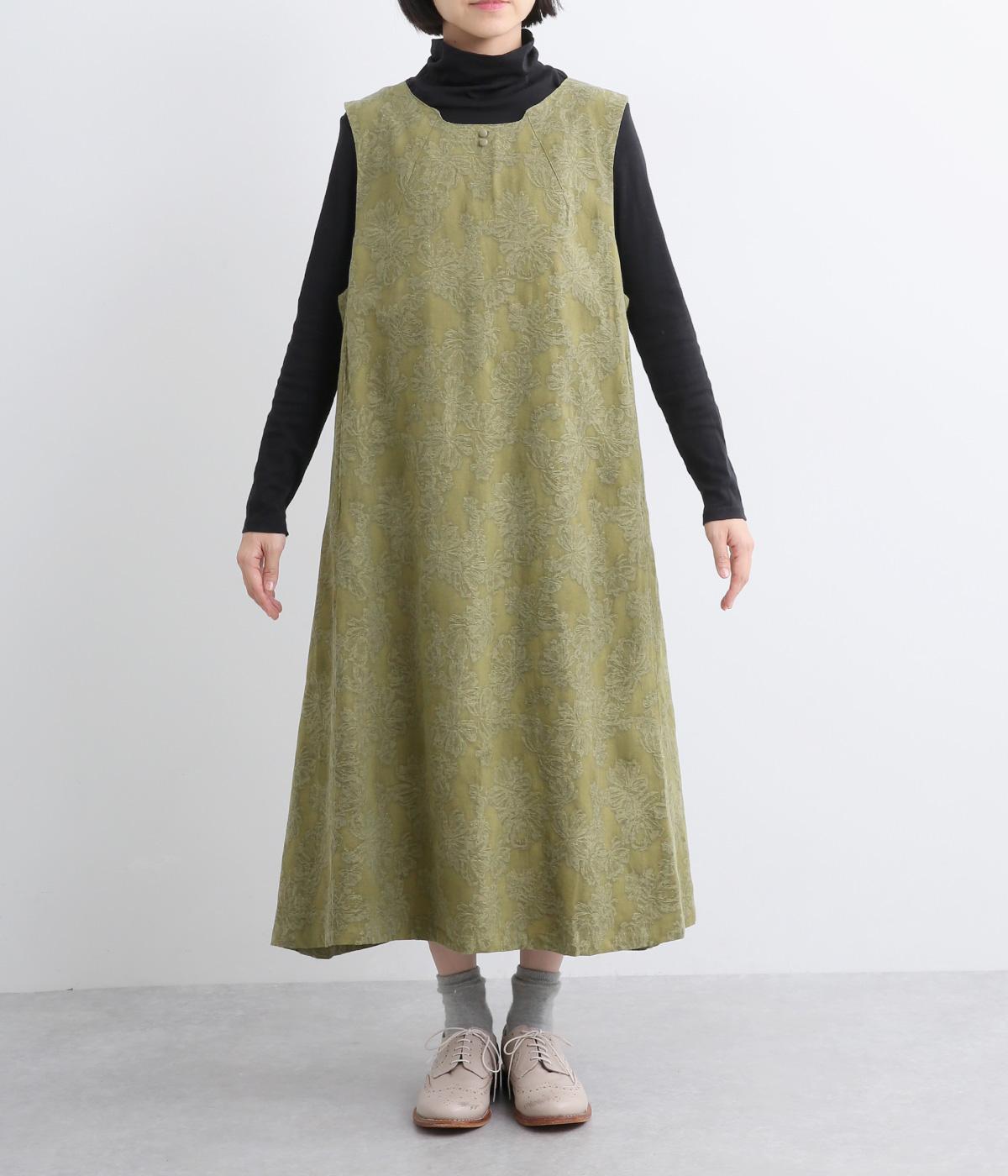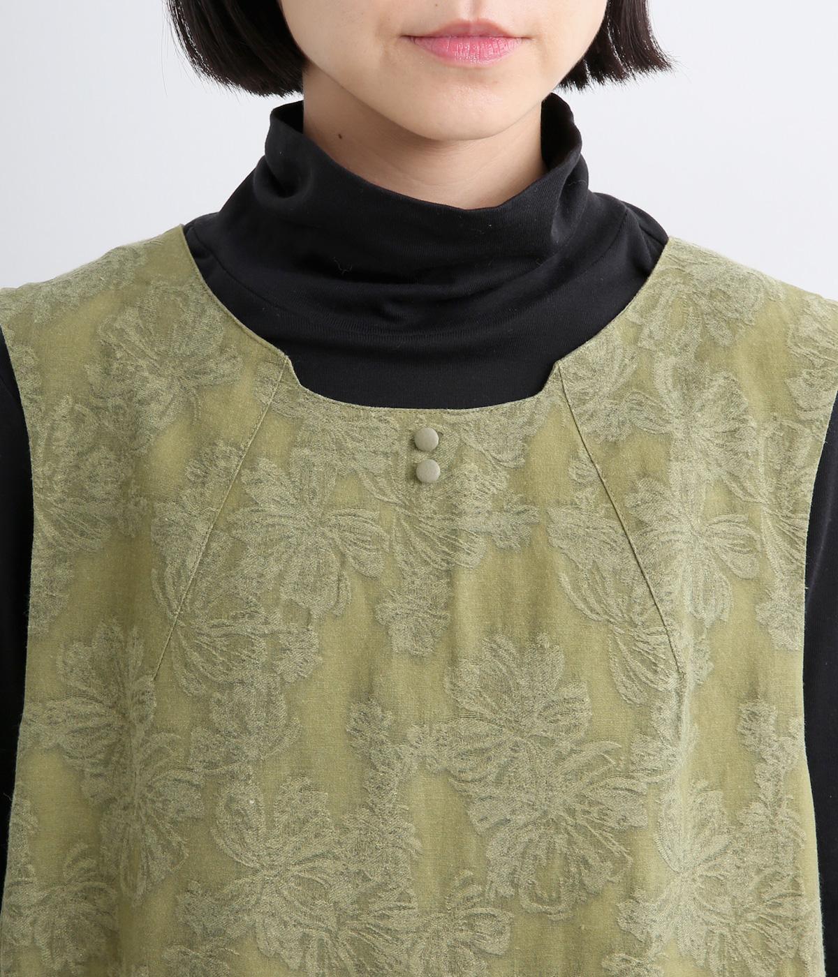 首元のカットが特徴的で、くるみボタンがアクセントのデザインです。シックなボタニカル柄で上品に仕上がりました。インナーにブラウスやニットを合わせたり、カーディガンやジャケットを羽織ったりと、幅広い着こなしが叶います。