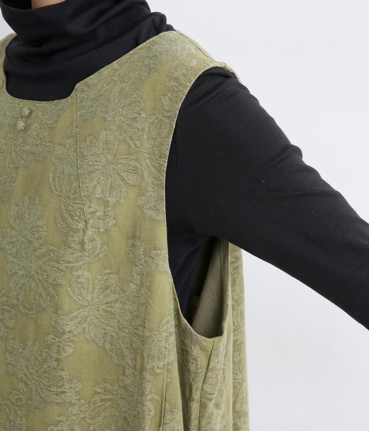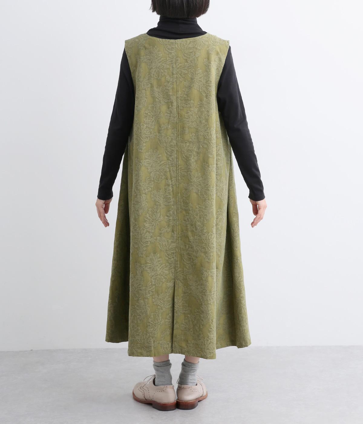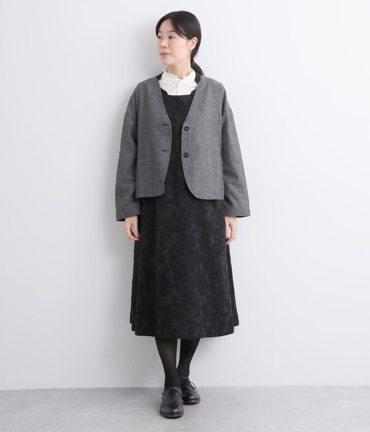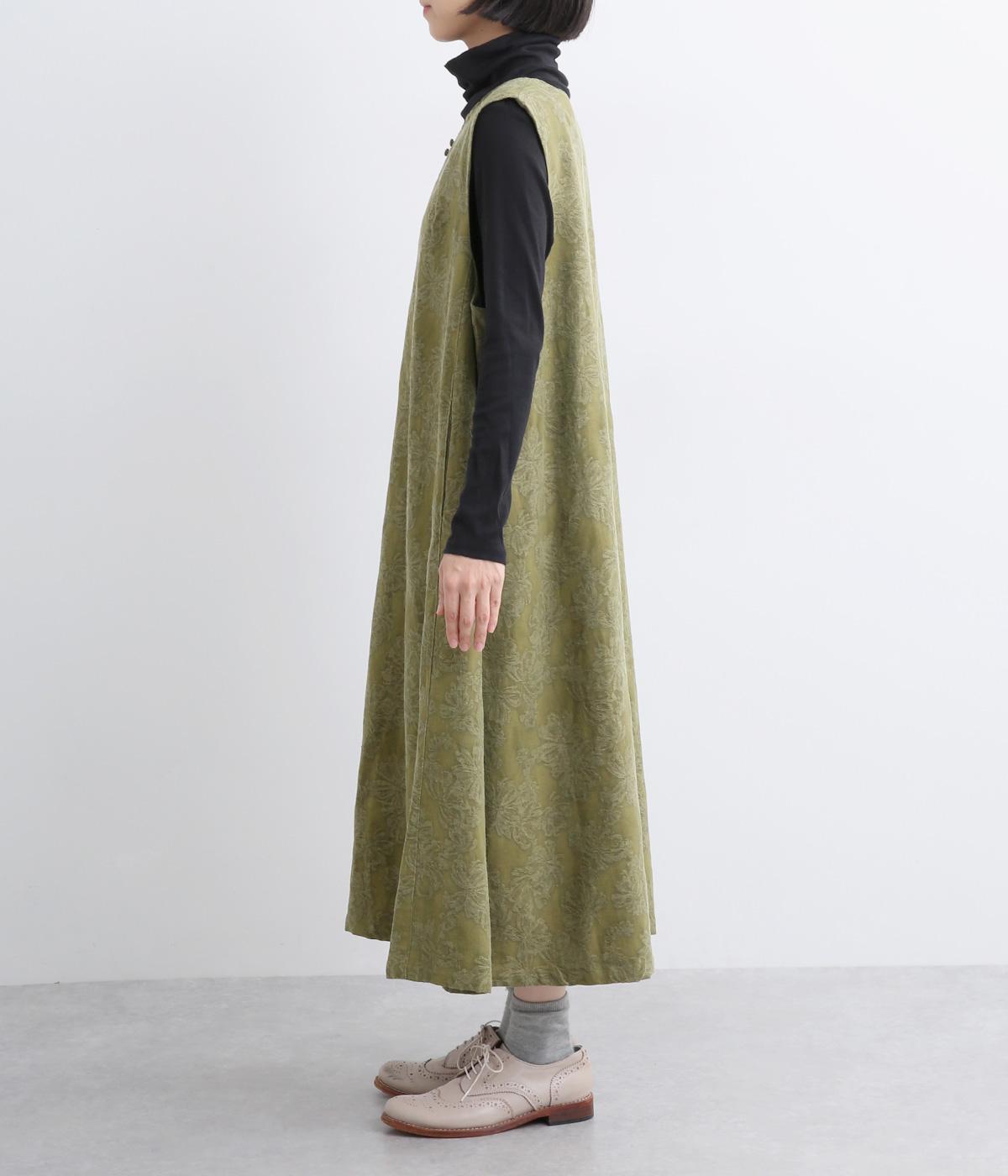 首元のカットが特徴的で、くるみボタンがアクセントのデザインです。シックなボタニカル柄で上品に仕上がりました。インナーにブラウスやニットを合わせたり、カーディガンやジャケットを羽織ったりと、幅広い着こなしが叶います。