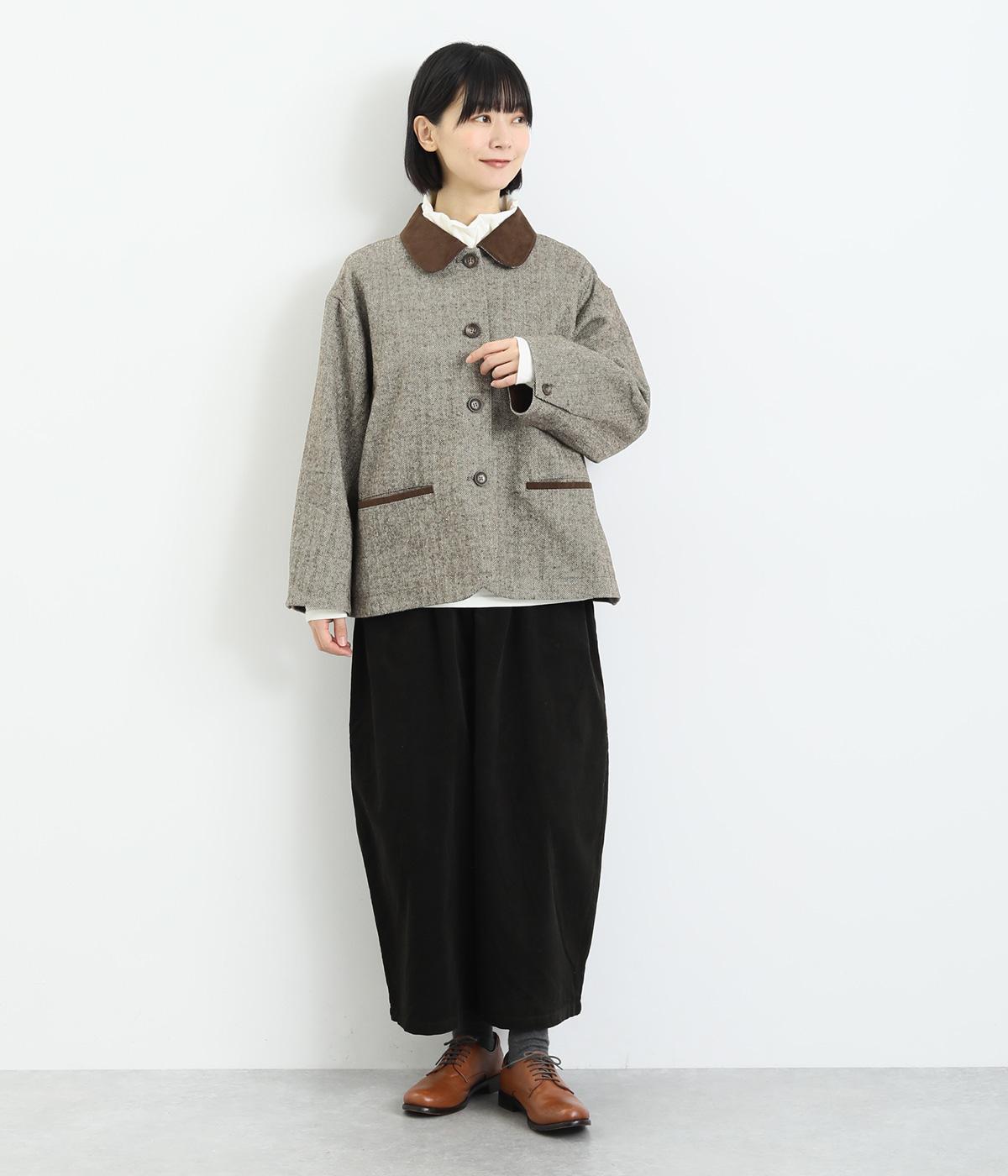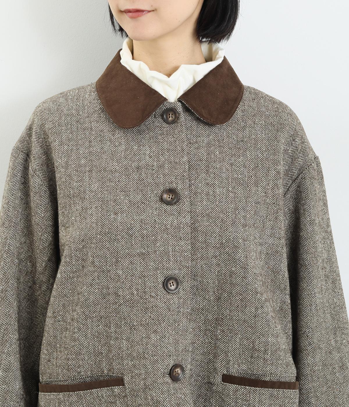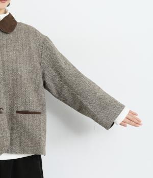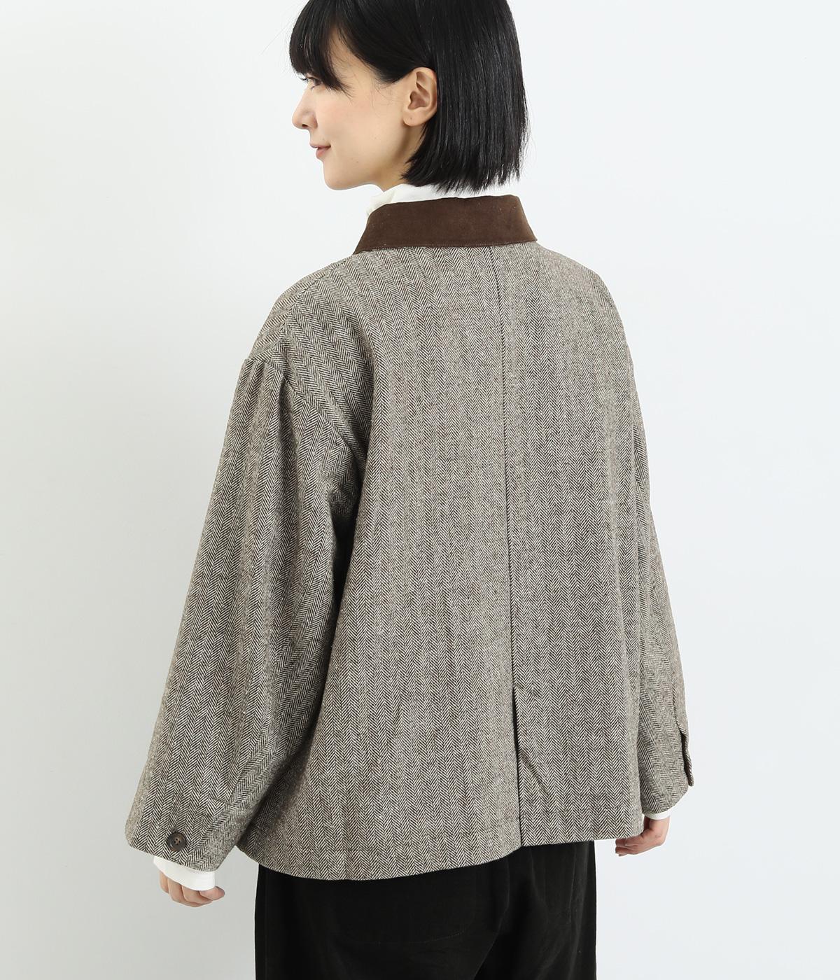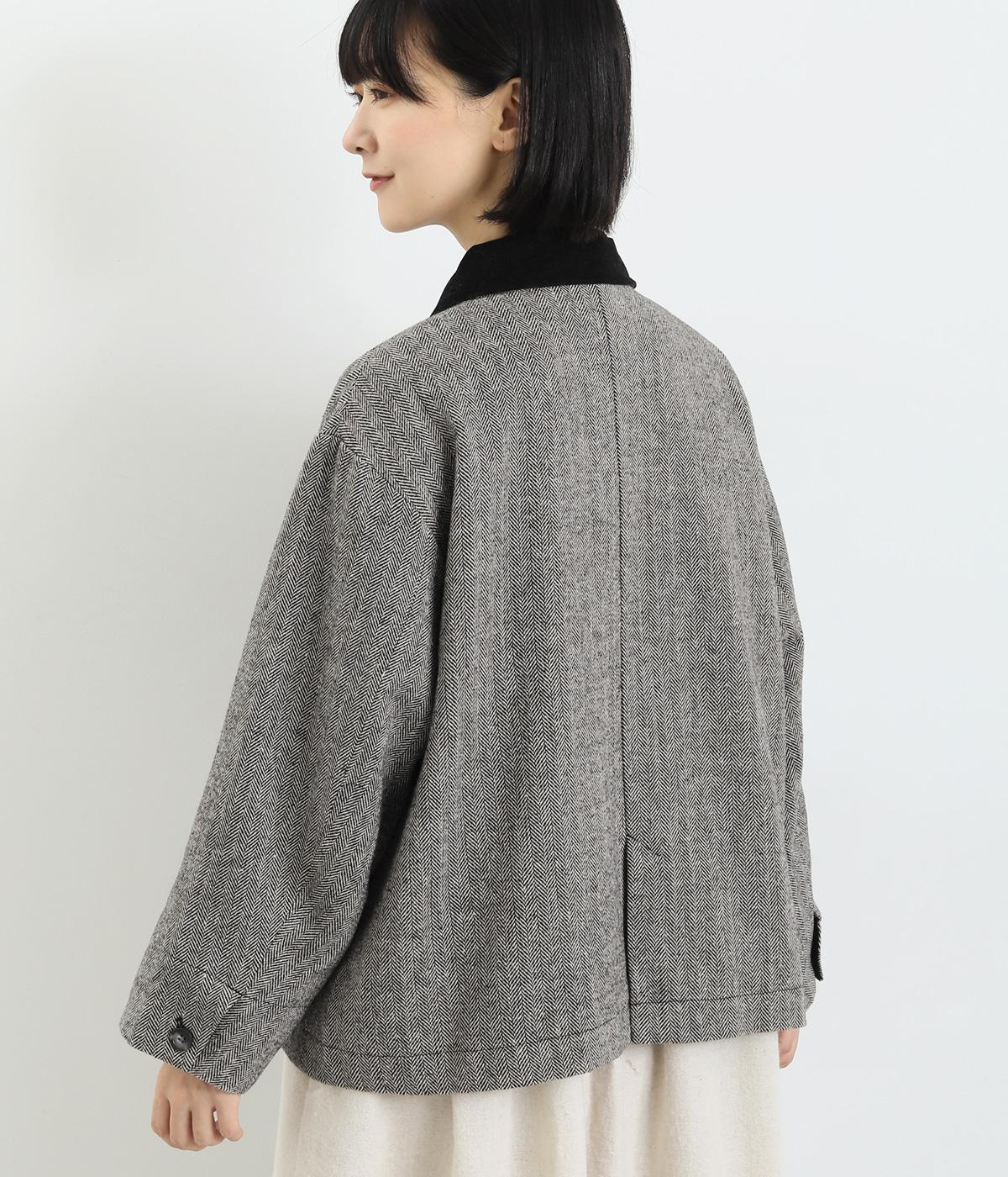 肌触りのなめらかなヘリンボーン生地と襟元のコーデュロイの異素材使いがポイントです。ポリエステルの裏地付きで、着脱もスムーズ。ほどよい厚みとマットな見た目がとても上品な素材感です。