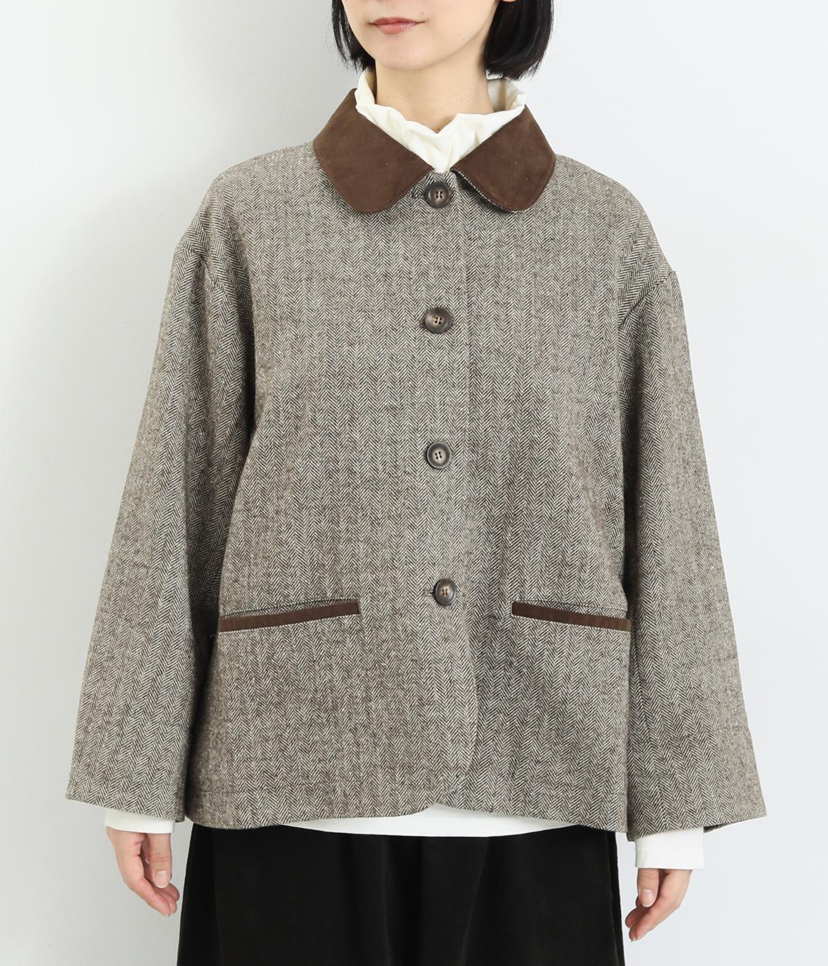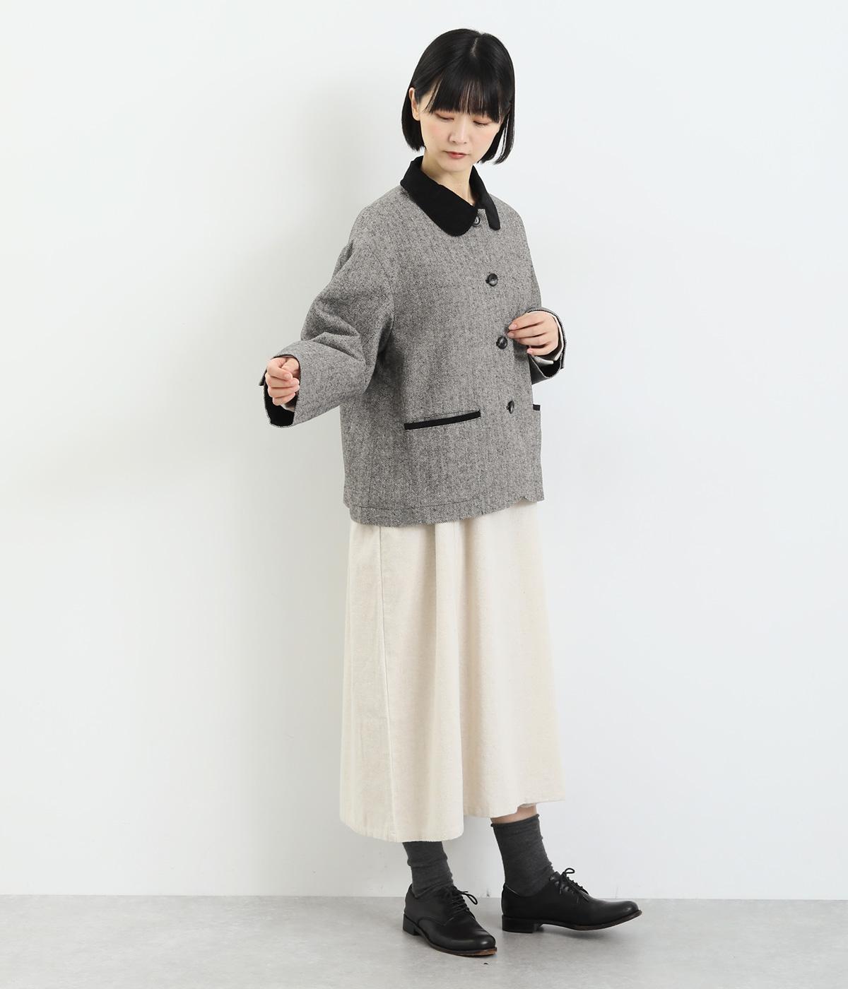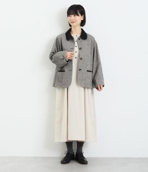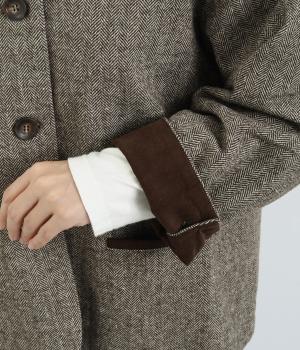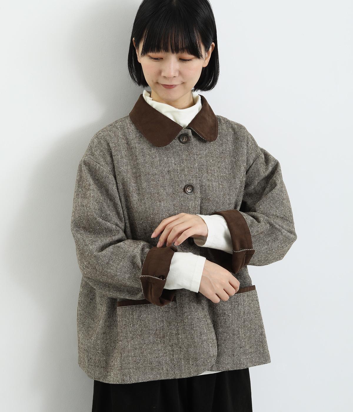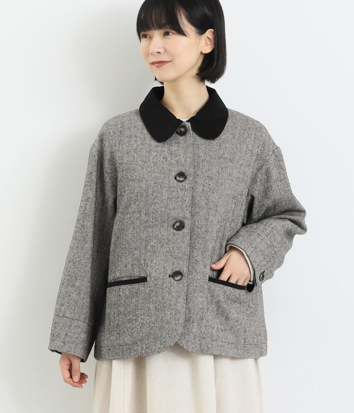 肌触りのなめらかなヘリンボーン生地と襟元のコーデュロイの異素材使いがポイントです。ポリエステルの裏地付きで、着脱もスムーズ。ほどよい厚みとマットな見た目がとても上品な素材感です。