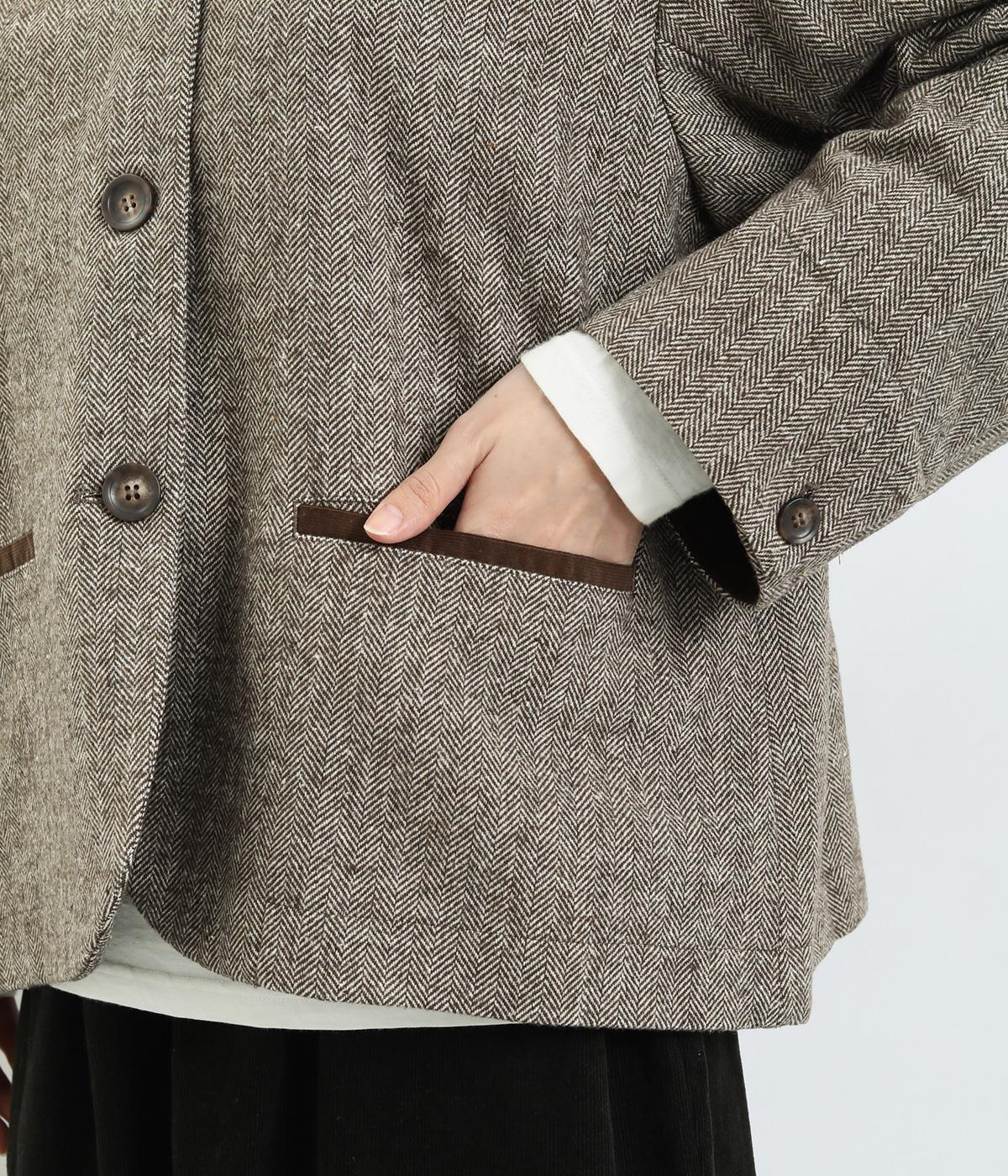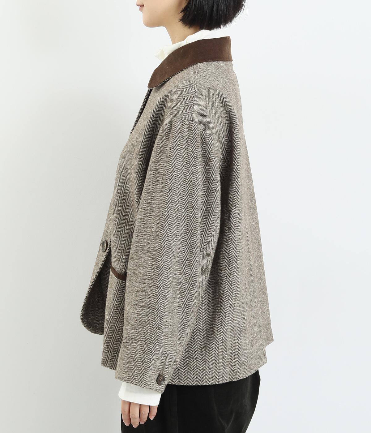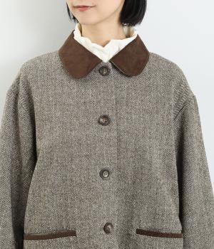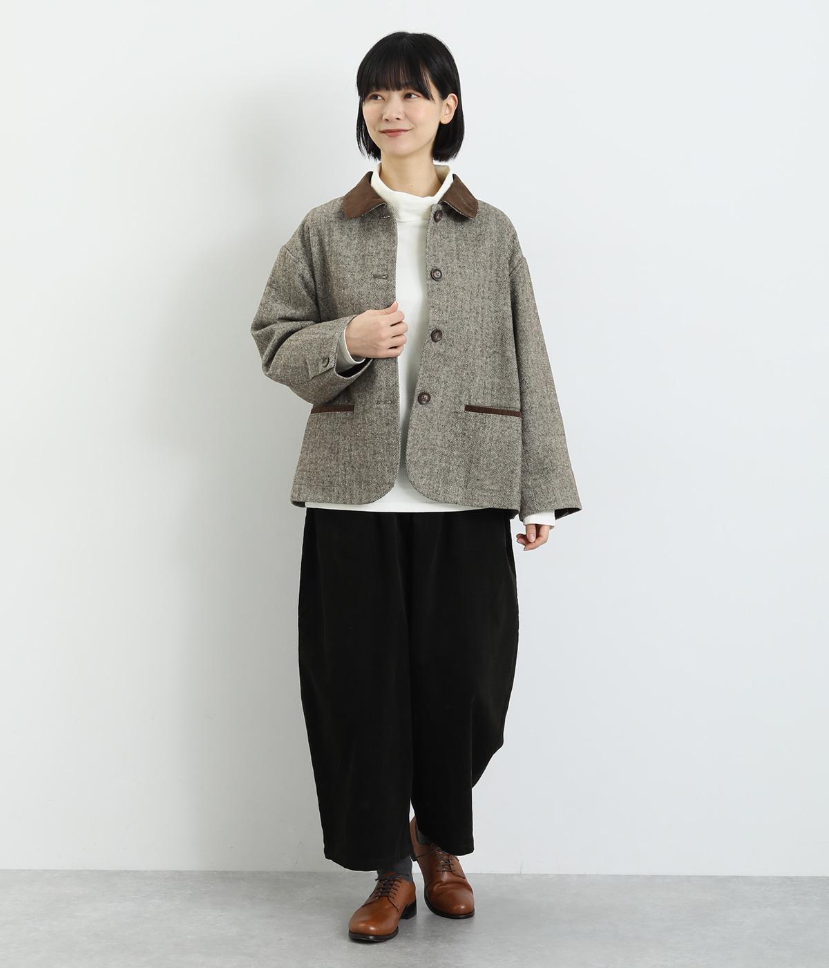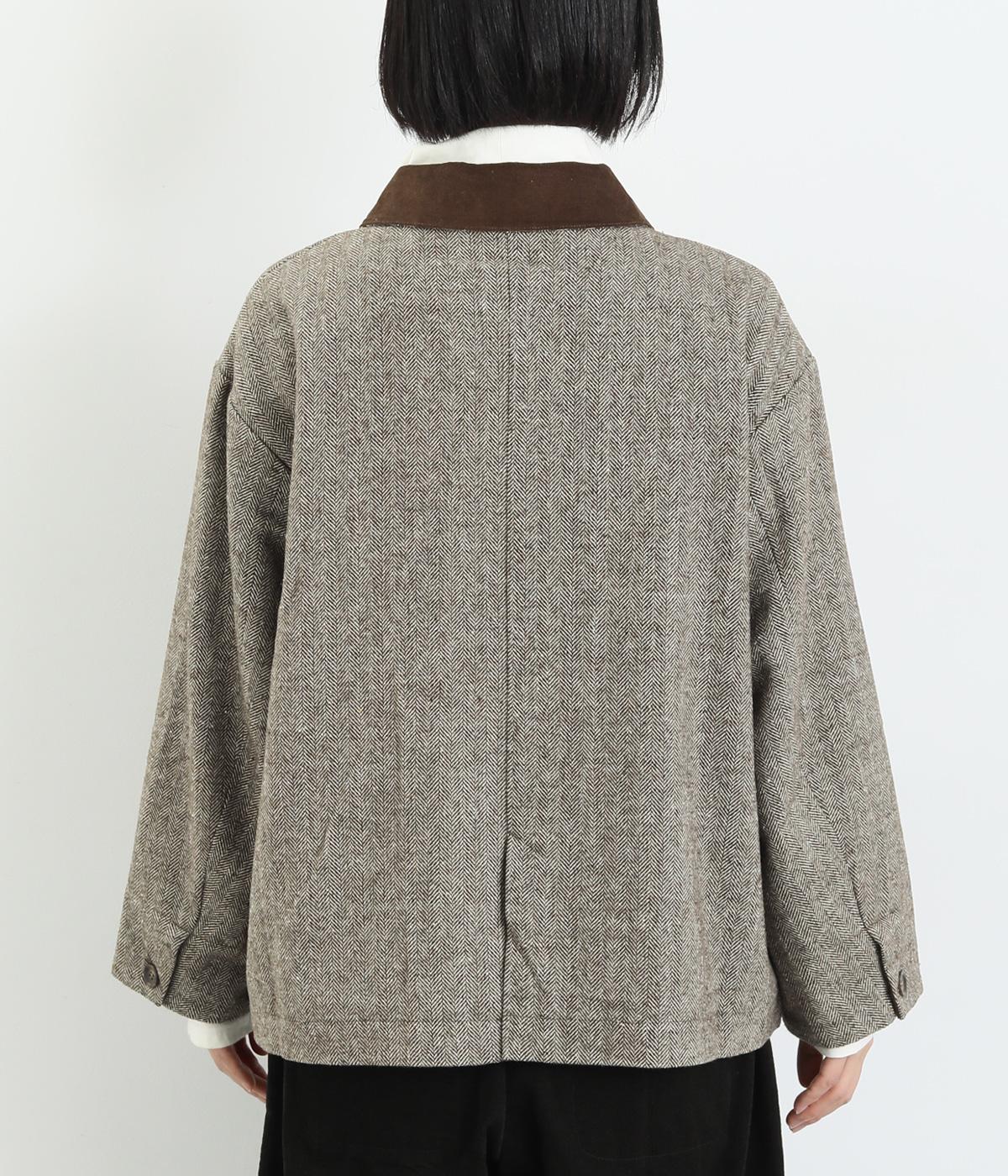 肌触りのなめらかなヘリンボーン生地と襟元のコーデュロイの異素材使いがポイントです。ポリエステルの裏地付きで、着脱もスムーズ。ほどよい厚みとマットな見た目がとても上品な素材感です。