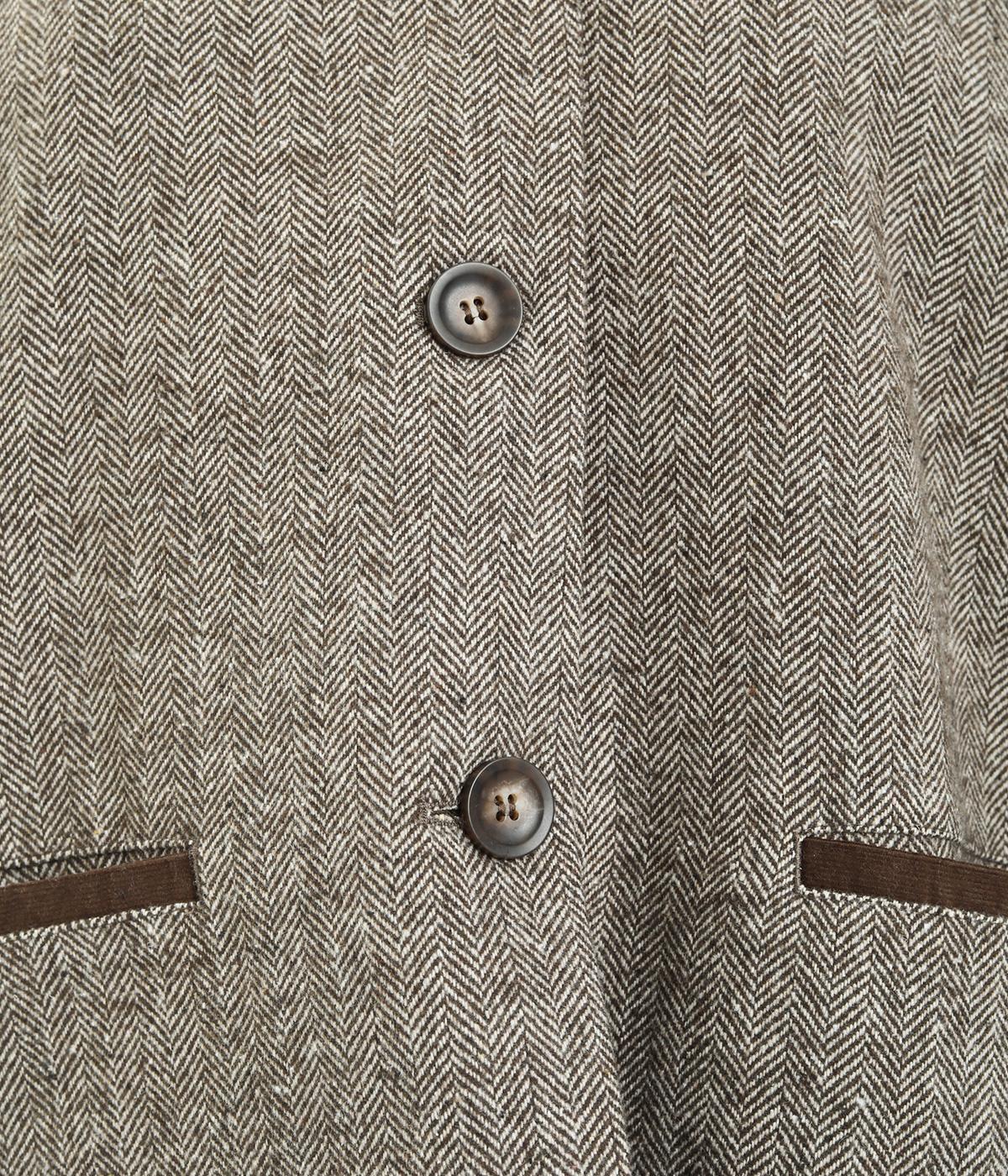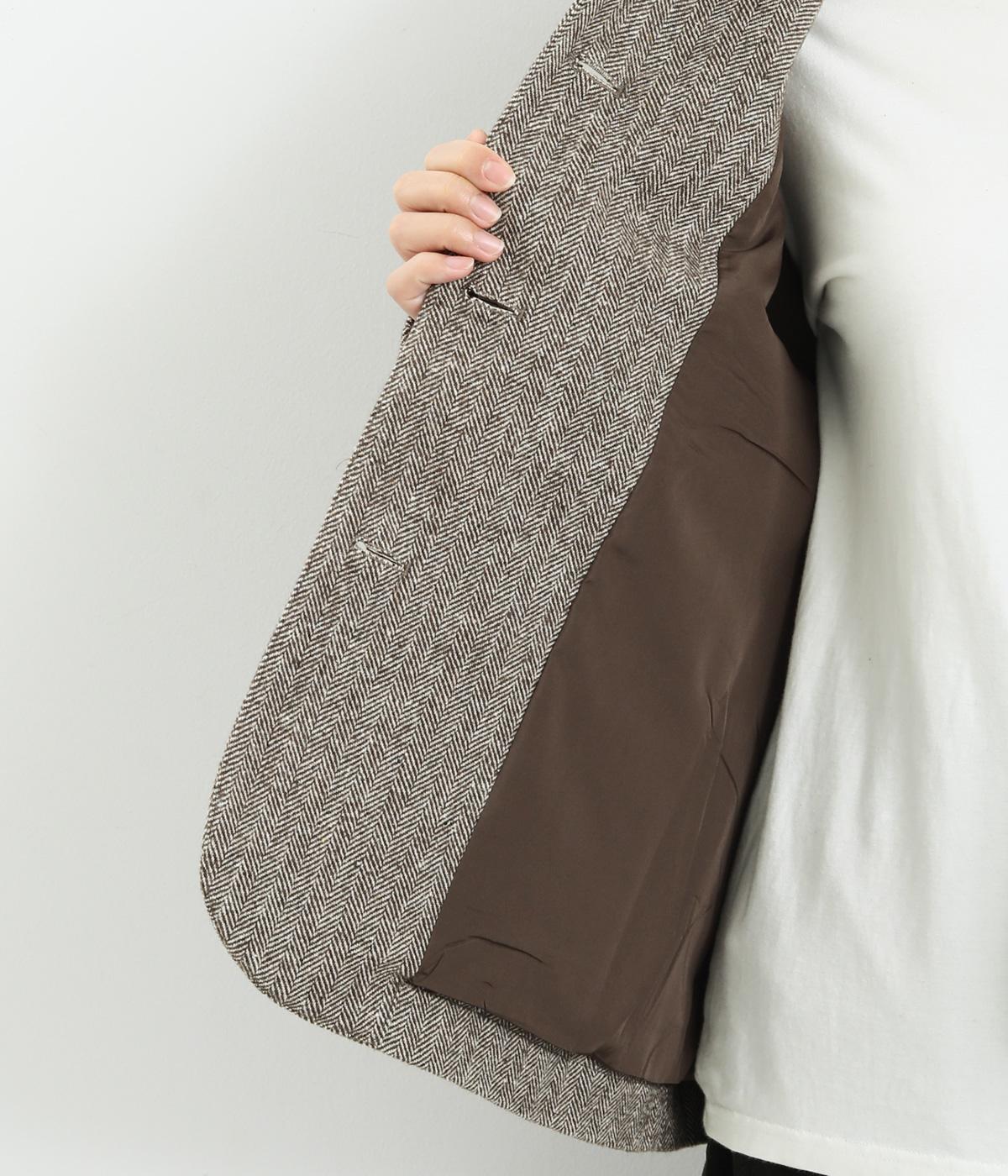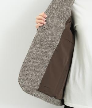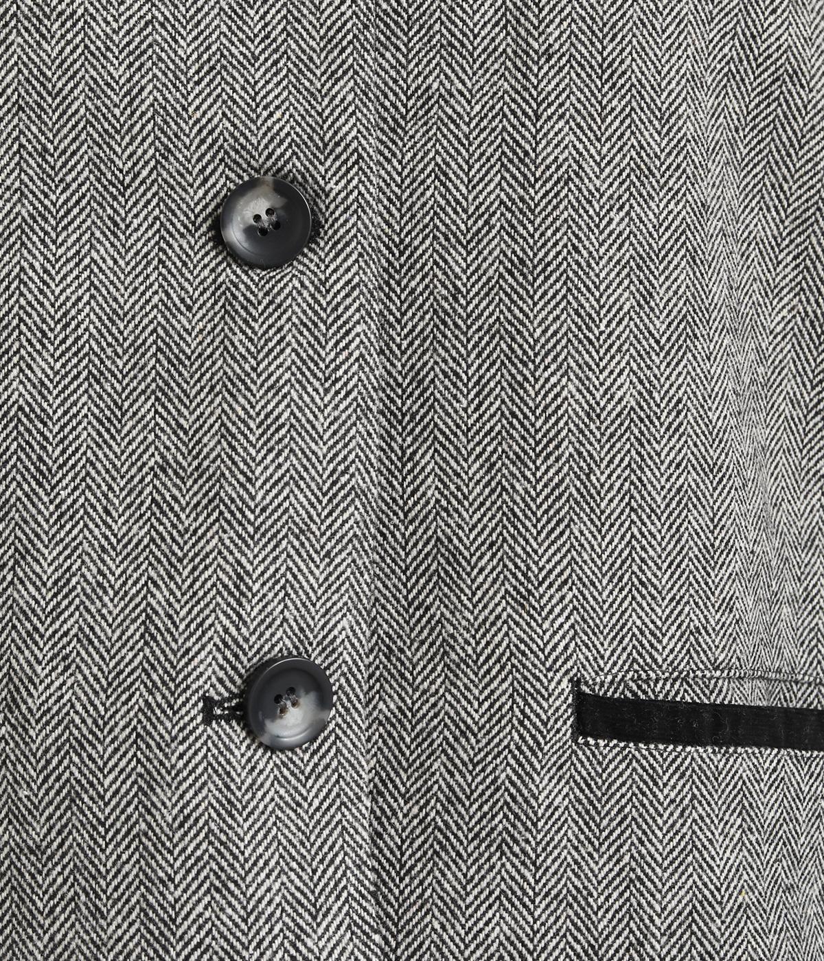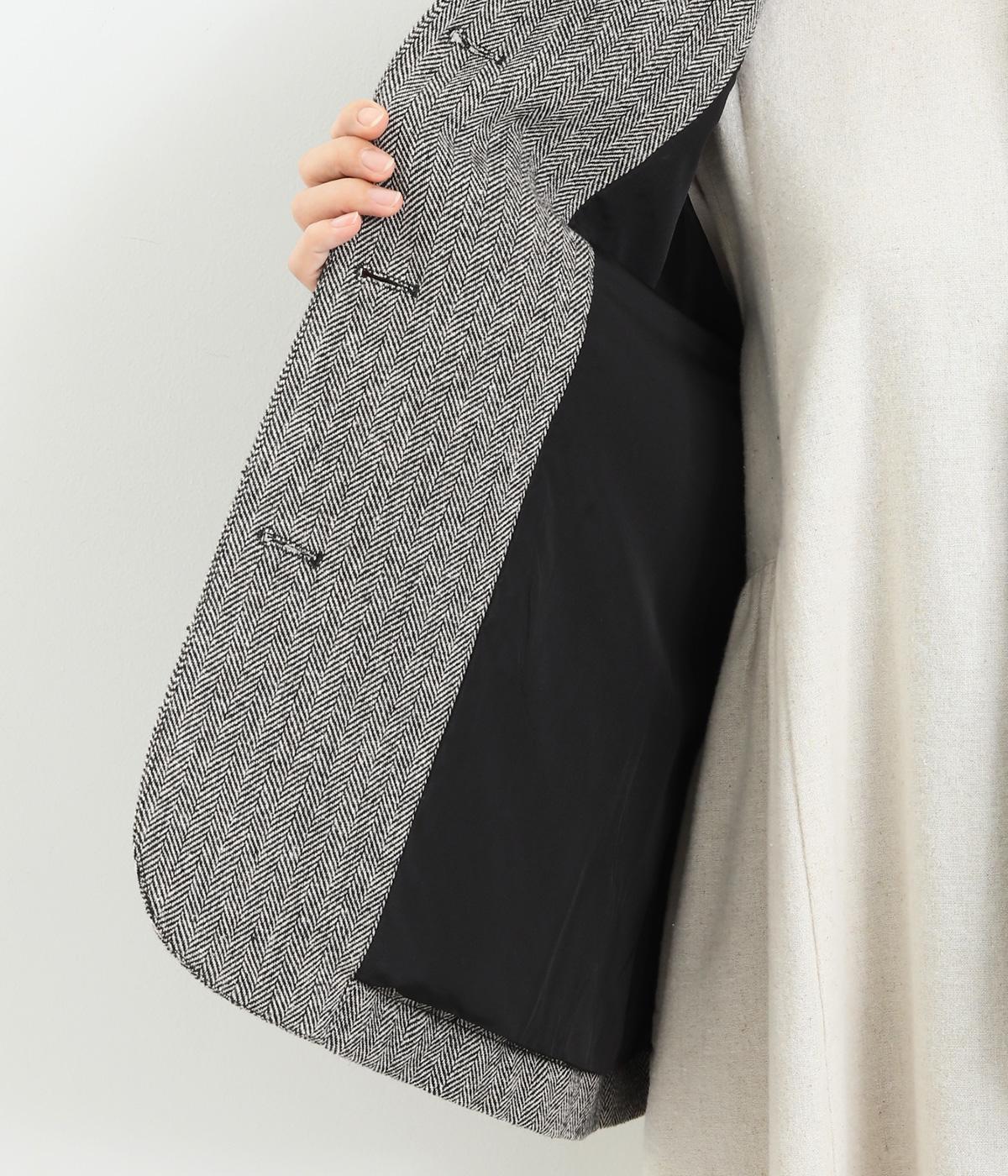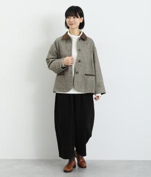 肌触りのなめらかなヘリンボーン生地と襟元のコーデュロイの異素材使いがポイントです。ポリエステルの裏地付きで、着脱もスムーズ。ほどよい厚みとマットな見た目がとても上品な素材感です。