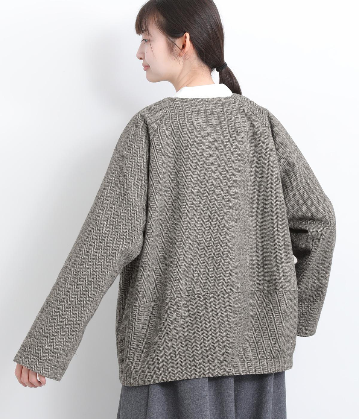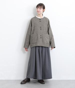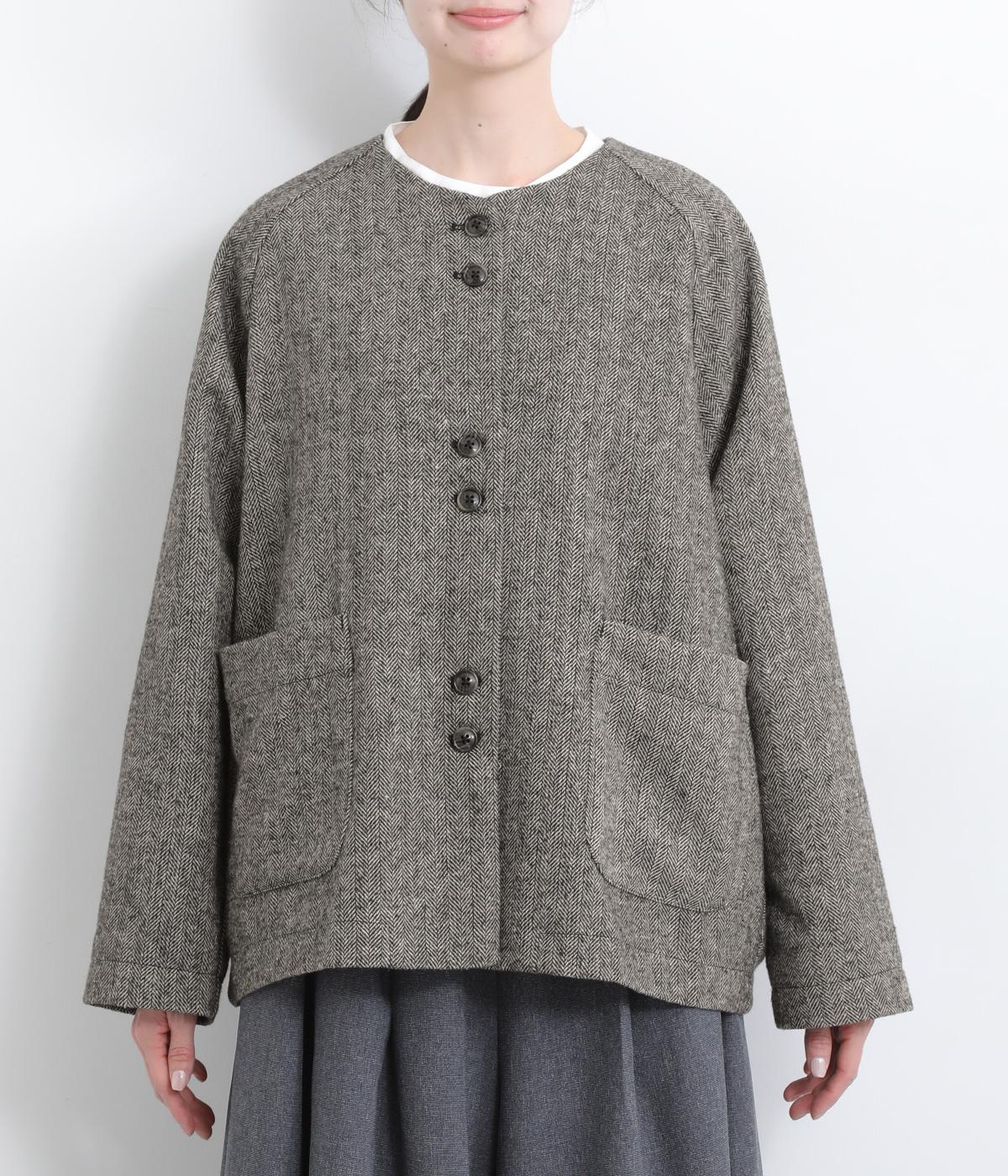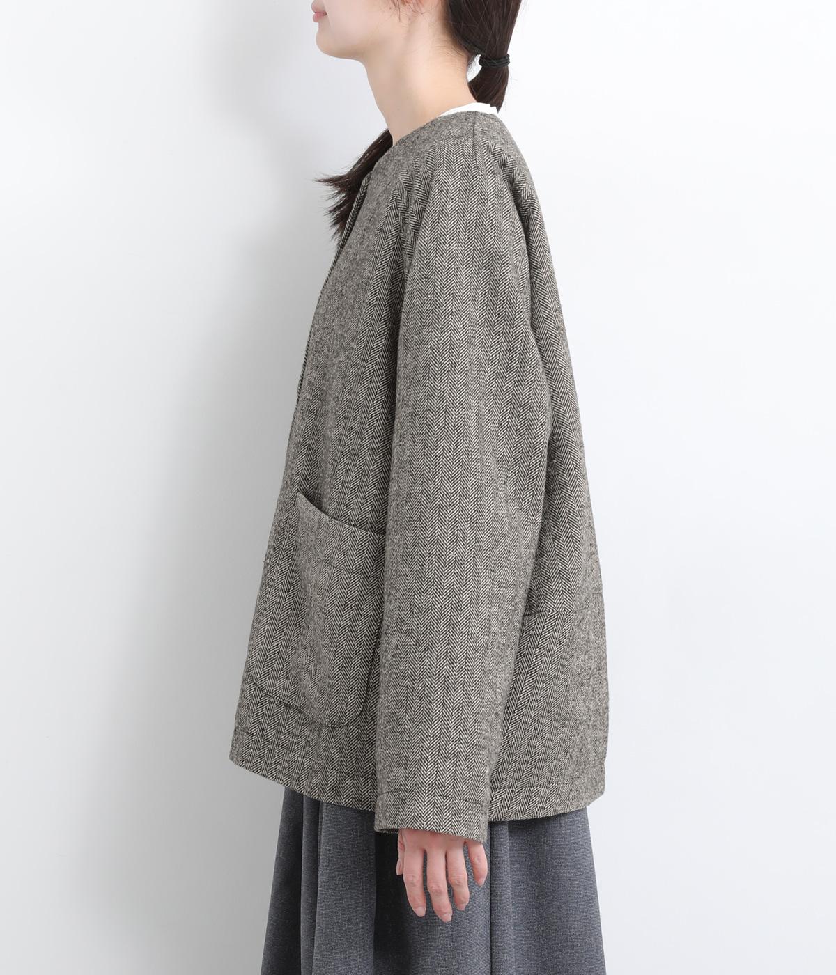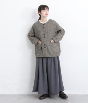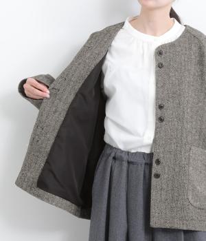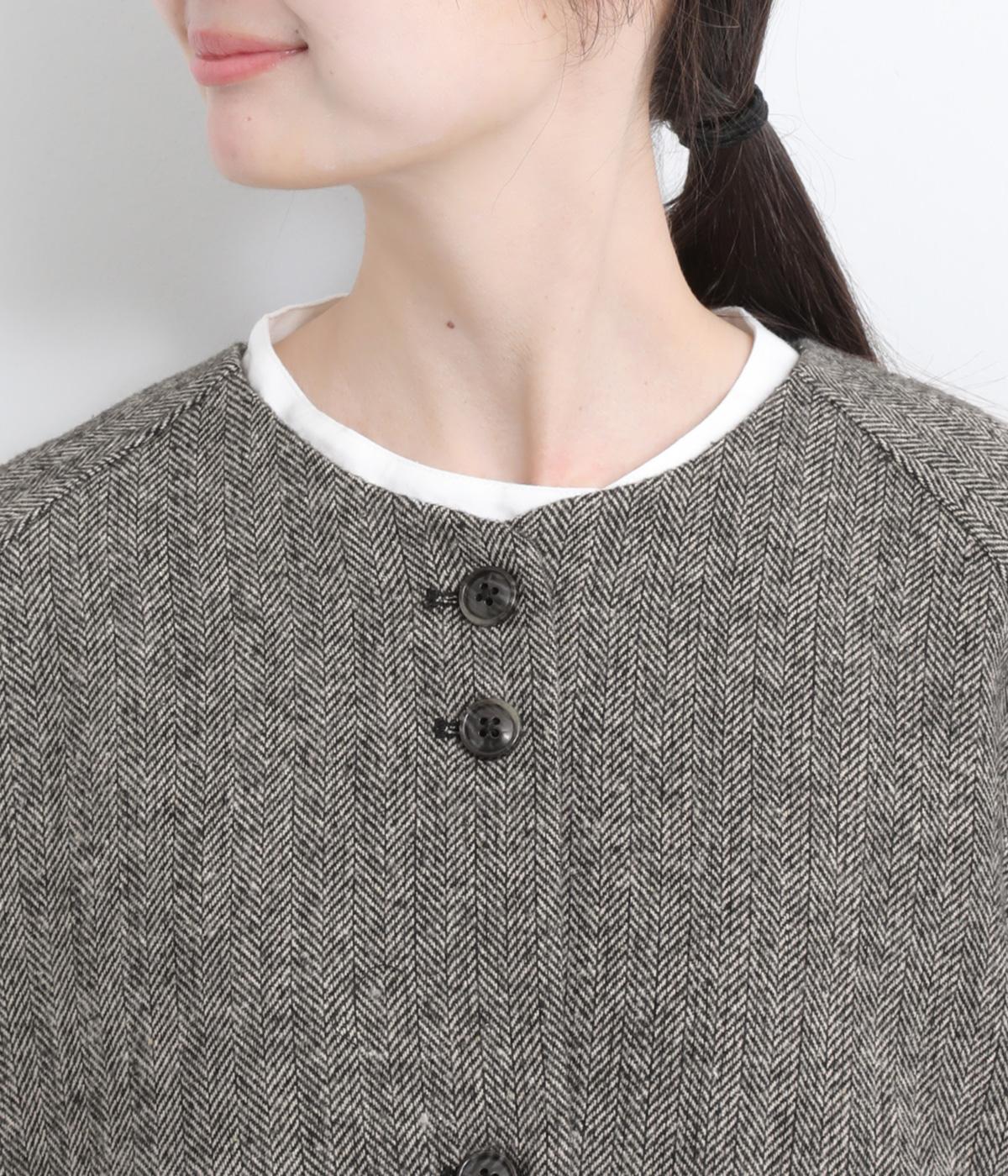 上品でクラシックな印象のヘリンボーン柄でジャケットを仕立てました。ふたつずつ並んだボタンがさりげない個性を添えます。ノーカラーの首元はさまざまなインナーや巻き物と相性がよく、スタイリングを楽しめます。