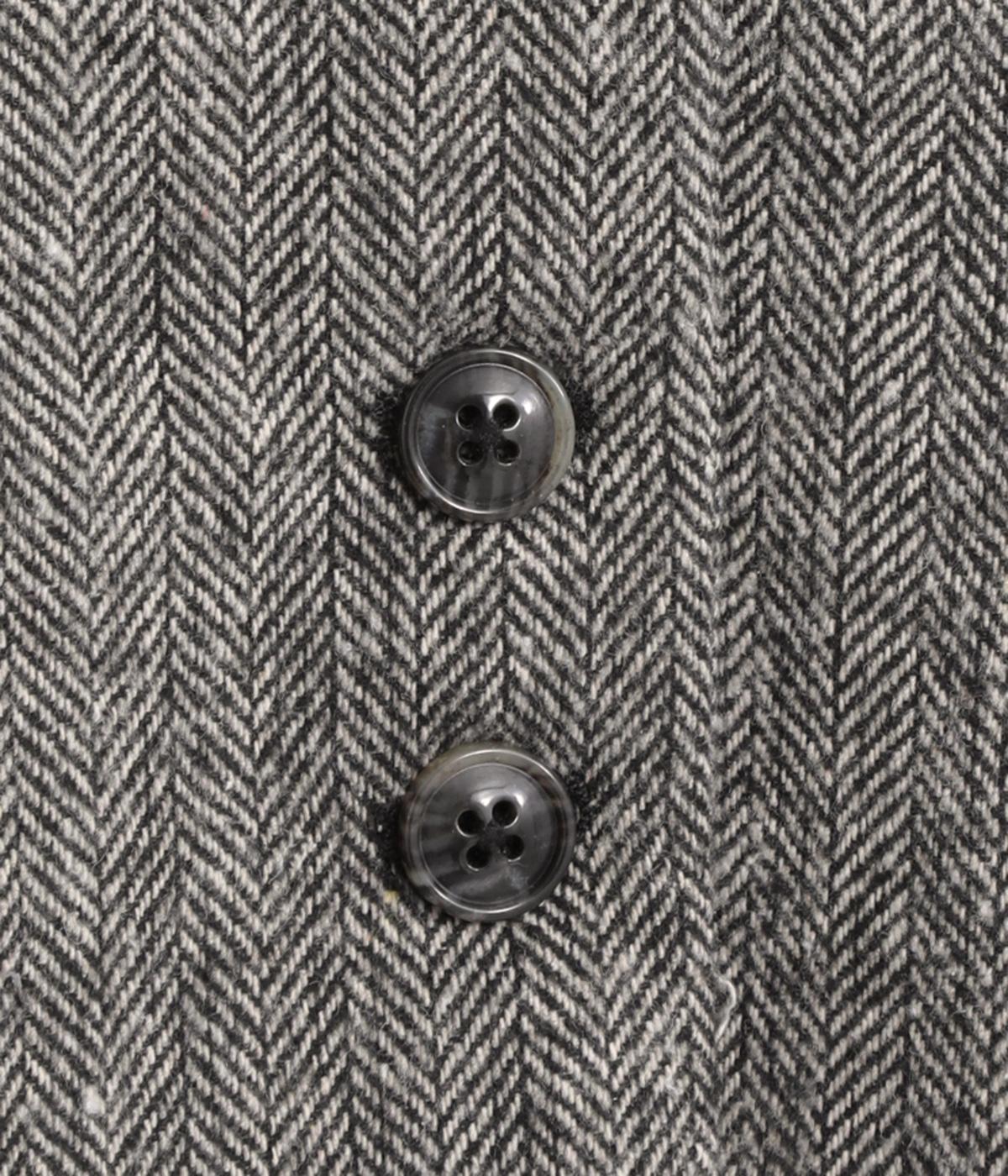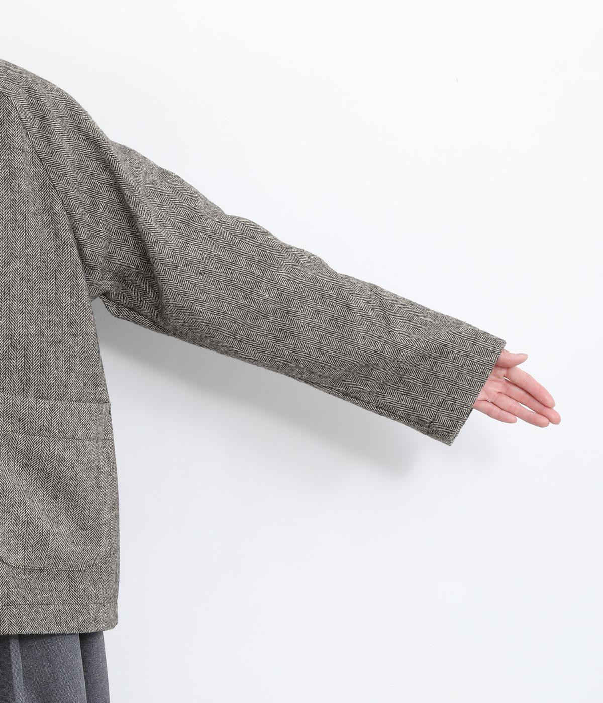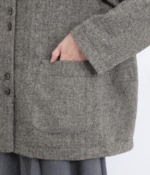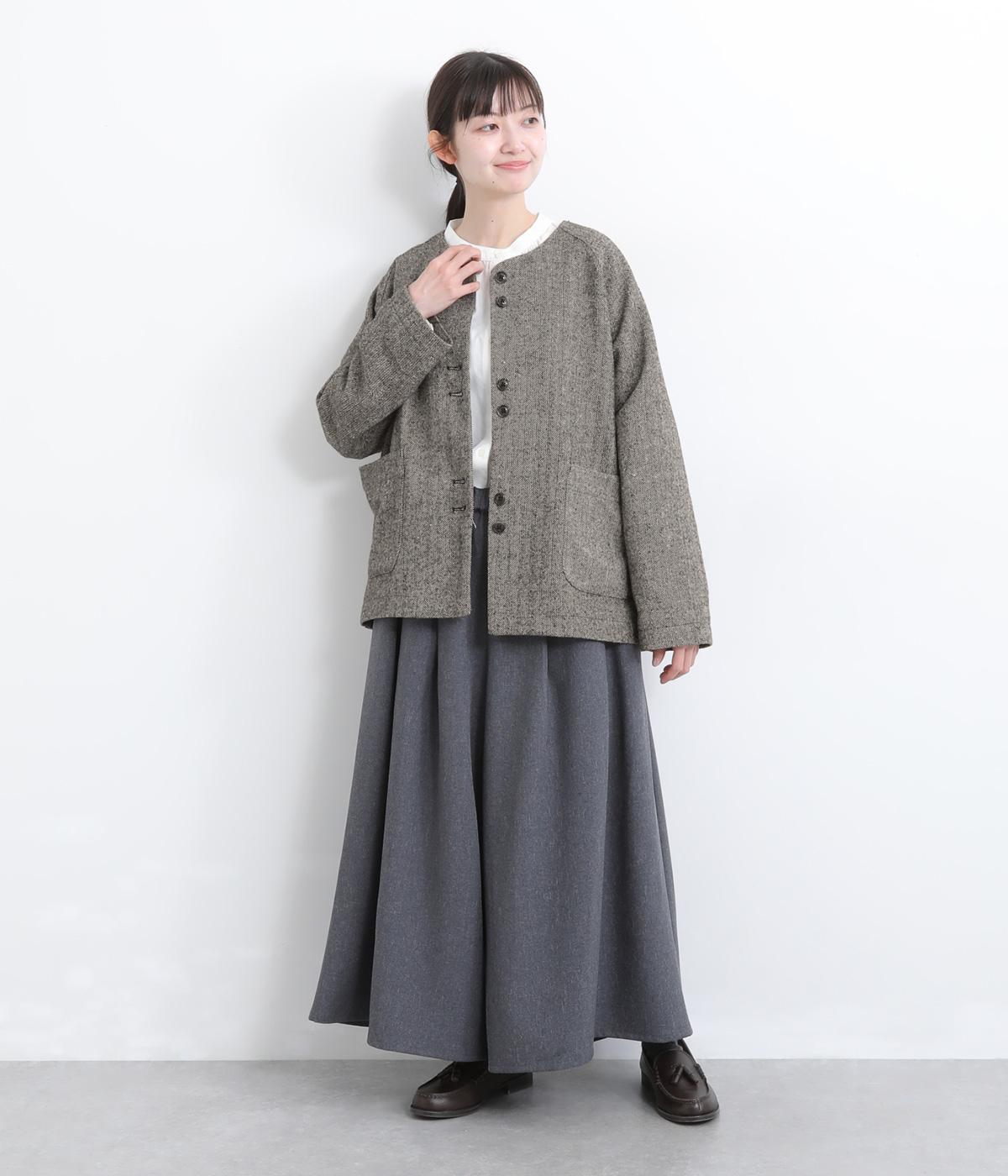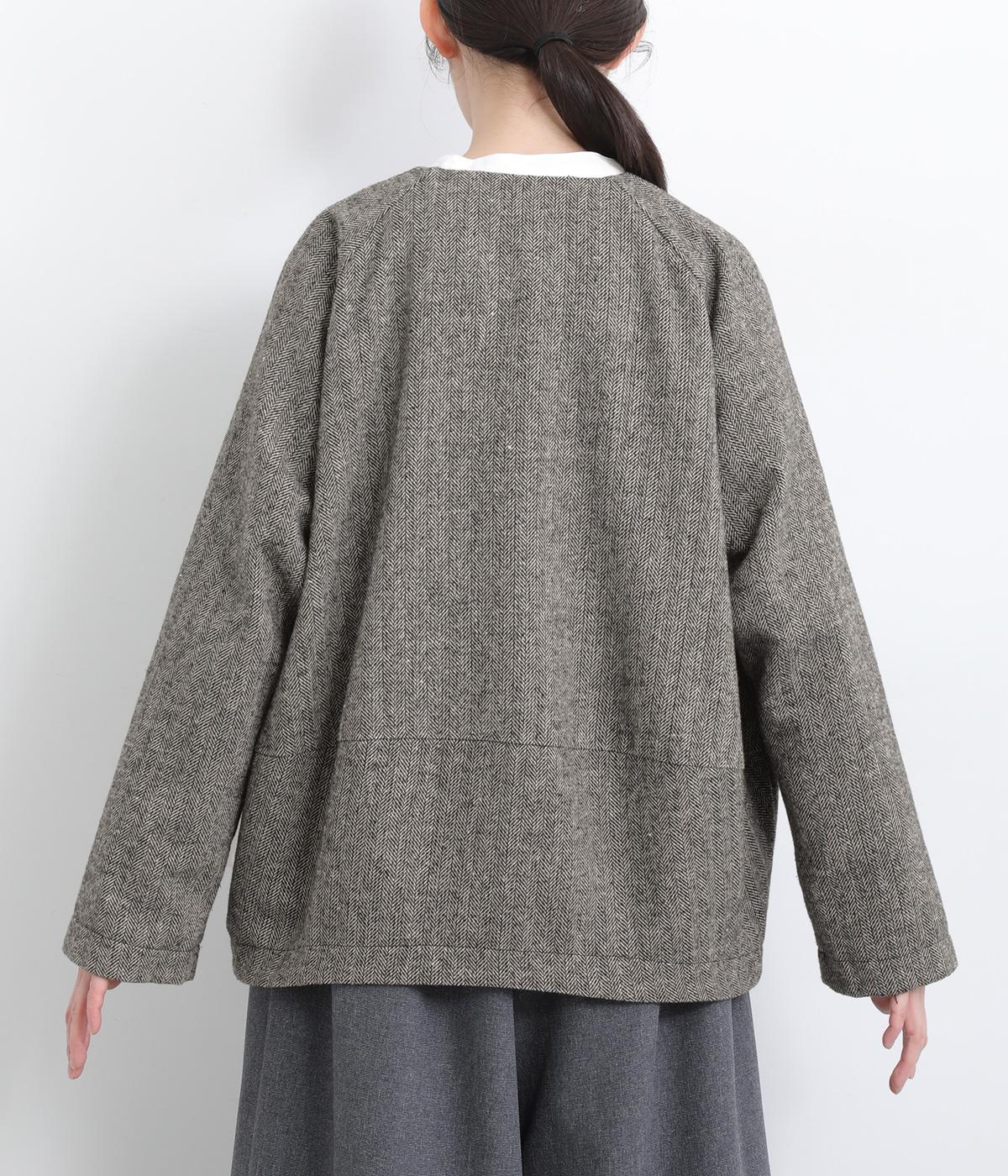 上品でクラシックな印象のヘリンボーン柄でジャケットを仕立てました。ふたつずつ並んだボタンがさりげない個性を添えます。ノーカラーの首元はさまざまなインナーや巻き物と相性がよく、スタイリングを楽しめます。