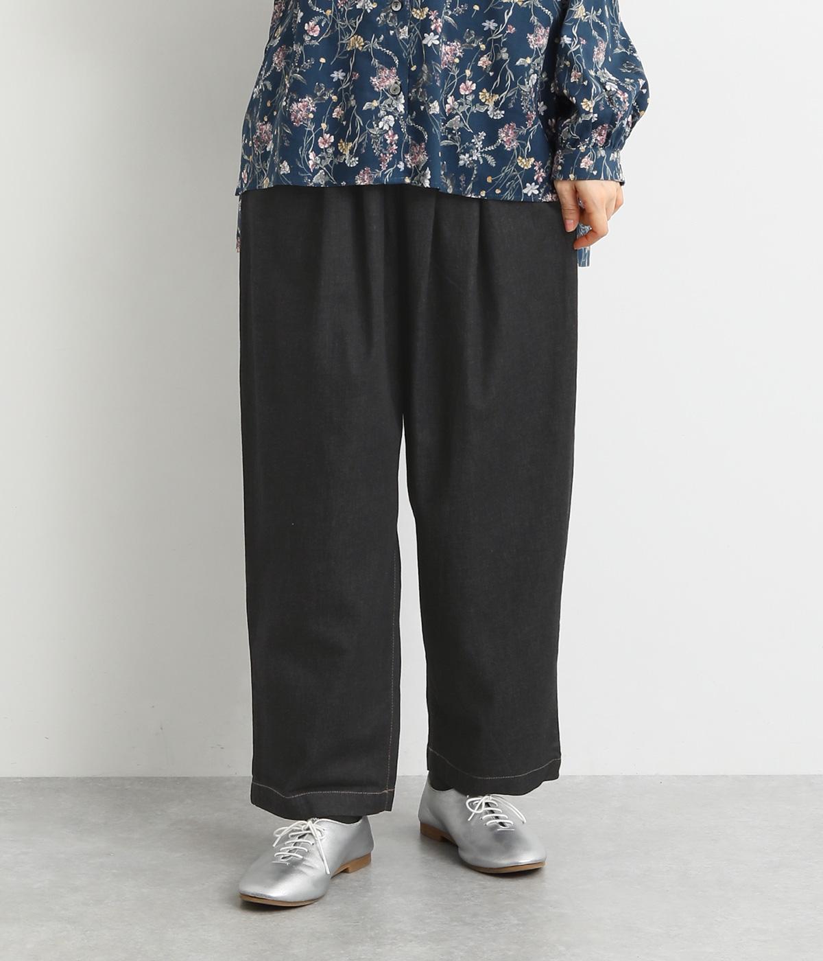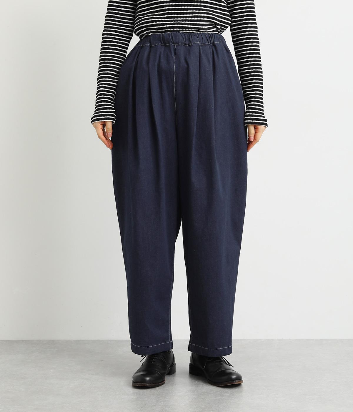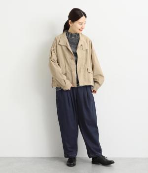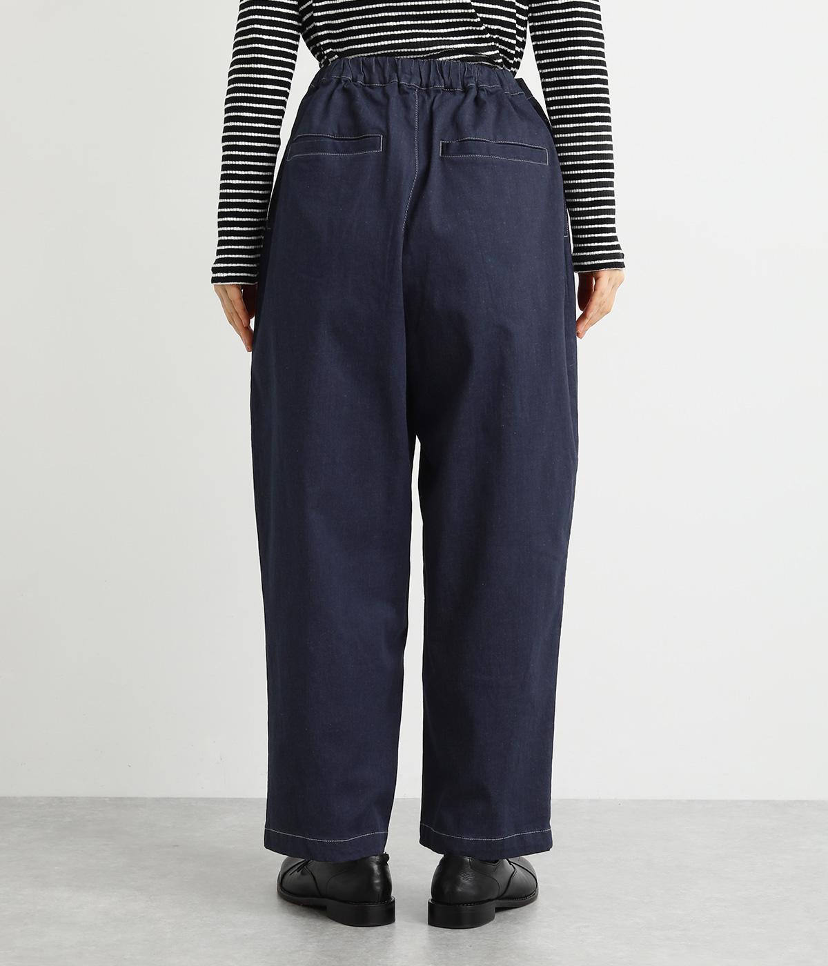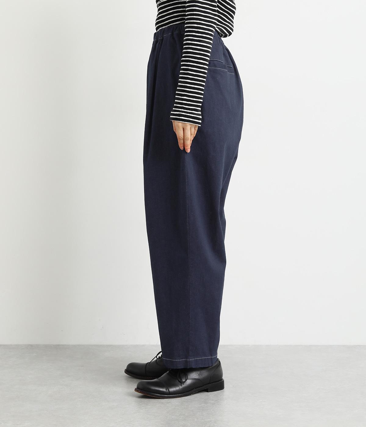 タック入りの緩やかなテーパードで、すっきりとした印象に。ウエストは総ゴムで紐で調節が可能です。バックポケットもさりげないアクセントになっています。動きやすく快適で、日常に寄り添う一本です。